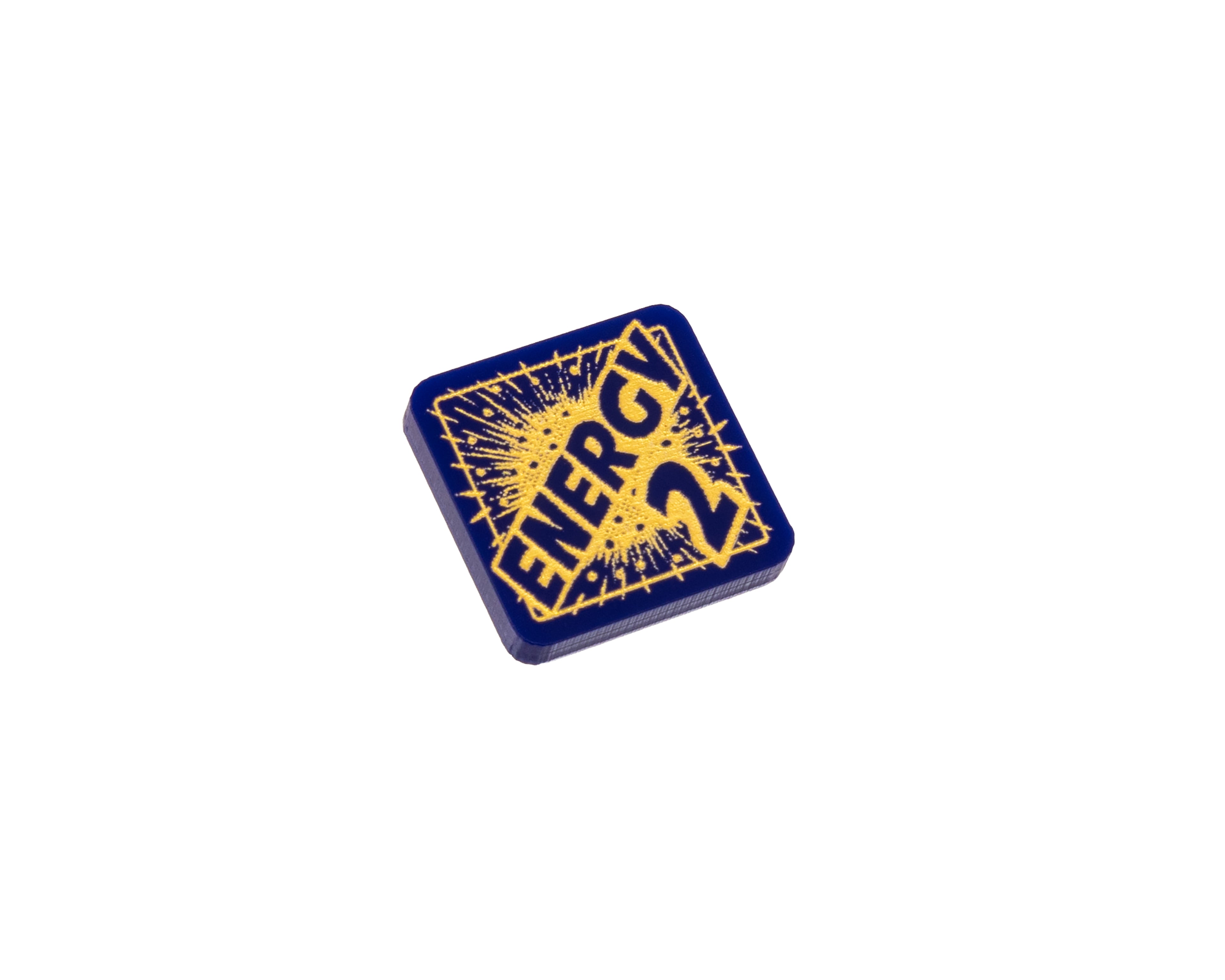 - 3 x Energy Tokens, etched and cut from opaque navy blue acrylic, painted gold on both sides and measuring 18mm x 18mm.
