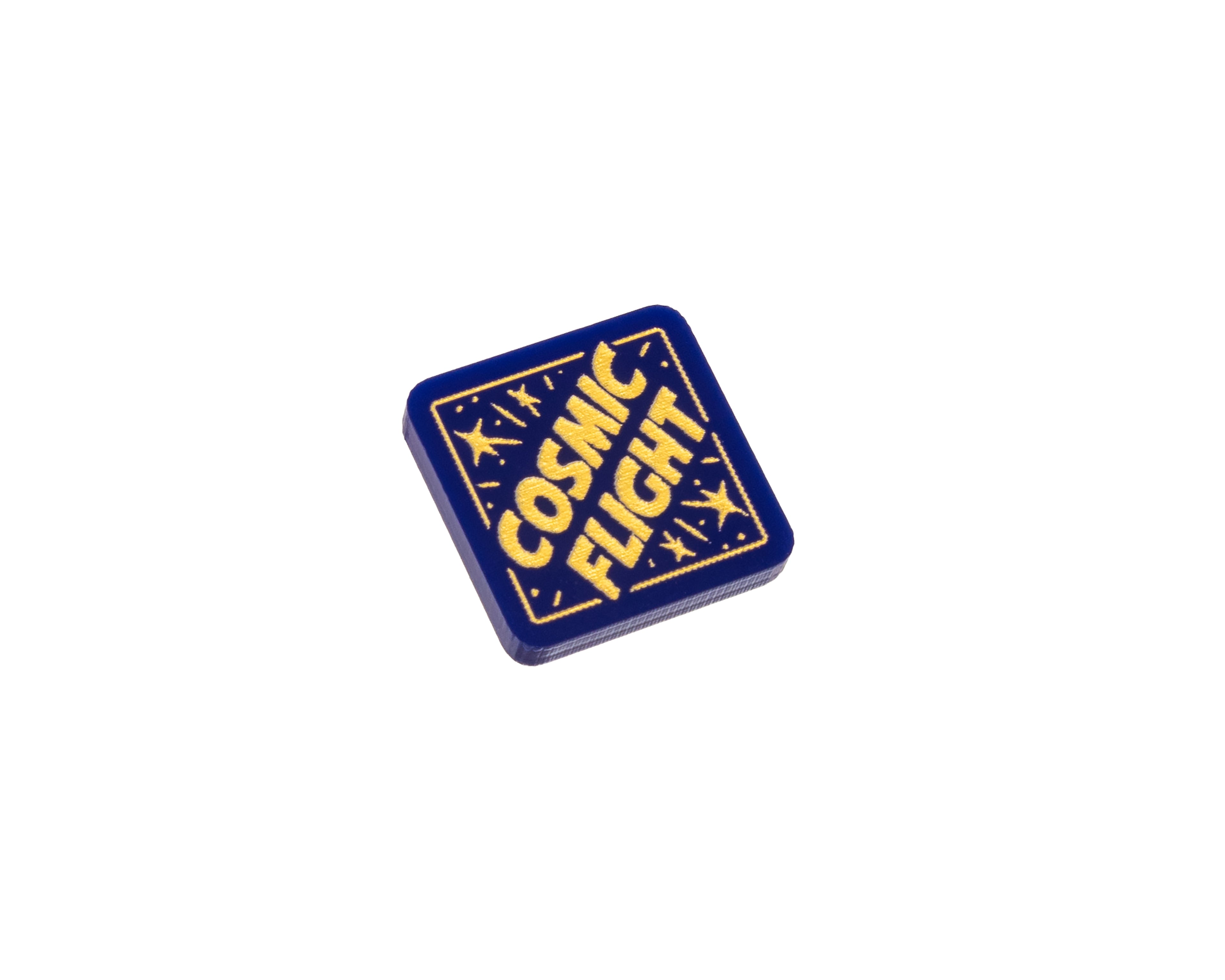 - 1 x Cosmic Flight Token, etched and cut from opaque navy blue acrylic, painted gold on both sides and measuring 18mm x 18mm.