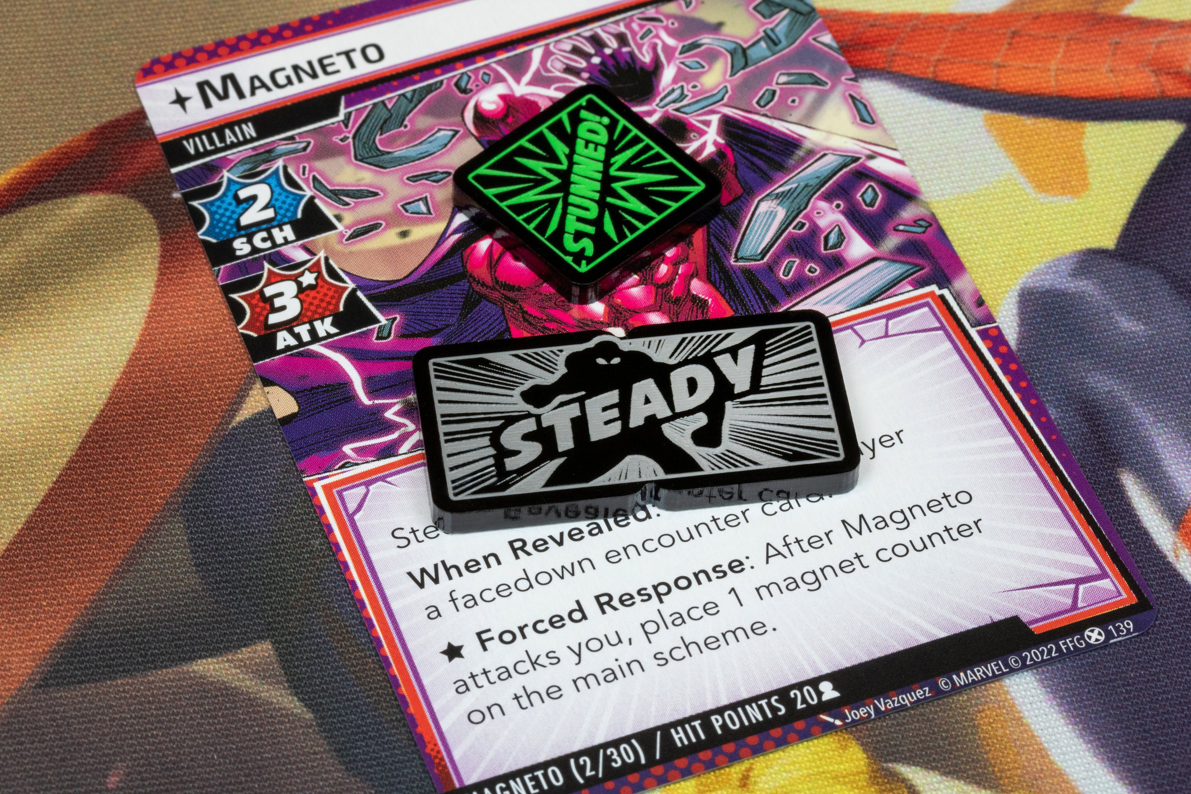 Double the size of the standard sized Marvel Champions tokens, these larger Steady tokens help to provide an additional reminder for players to place 2 x stunned and/or confused tokens to a card before the effects of those conditions trigger.