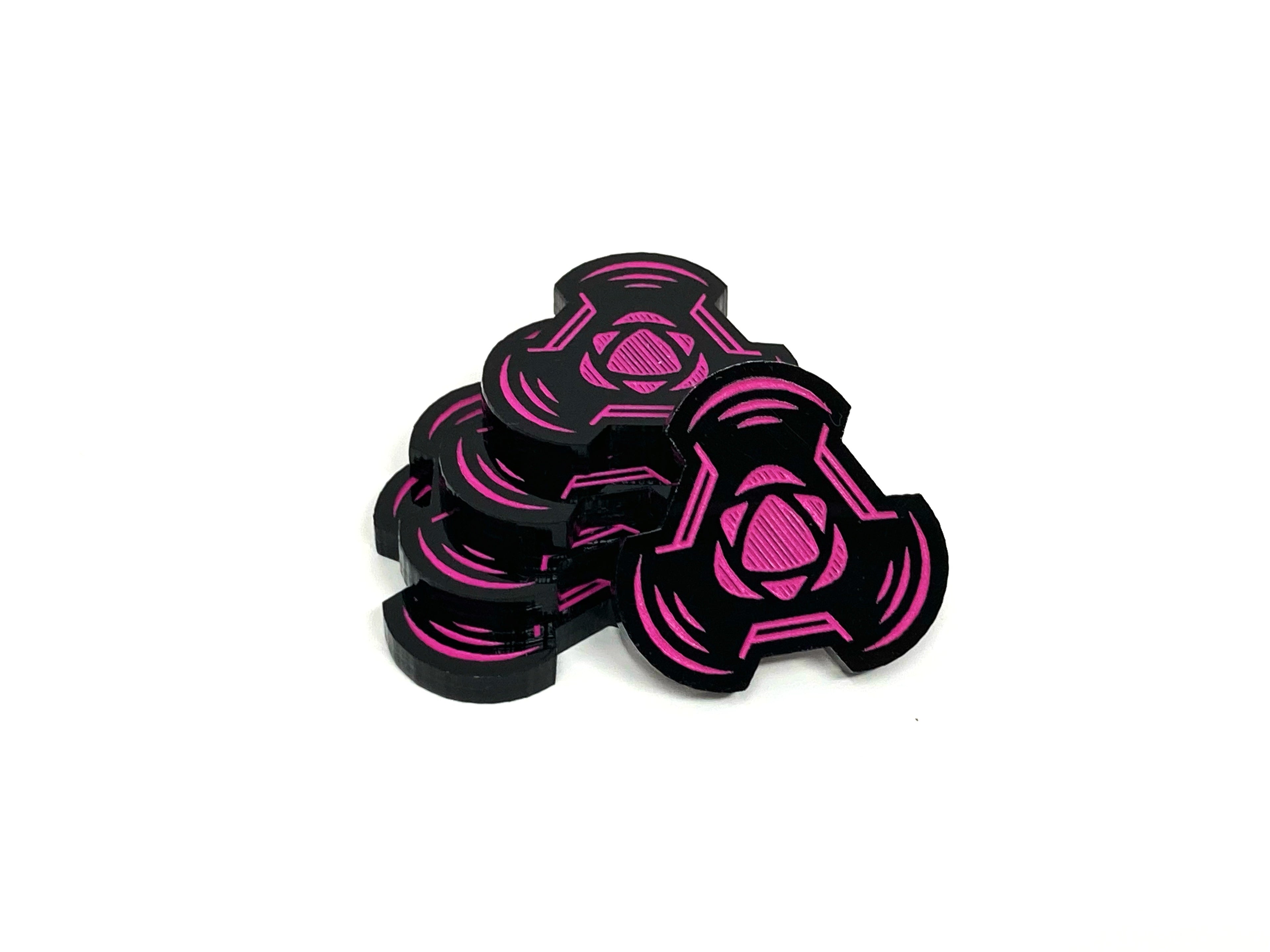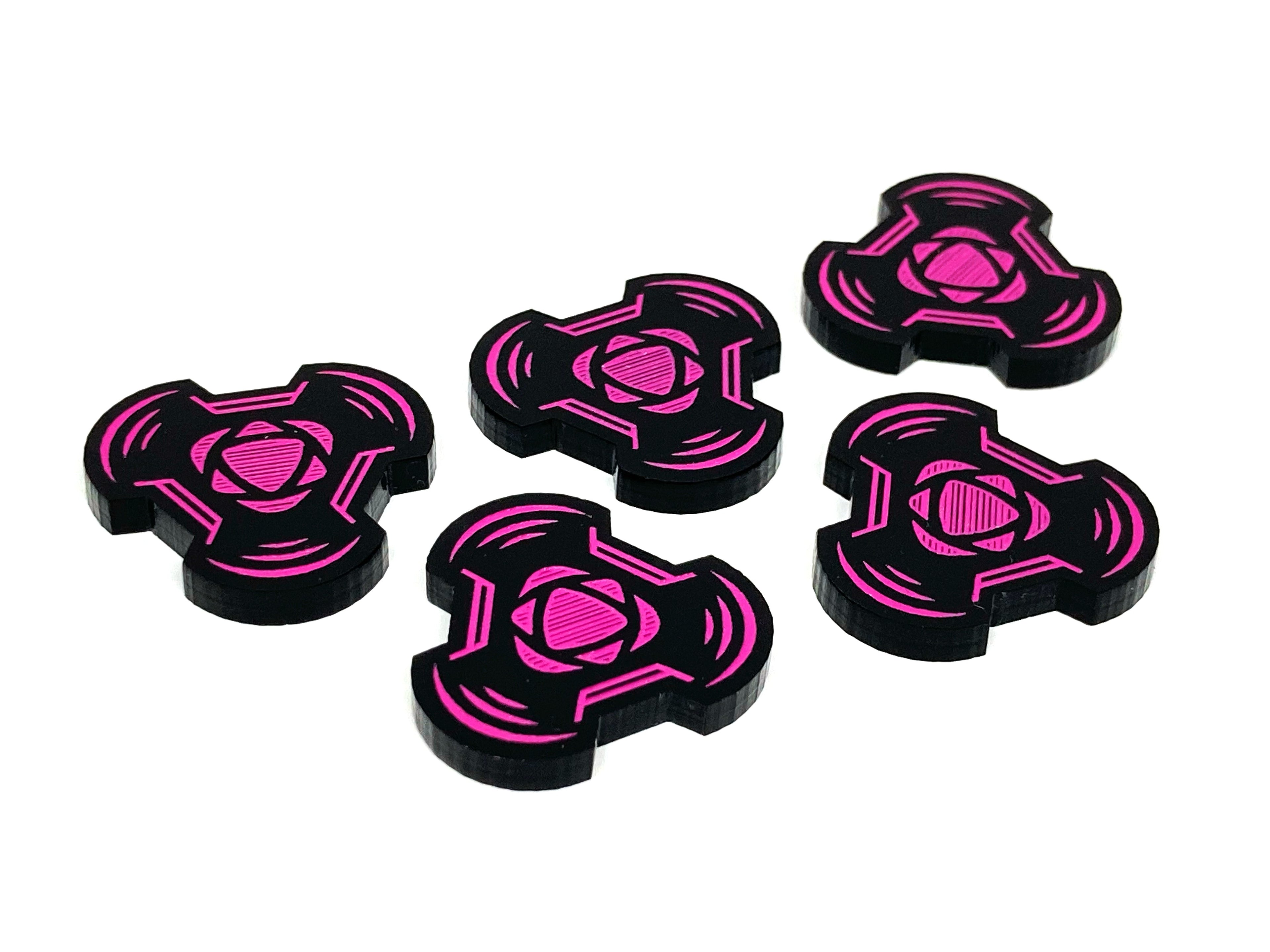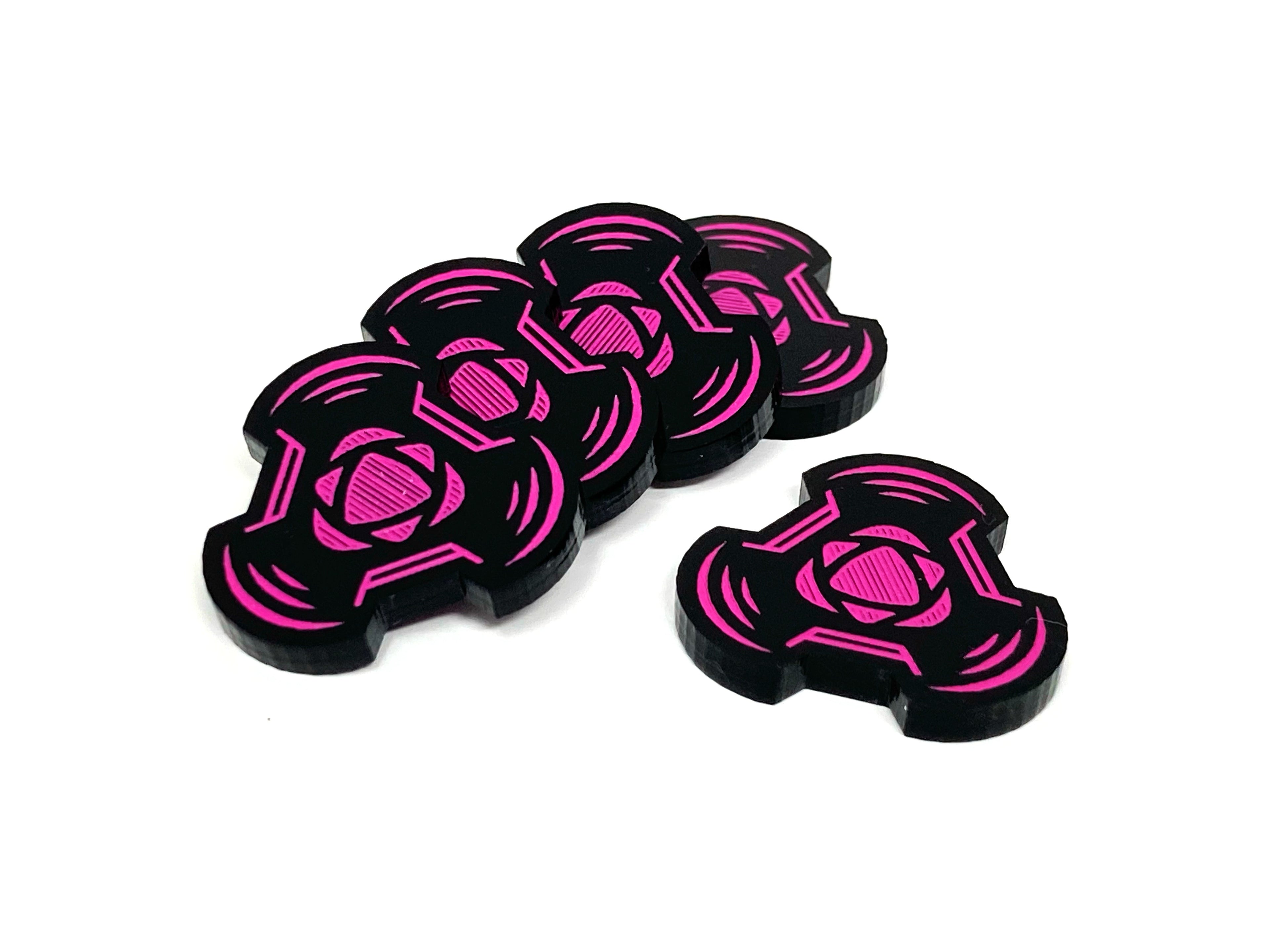 5 x Energy tokens, laser etched and cut from 3mm opaque black acrylic and painted magenta on both sides, measuring approximately 22mm x 22mm.