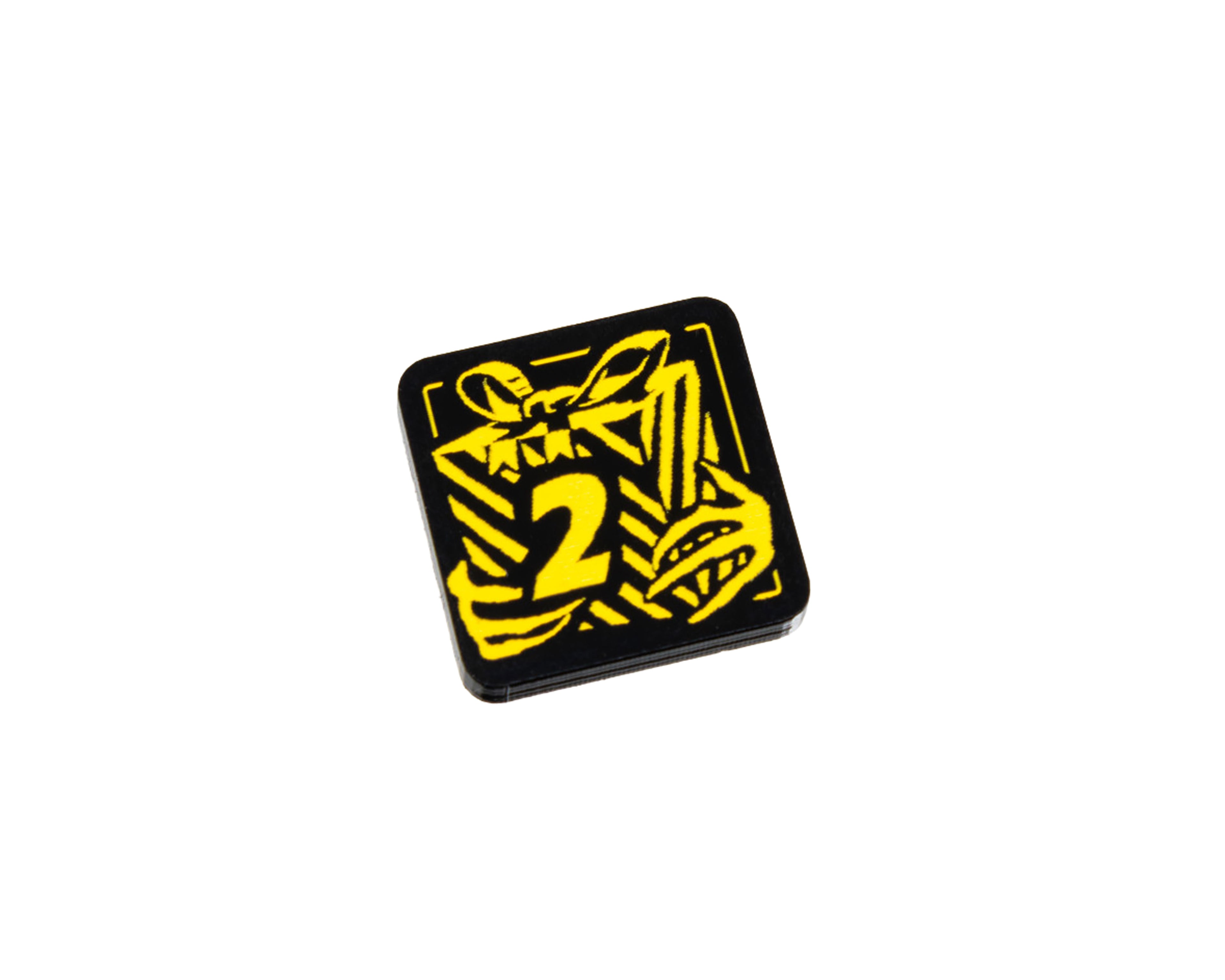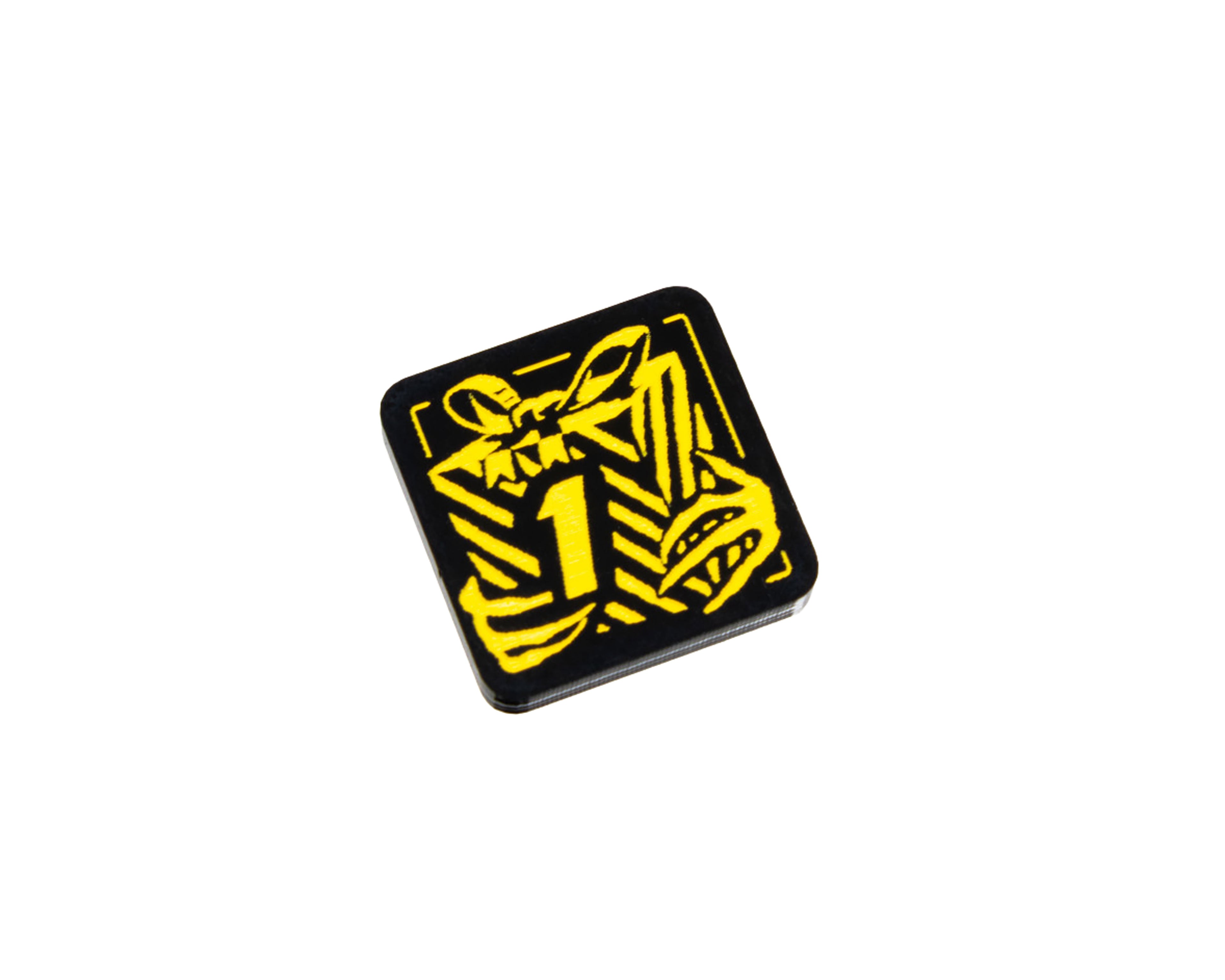- 2 x Festive Mojo Threat Tokens, etched and cut from 3mm black opaque acrylic, painted yellow on both sides and measuring 18mm x 18mm.