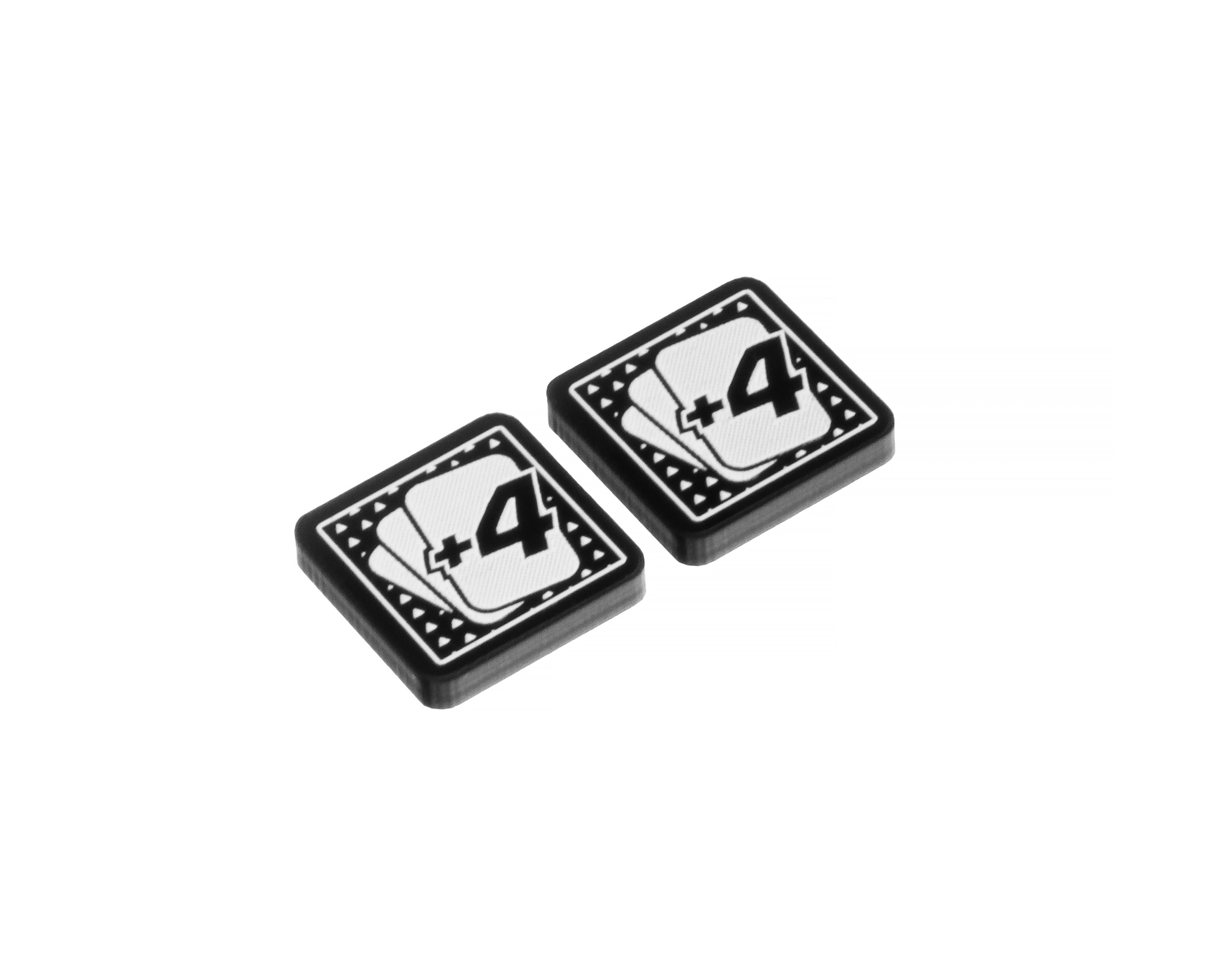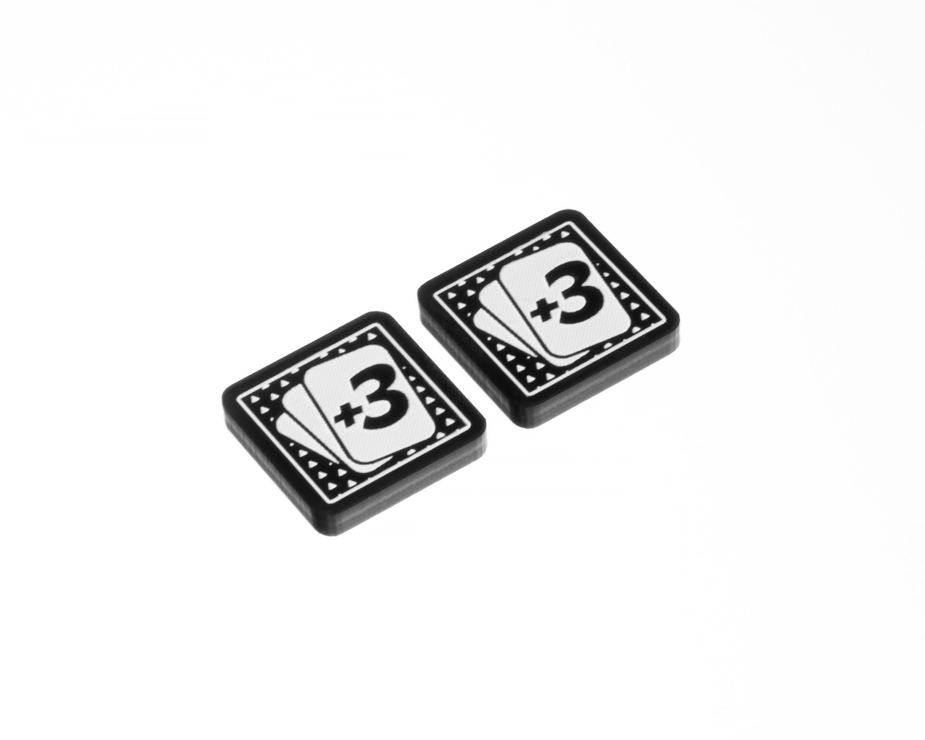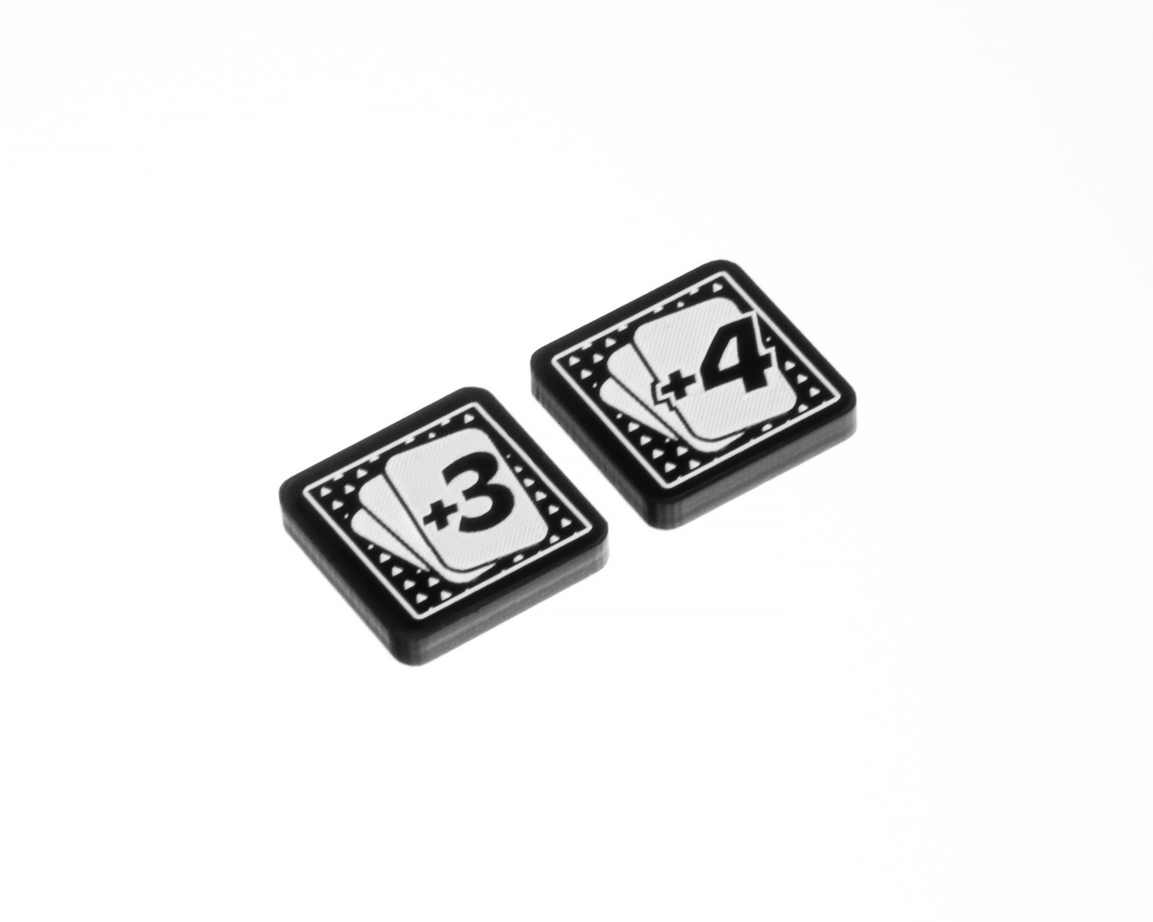 - 2 x Hand Limit Tokens +3/+4, double sided, etched and cut from black acrylic and painted white on both sides. Measuring 18mm x 18mm.
