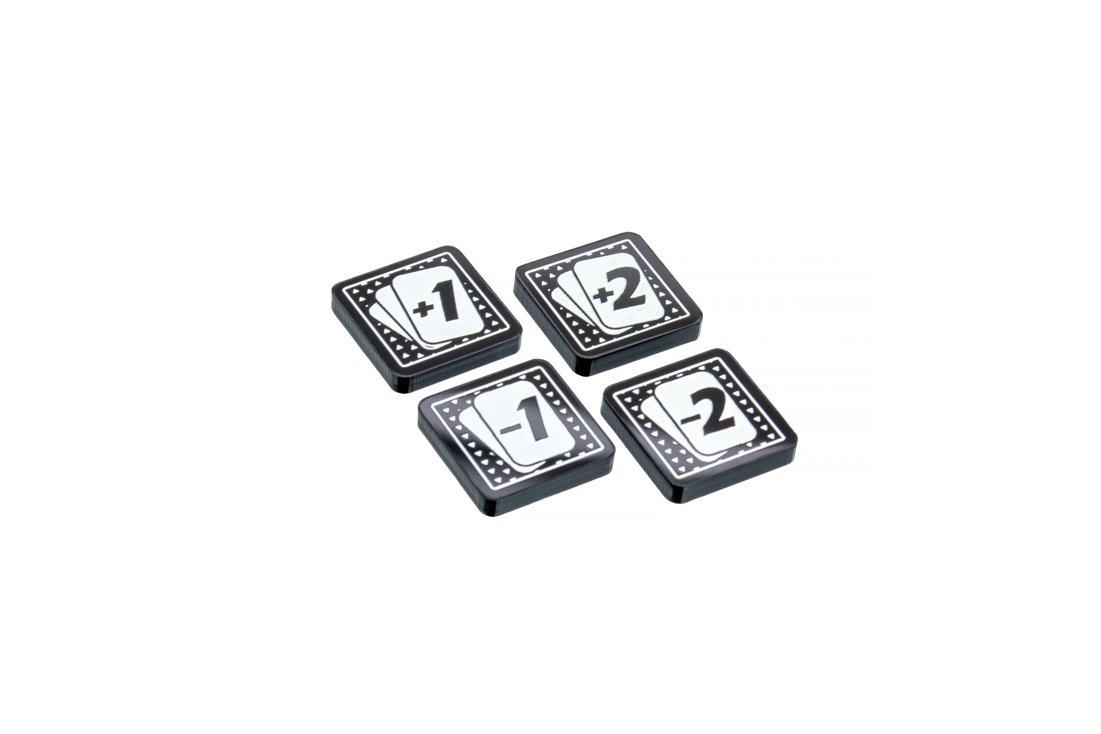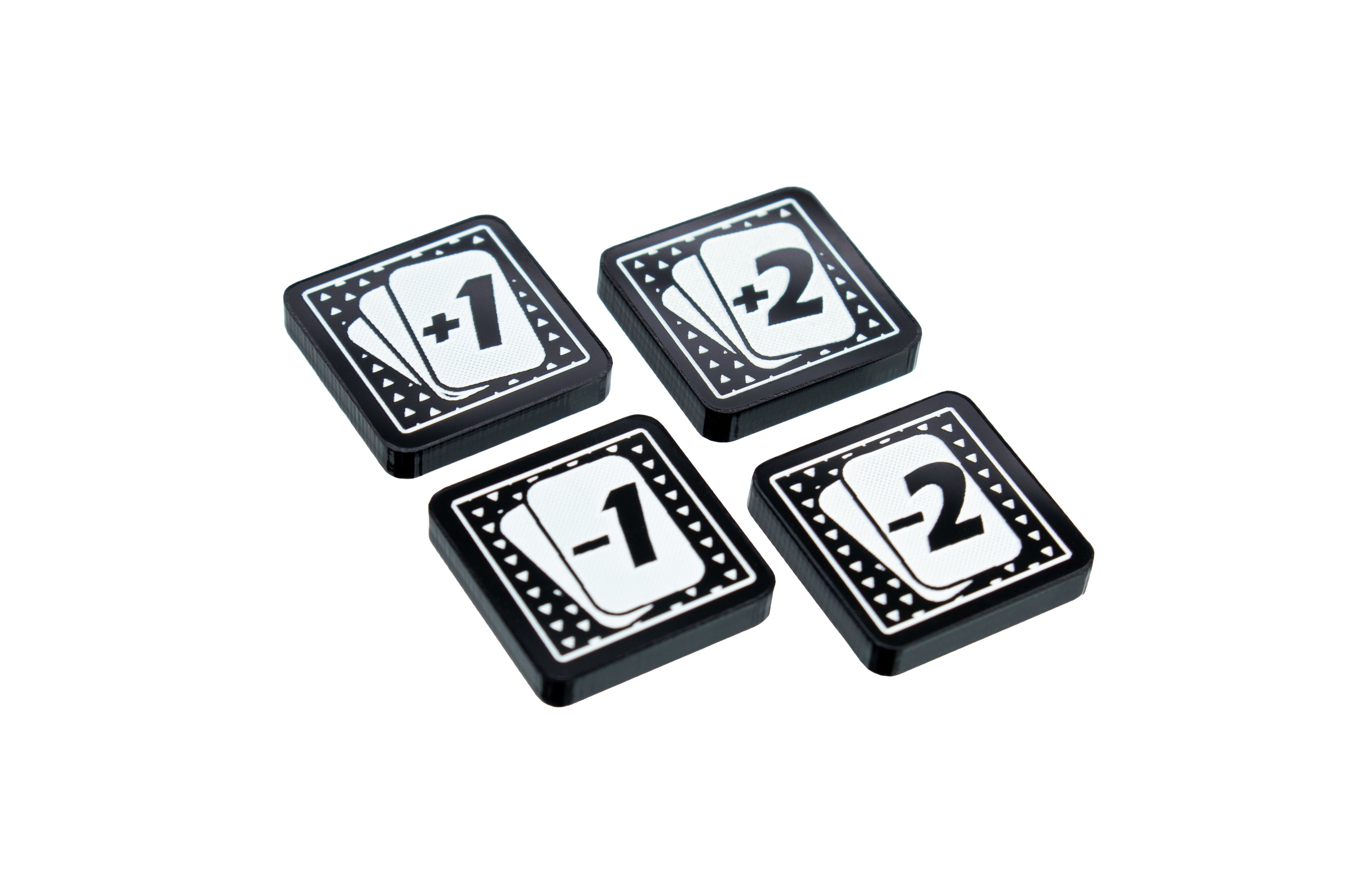 - 4 x Hand Limit Tokens (2 x +1/+2, 2 x -1/-2), Etched and cut from black acrylic and painted white on both sides. Measuring 18mm x 18mm.