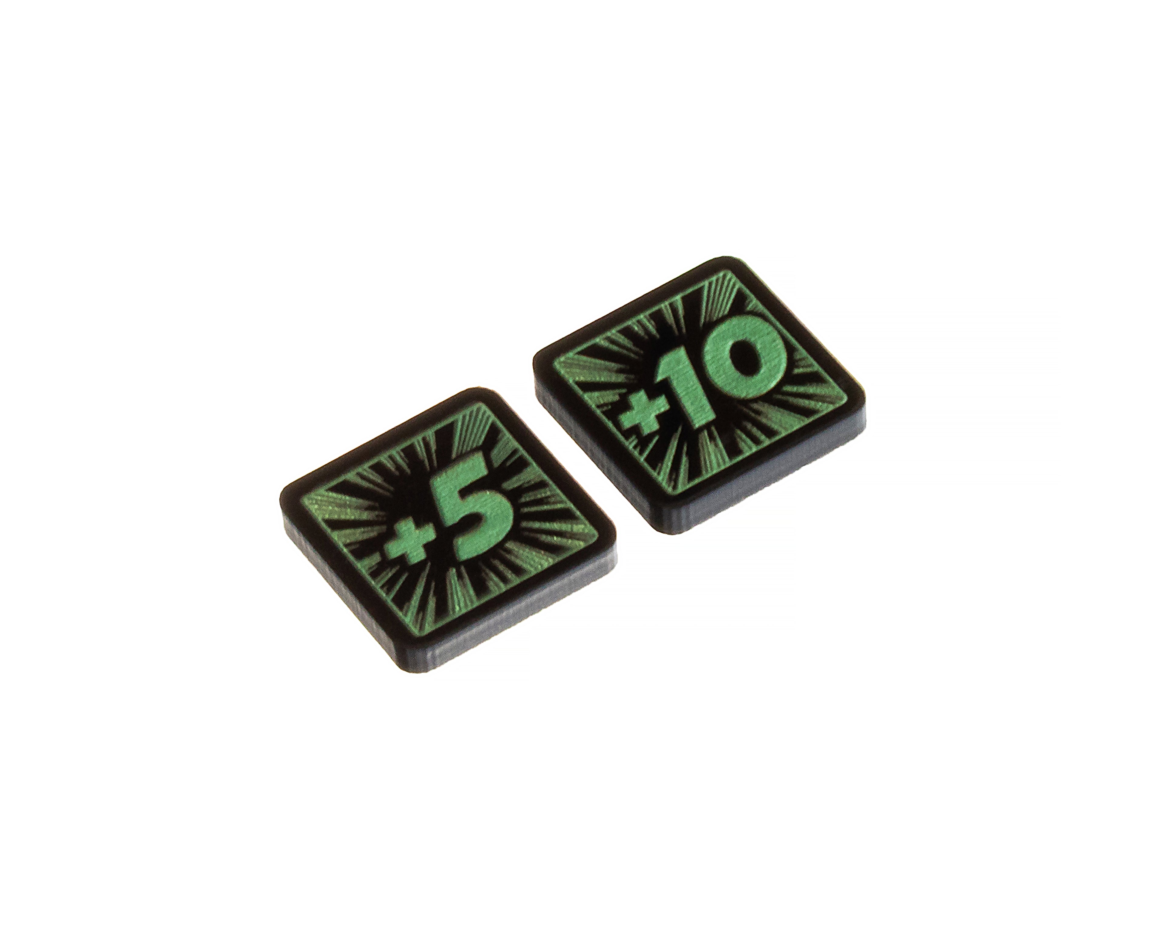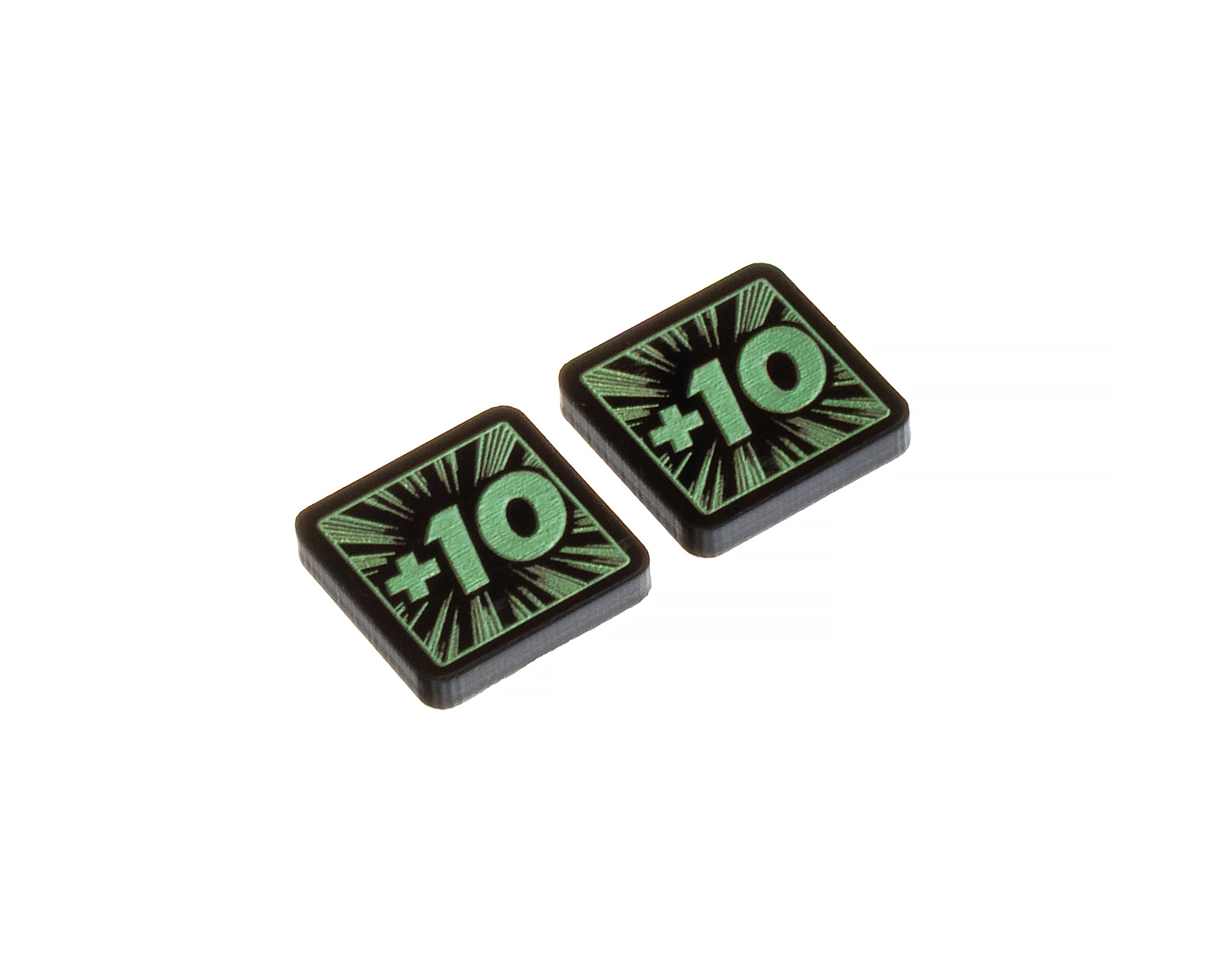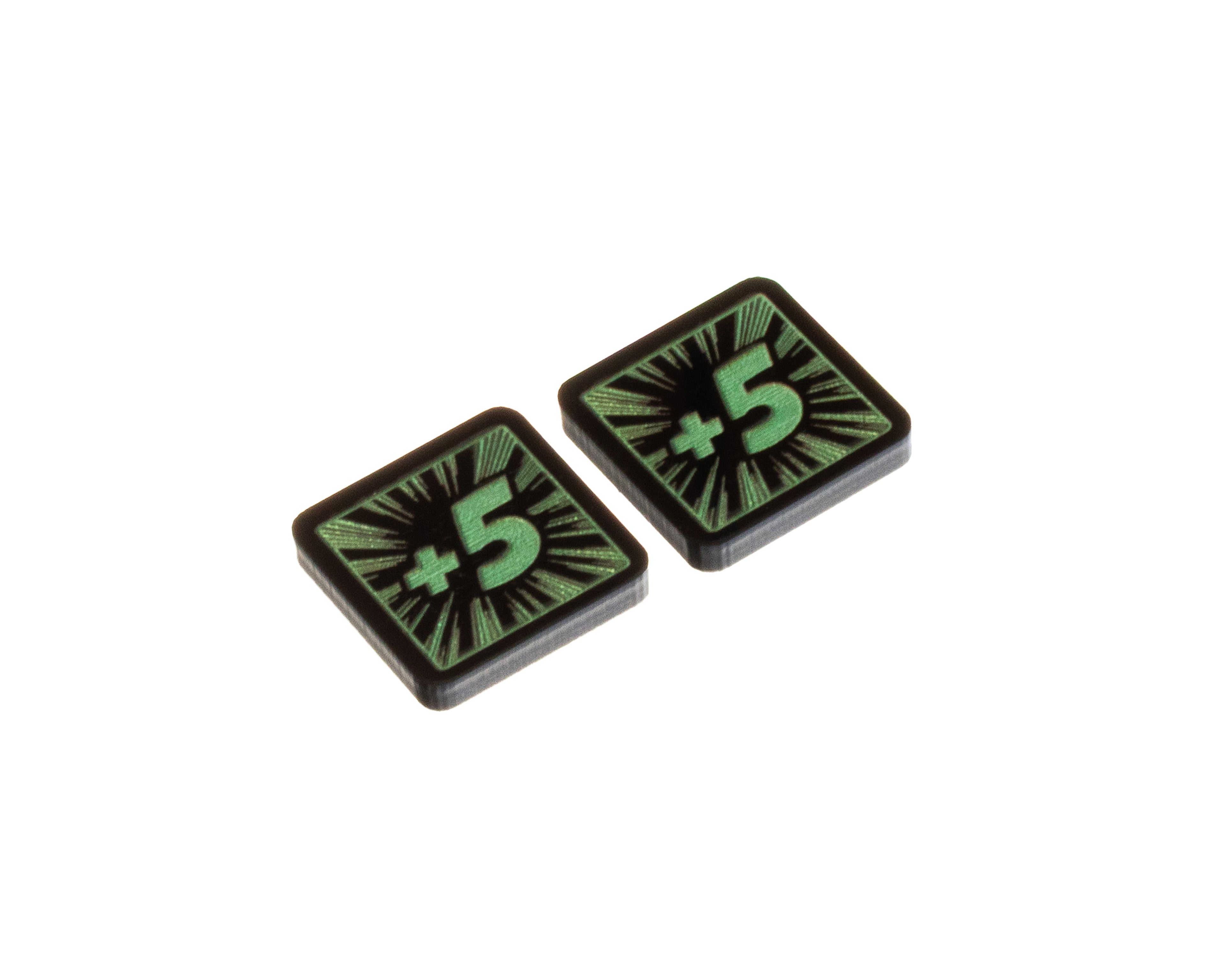 - 2 x Hela Tokens 5/10, double sided, etched and cut from opaque black acrylic, painted pearlescent green on both sides, and measuring 18mm x 18mm