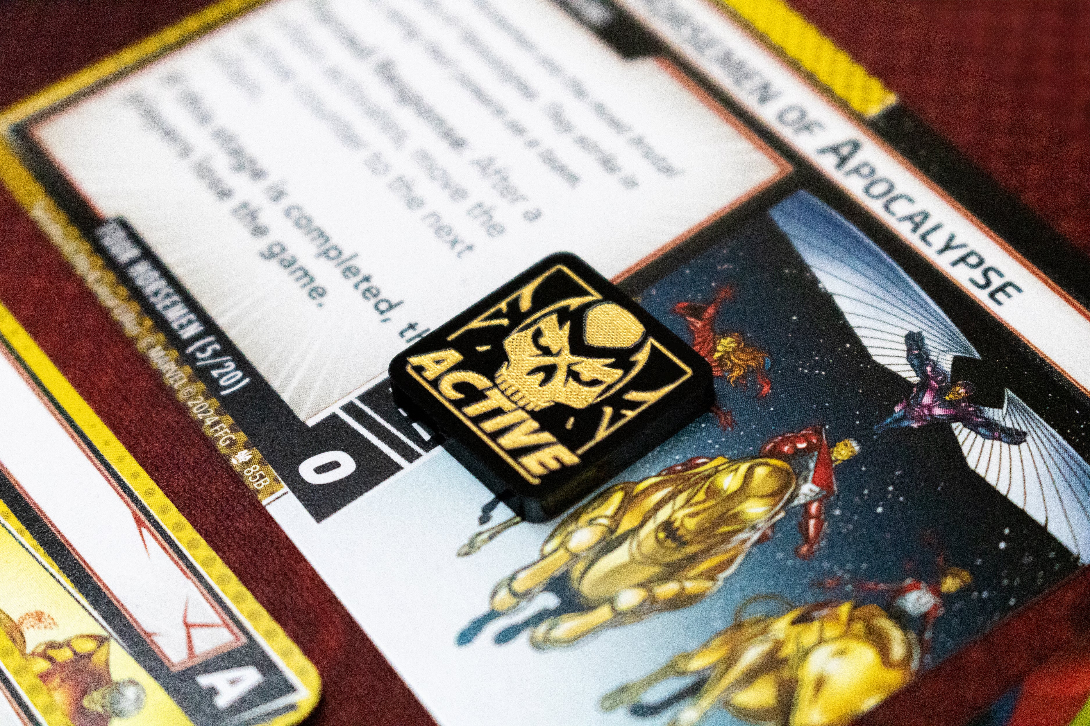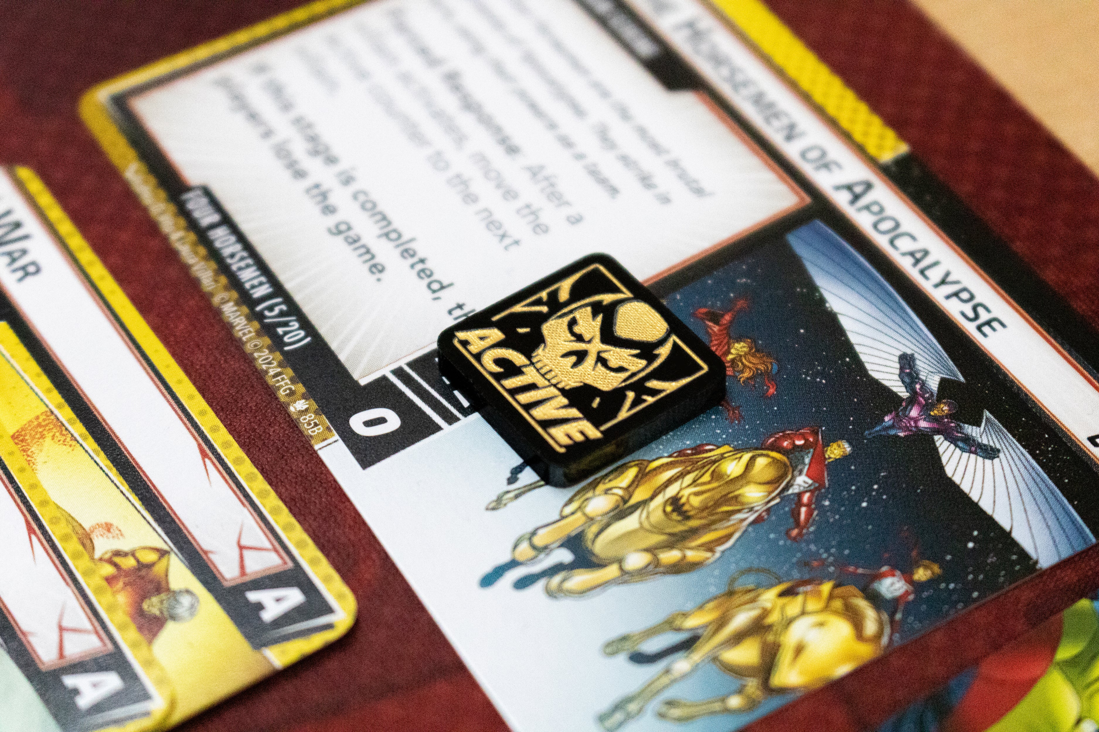 A token to indicate the current active Horsemen for The Horsemen of Apocalypse scenario within the Age of Apocalypse expansion.
