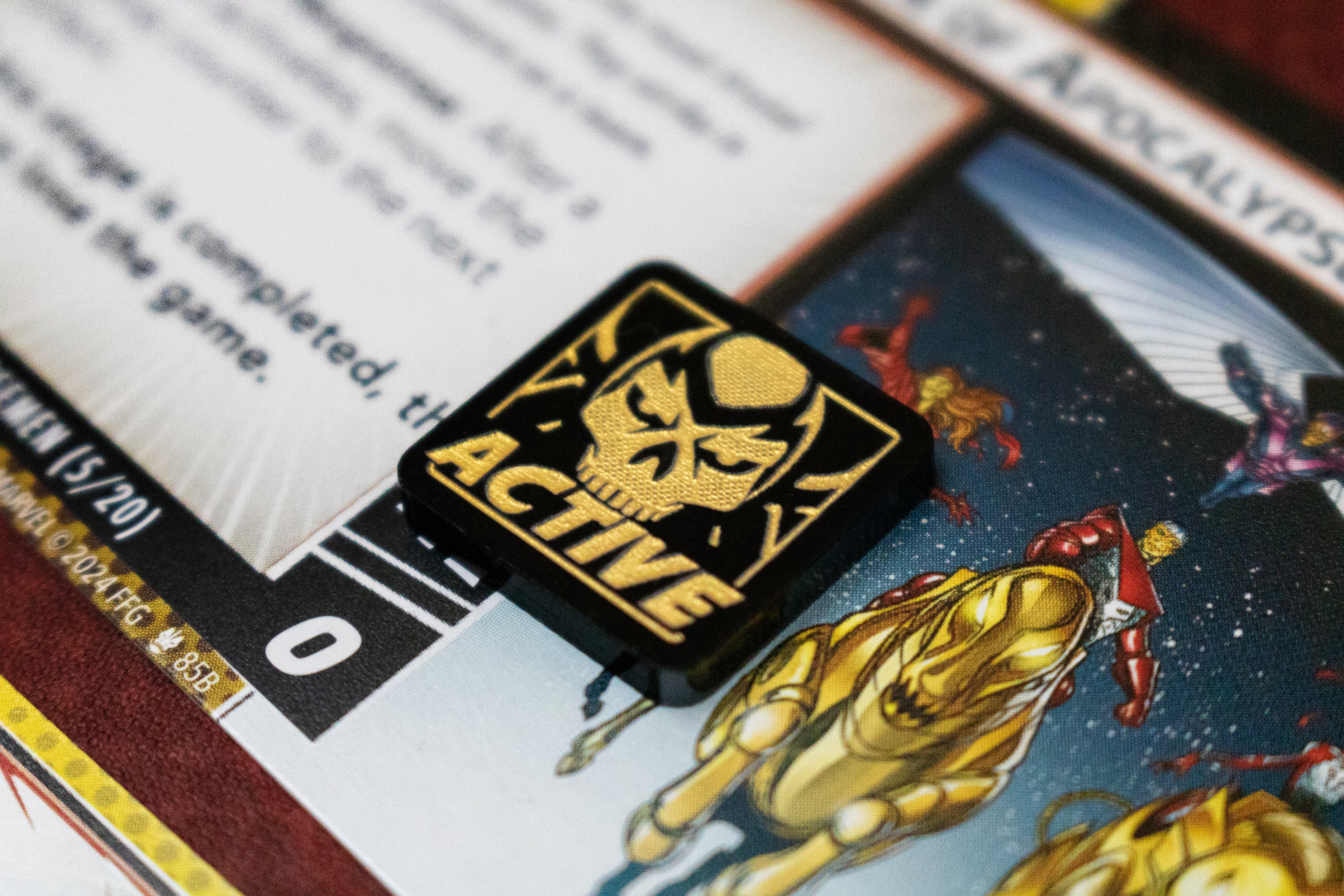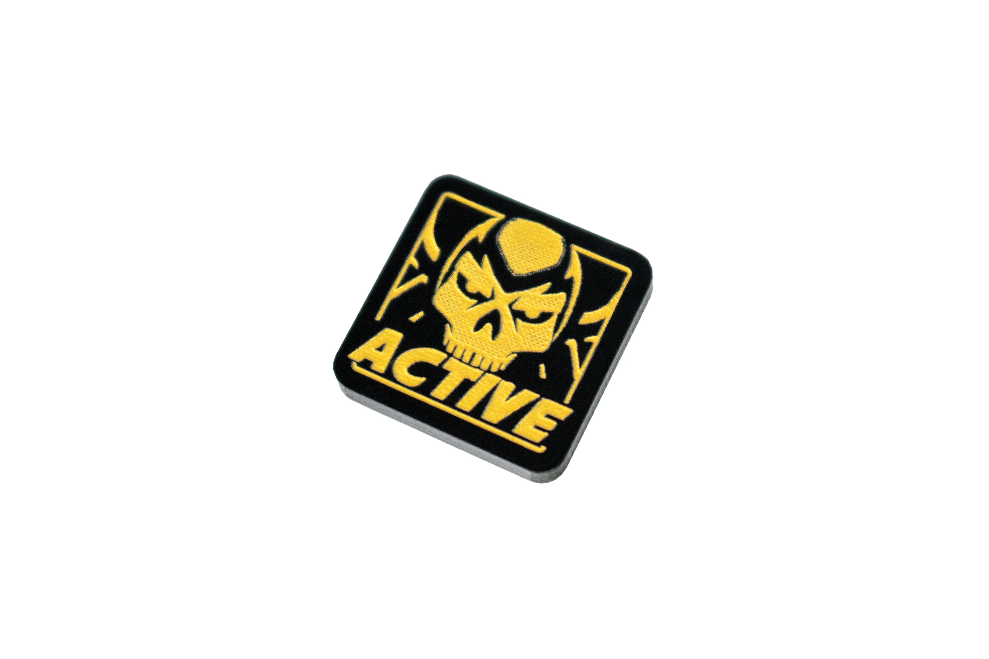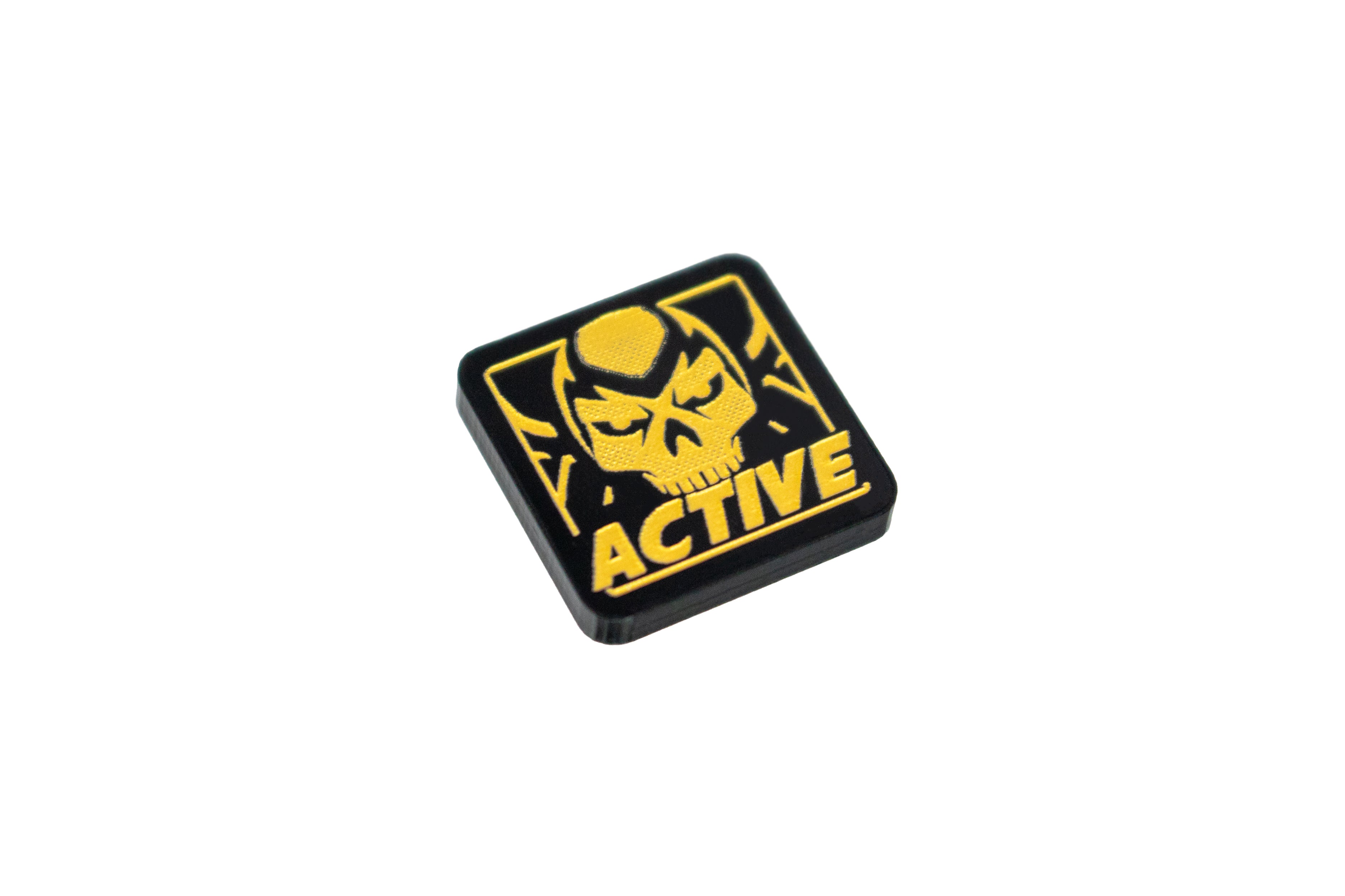- 1 x Active Horsemen Token, double sided, etched onto black acrylic and painted gold, measuring 18mm x 18mm
