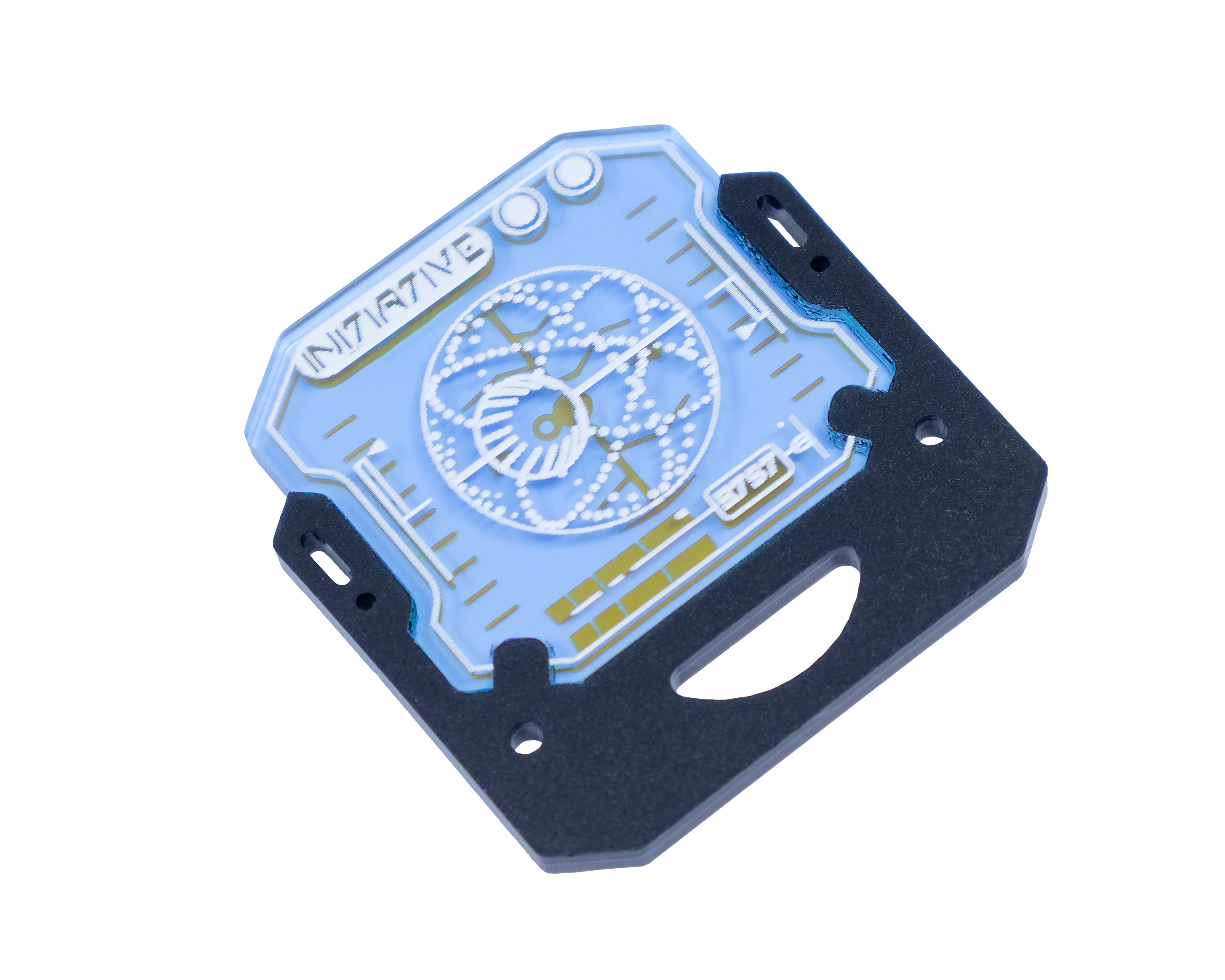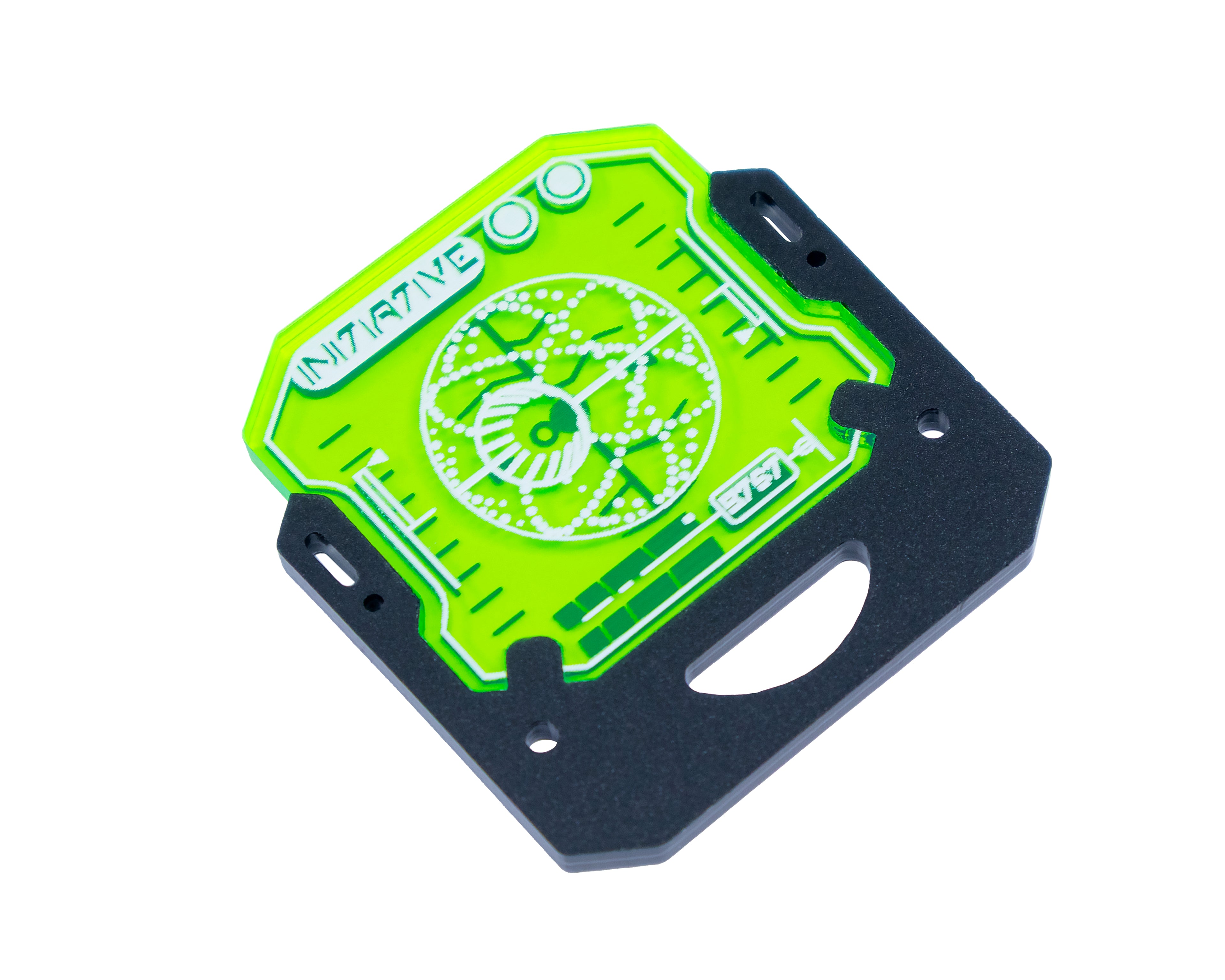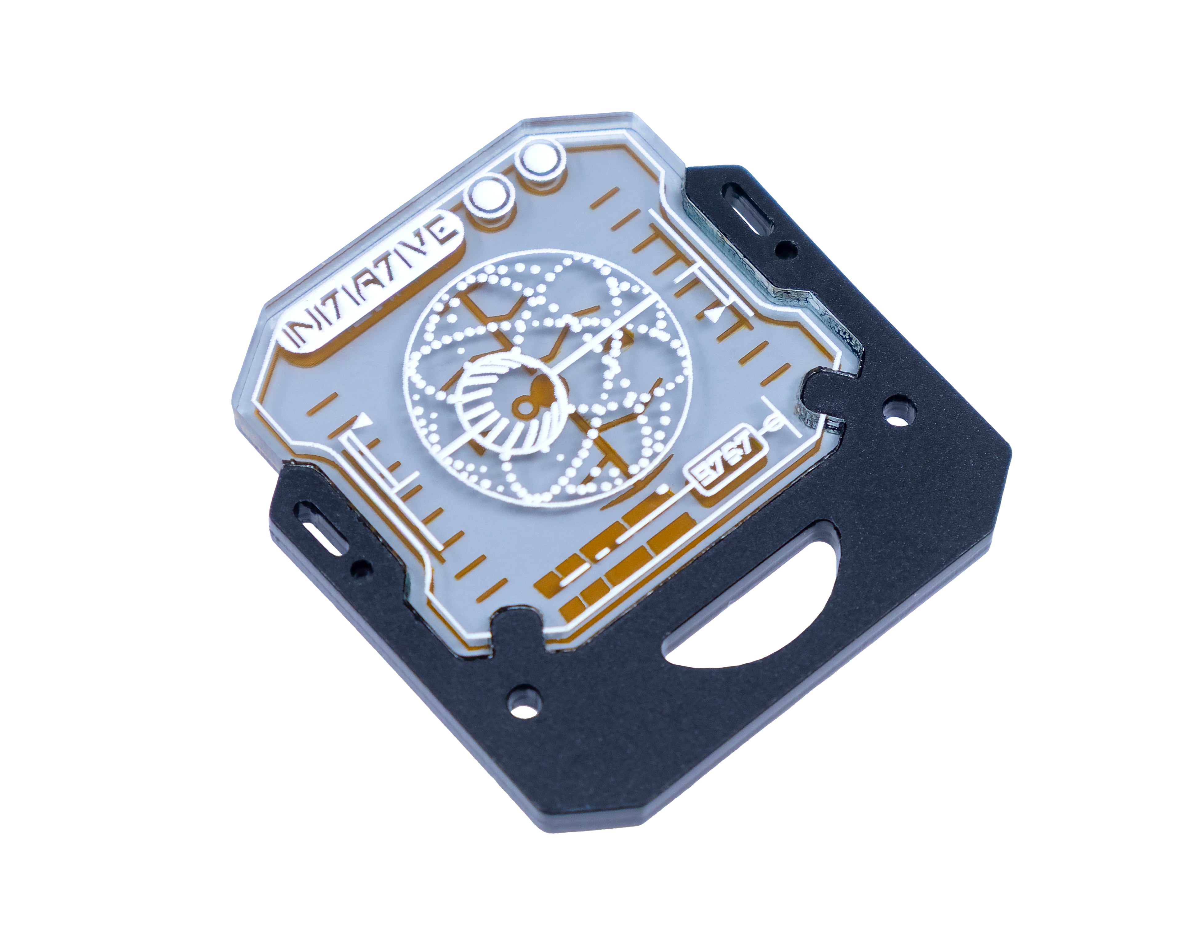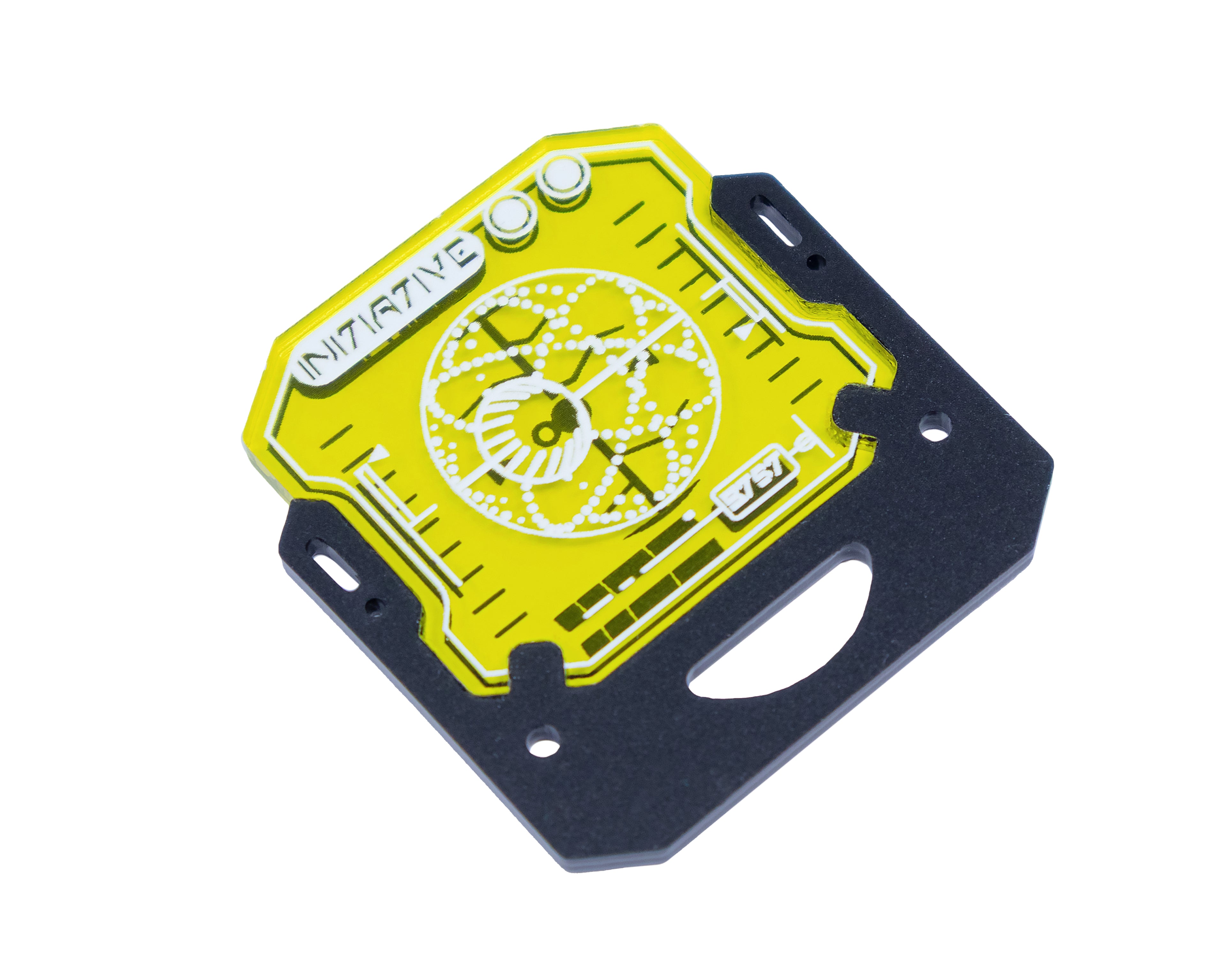 - 1 x Initiative token, (offered in choice of 6 colours) is etched on both sides and cut from 3mm acrylic. Painted white on the 'Open' side and yellow OR black on the 'taken' side (acrylic colour dependent) and measuring 39mm x 37mm