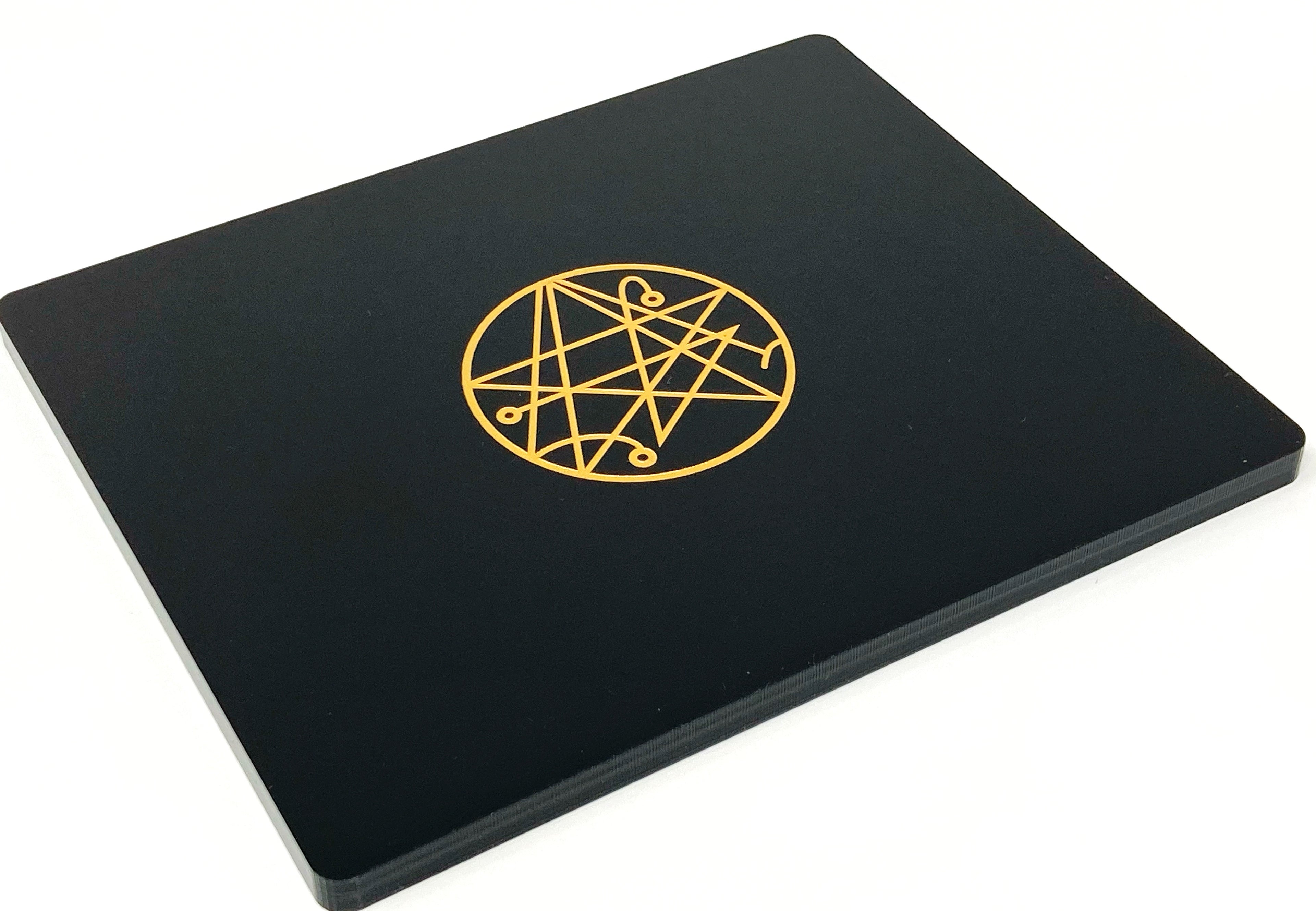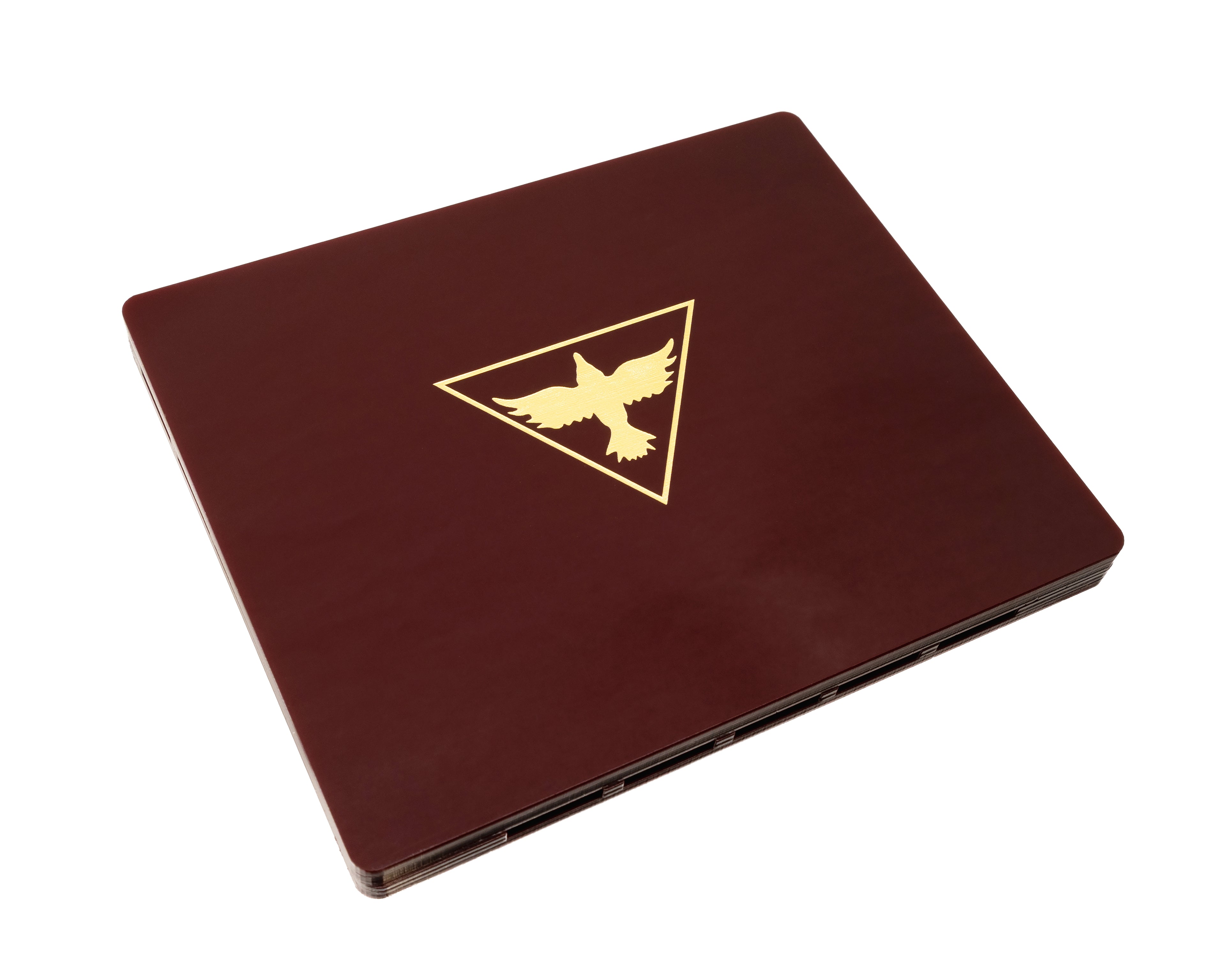 1 x Investigator board and cover, measuring approximately 145mm x 119mm x 12mm including cover, painted gold.
