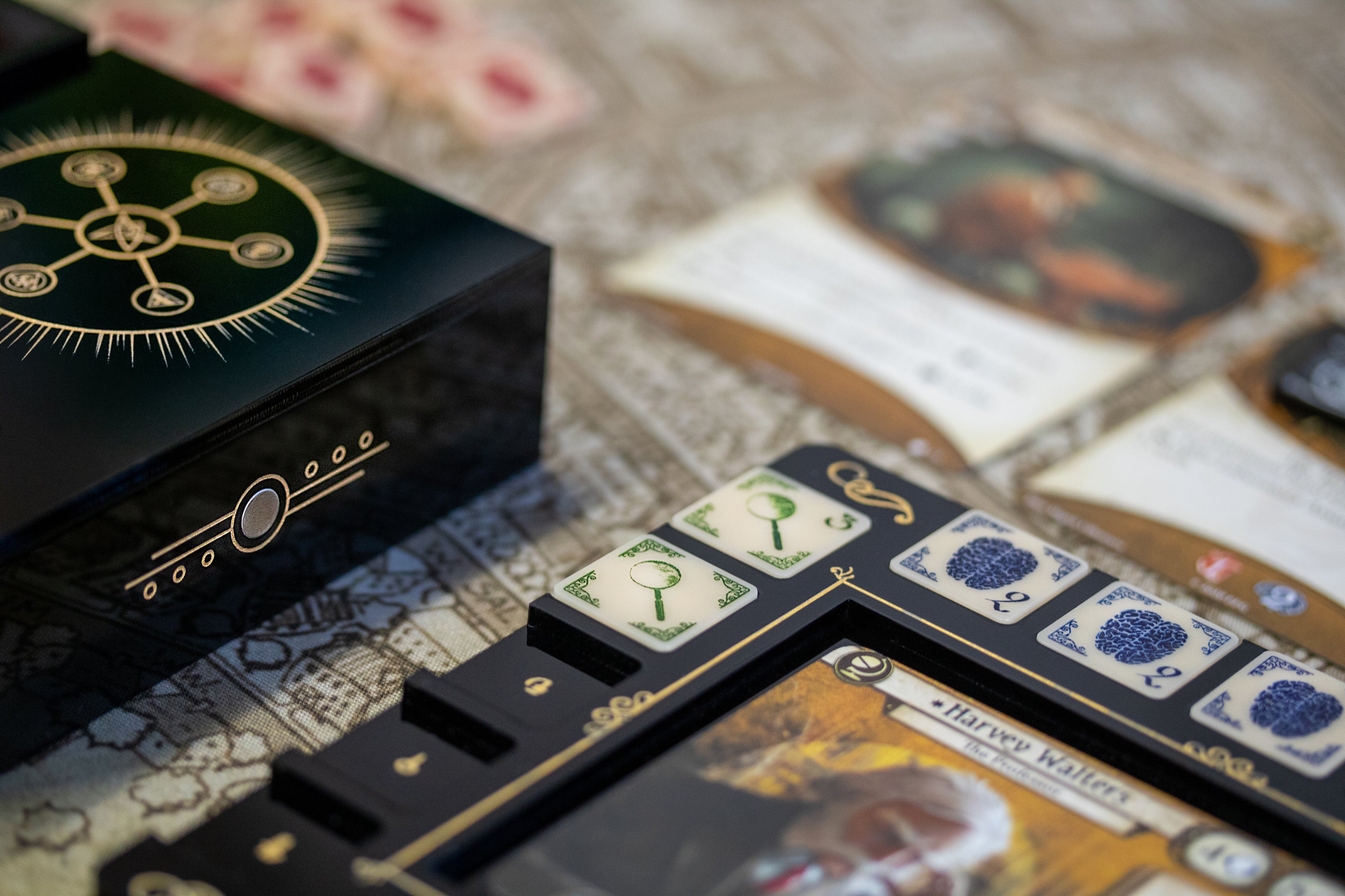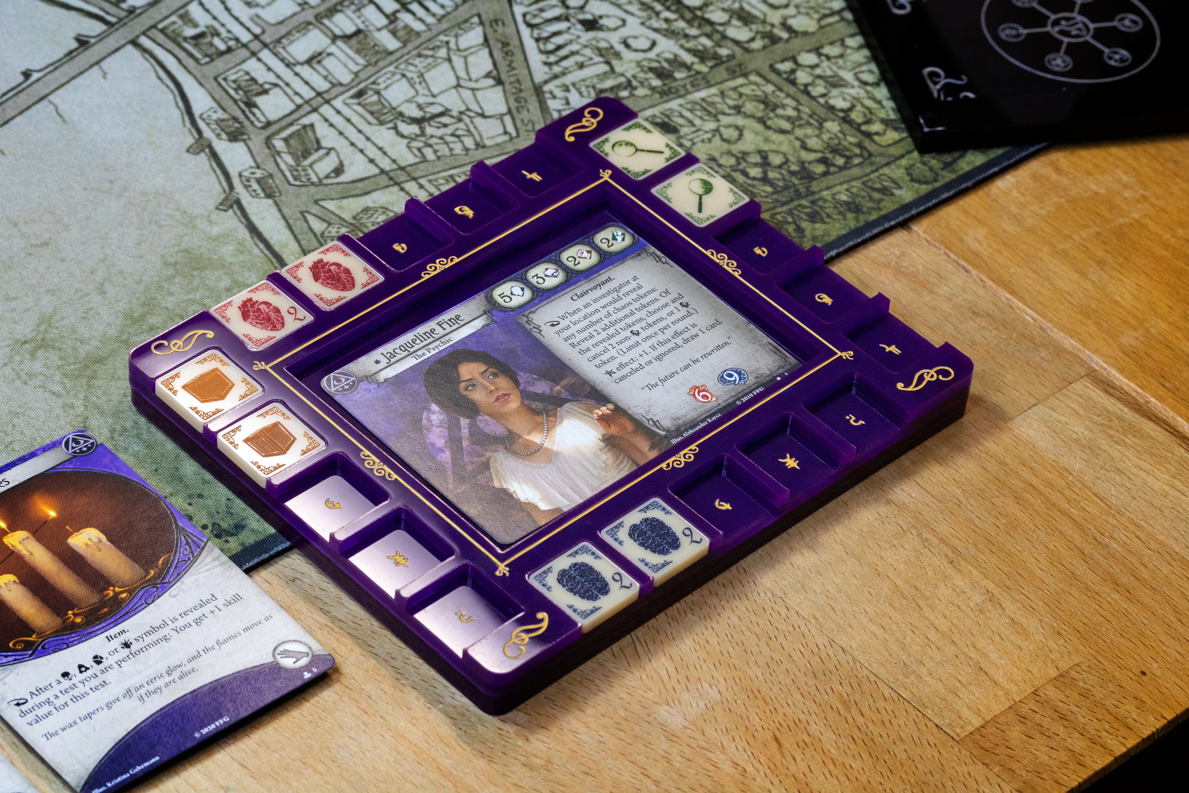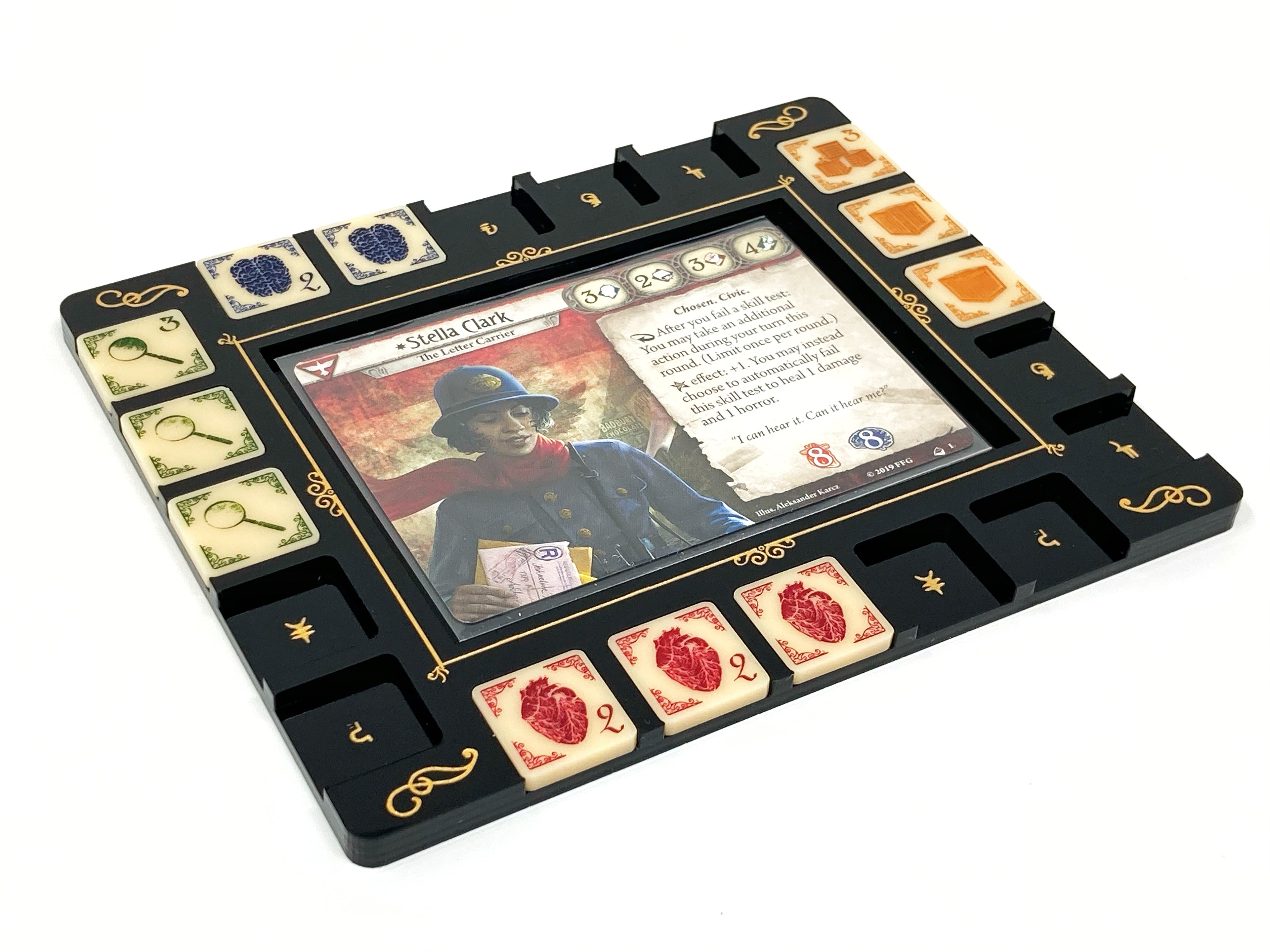 The Investigator board is designed to accommodate your sleeved investigator card and keep a tidy track of all the health, sanity, resource and clue tokens during gameplay. With the addition of the magnetised cover plate, the tokens and investigator card are kept safely stored within.