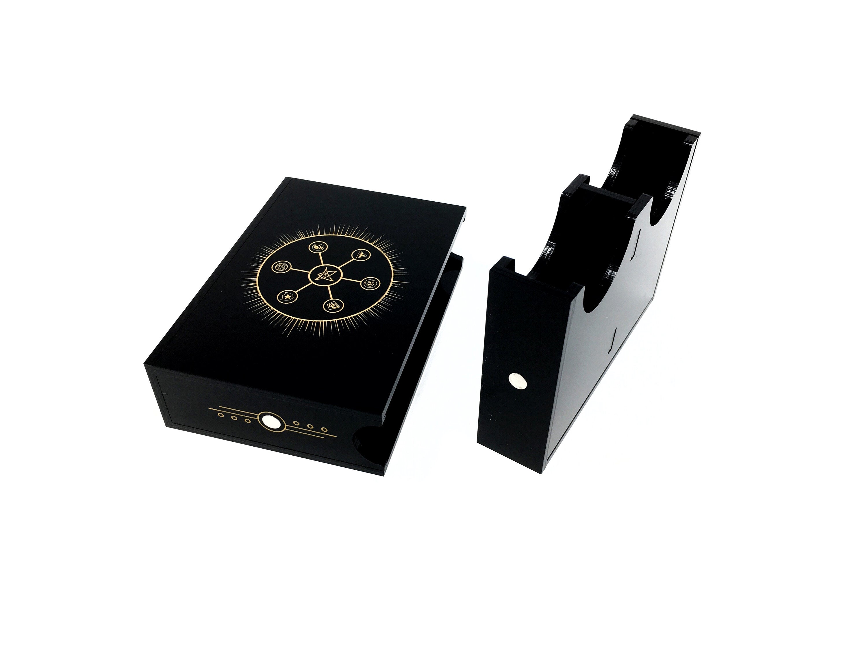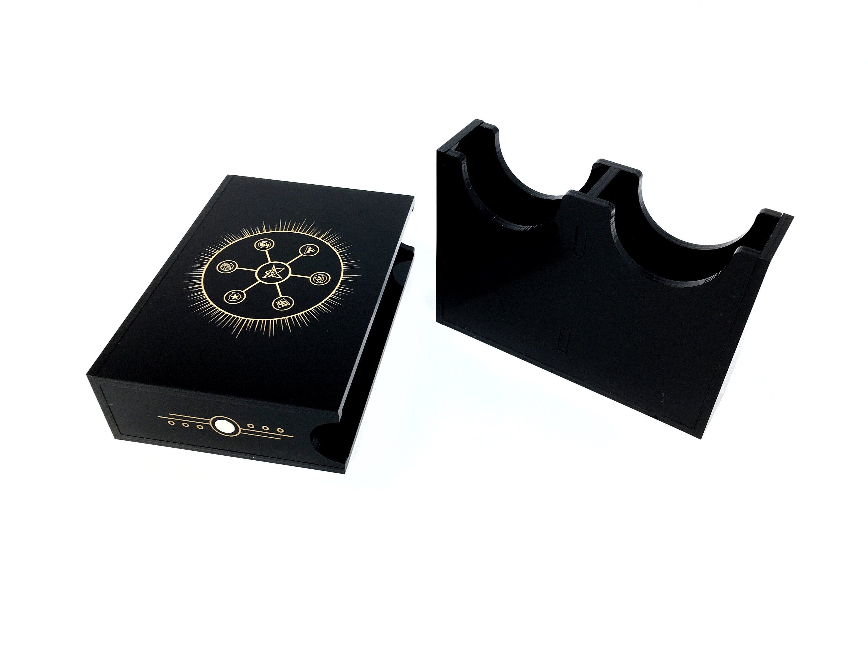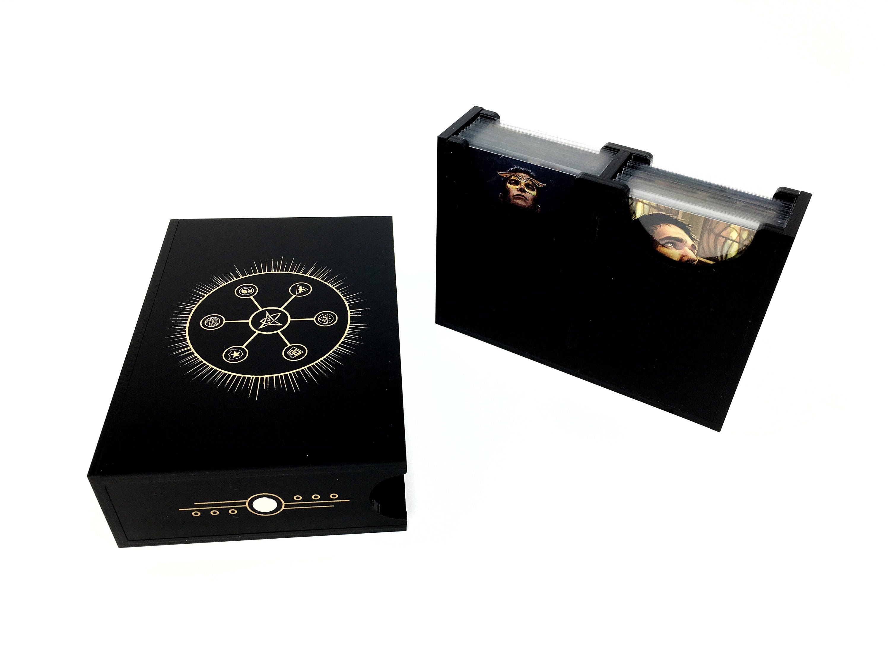 The Investigator mini card holder has been specifically designed to fit the theme of your Arkham Horror Games while providing a practical storage solution for the investigator mini cards. Made from the finest acrylic and hand painted, they can store up to 60 (FFG thickness) sleeved cards. The incorporated magnets keep the cover and card holder securely in place when closed.