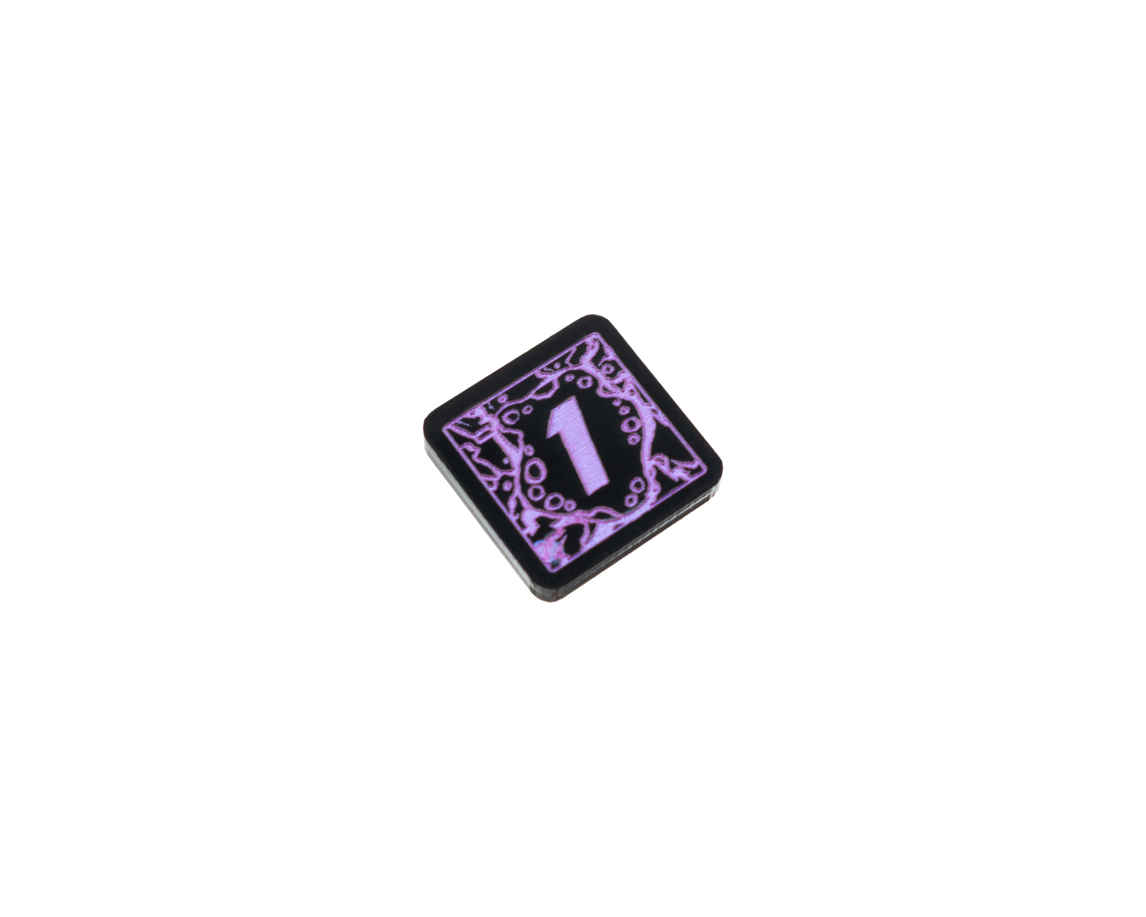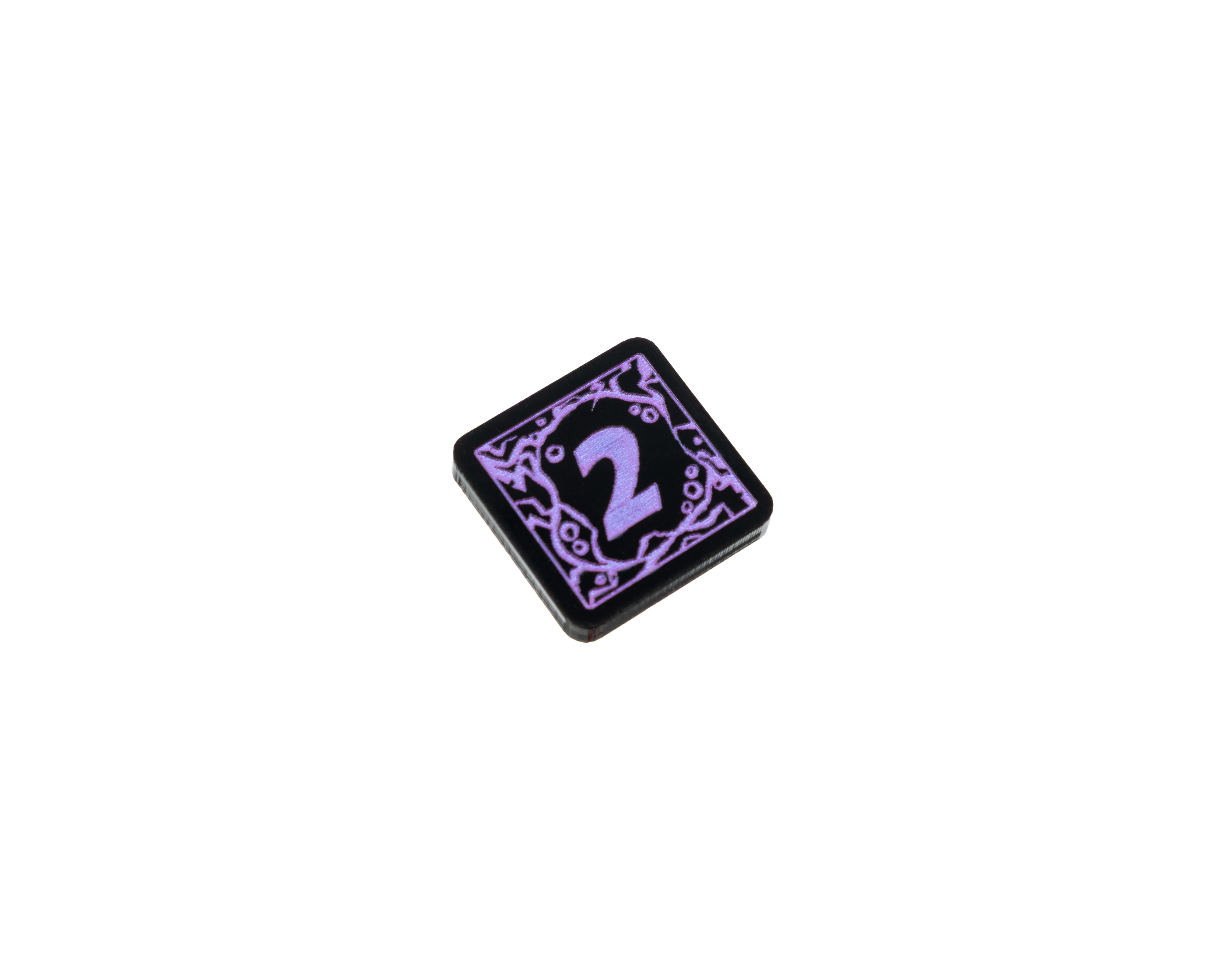 - 2 x Ionic Physiology Token, double sided, etched and cut from opaque black acrylic, painted pebeo irid. violet/blue on both sides and measuring 18mm x 18mm.