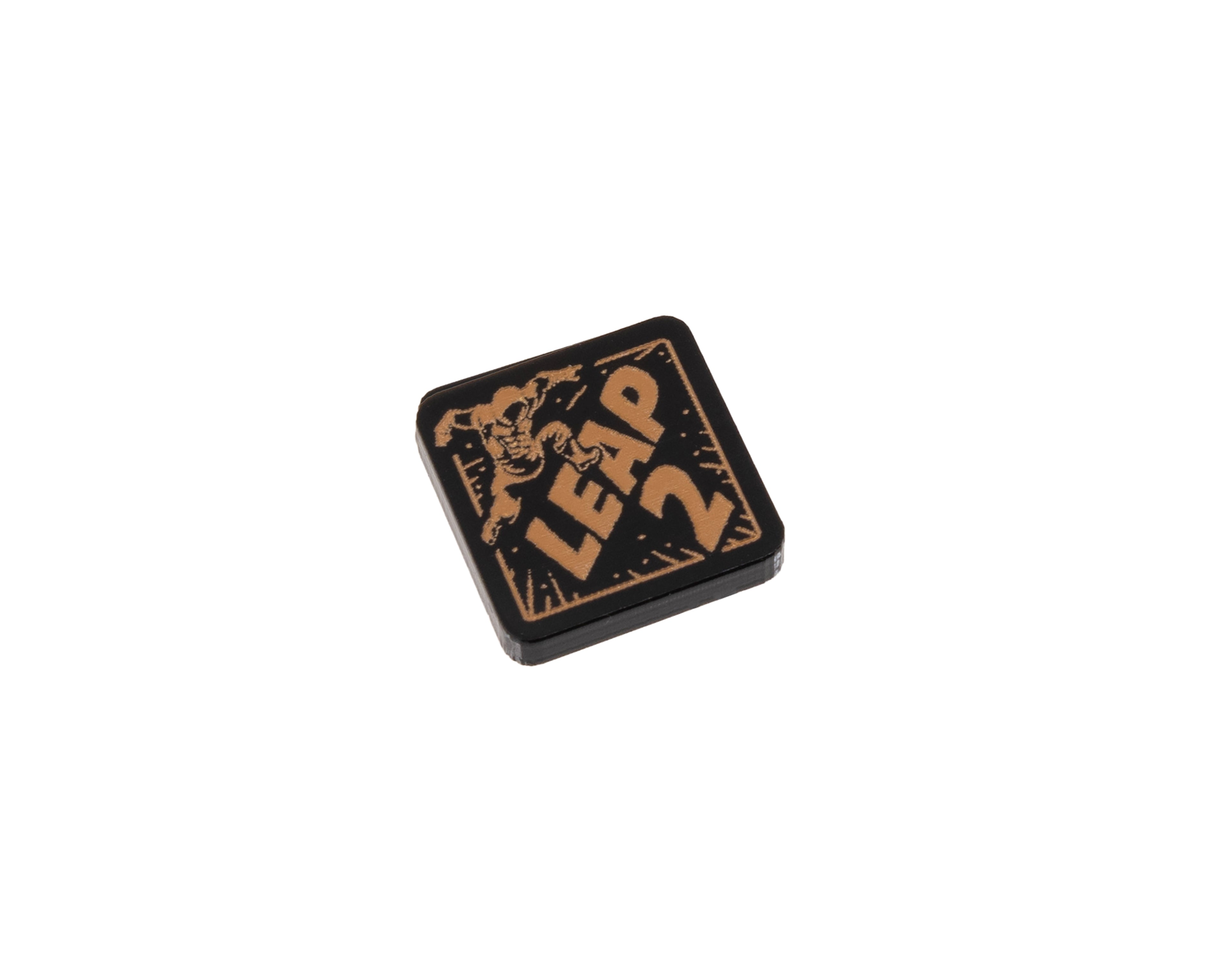 - 2 x 1/2 Leap Tokens, double sided, etched and cut from opaque black acrylic and painted raw sienna on both sides. Measuring 18mm x 18mm.