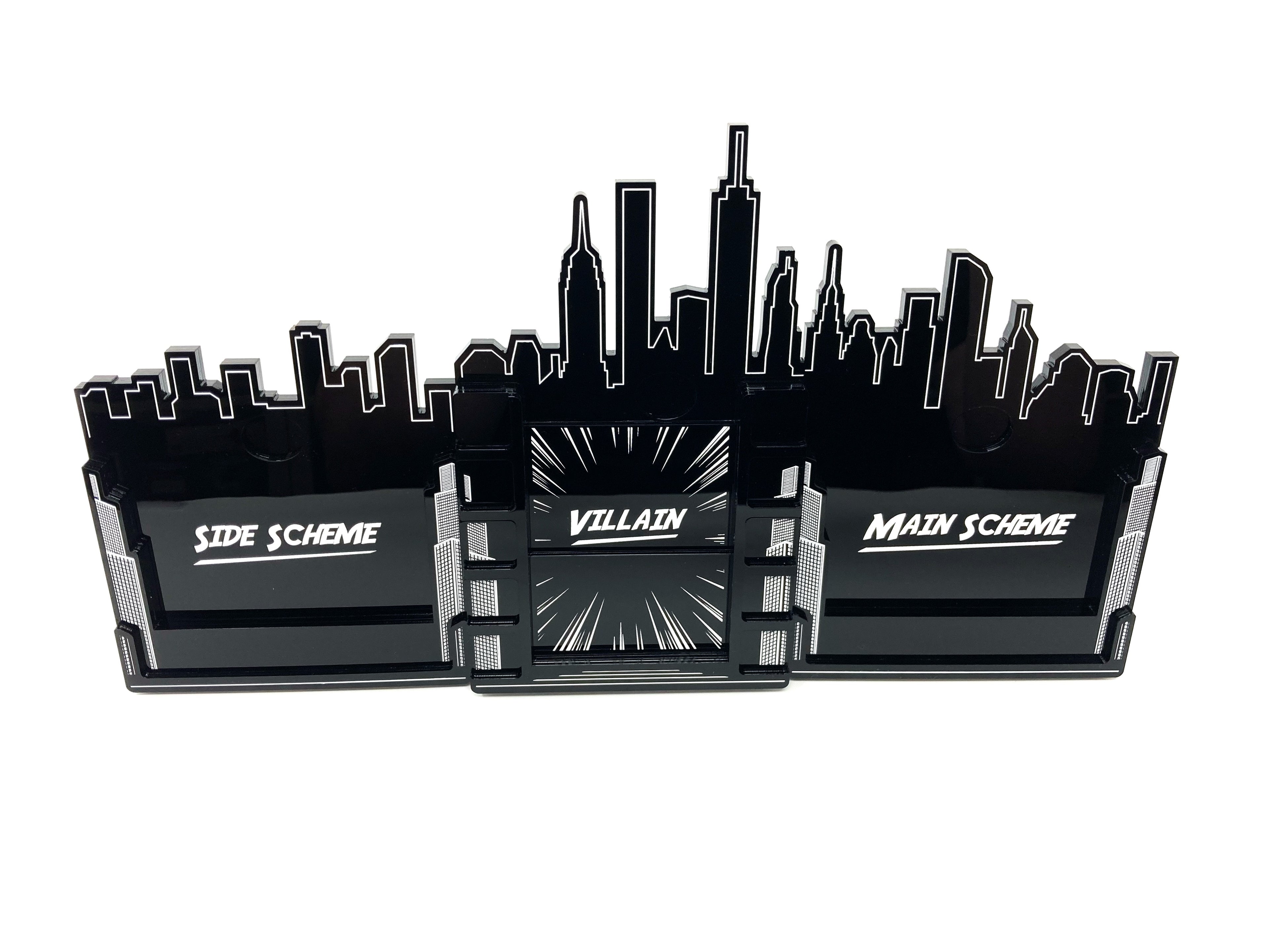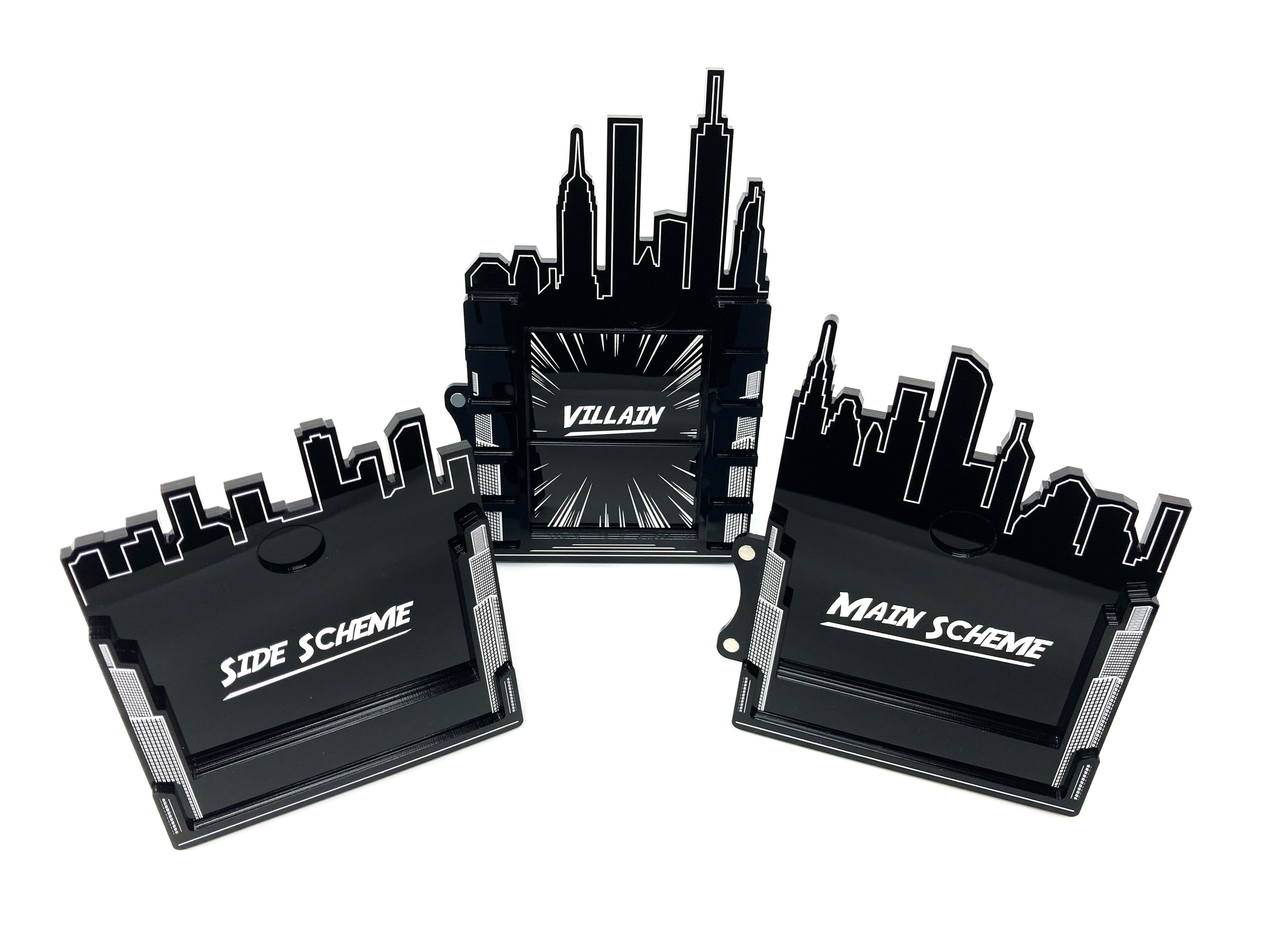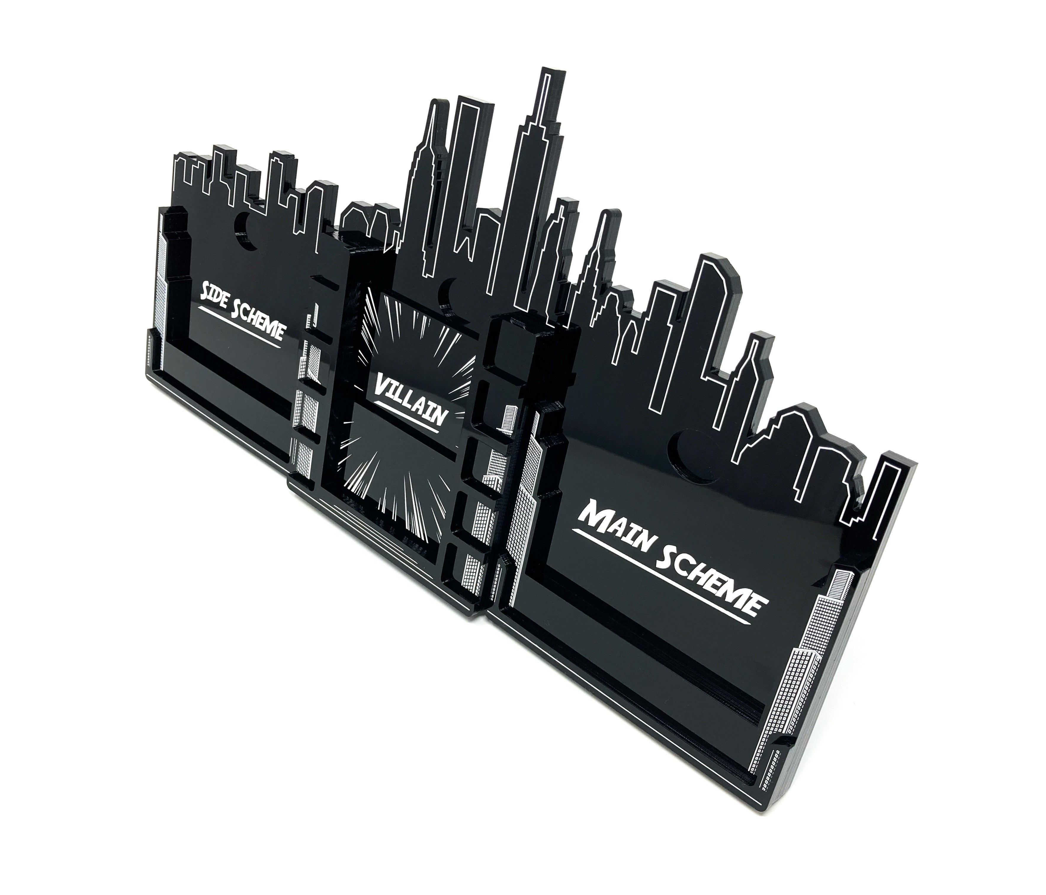 - Stands: Our Villain and Scheme displays are designed to elevate your cards. Each display is supplied with a removable stand. This means the Villain and Scheme cards, as well as the threat and damage tokens, are easy to read while sitting at the table. There is no need to pick up each card to read them!