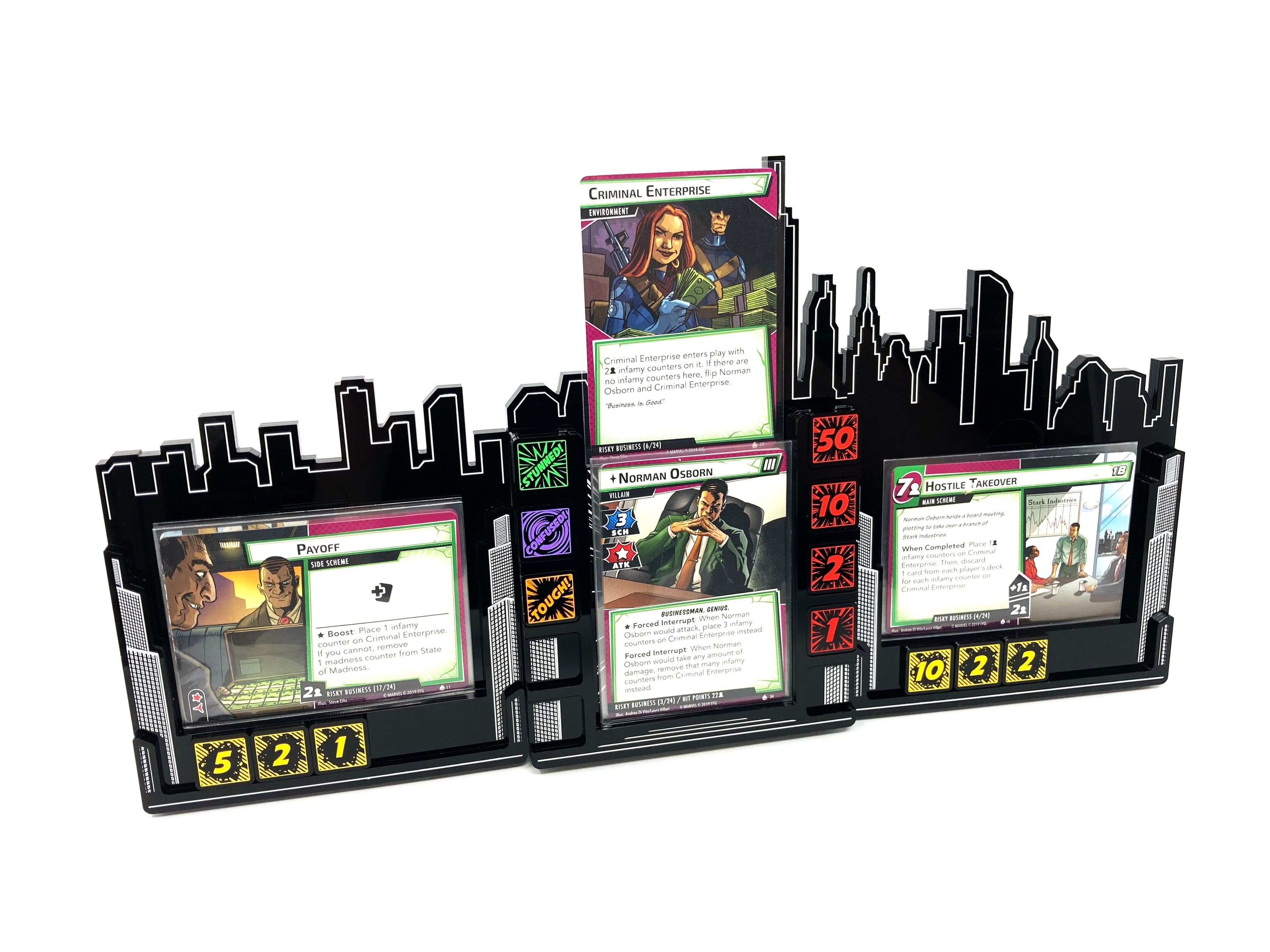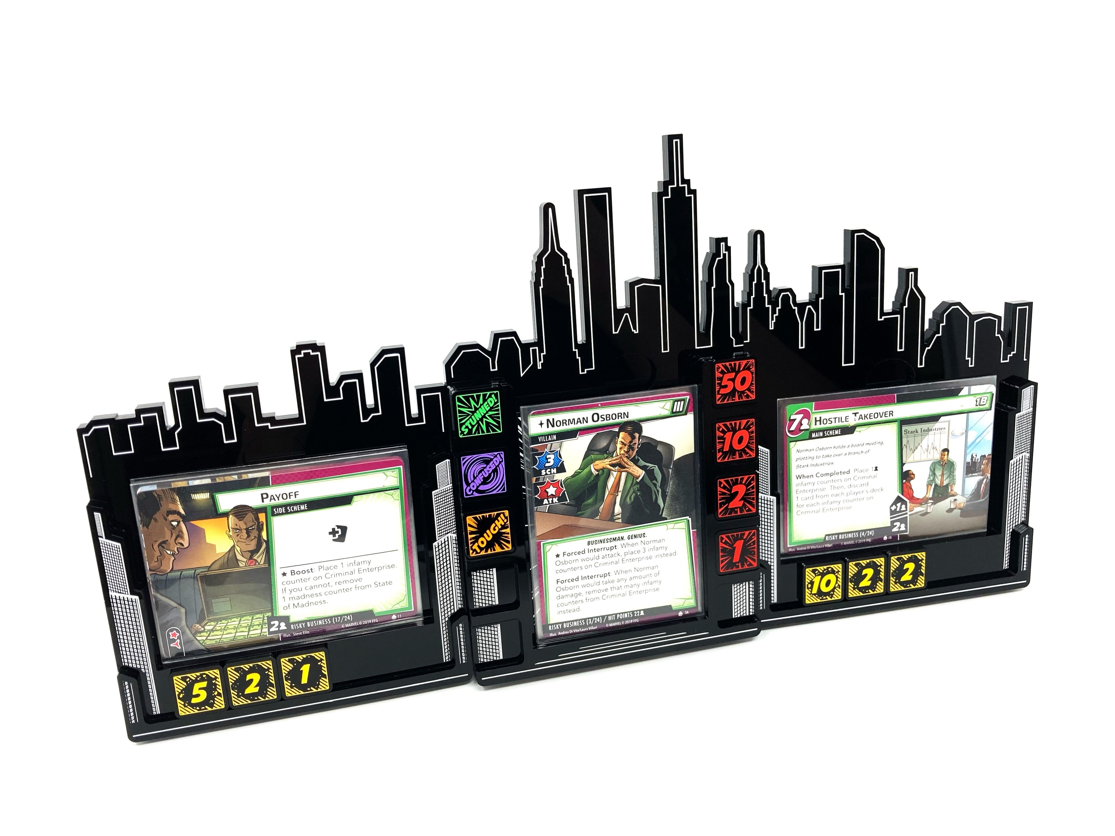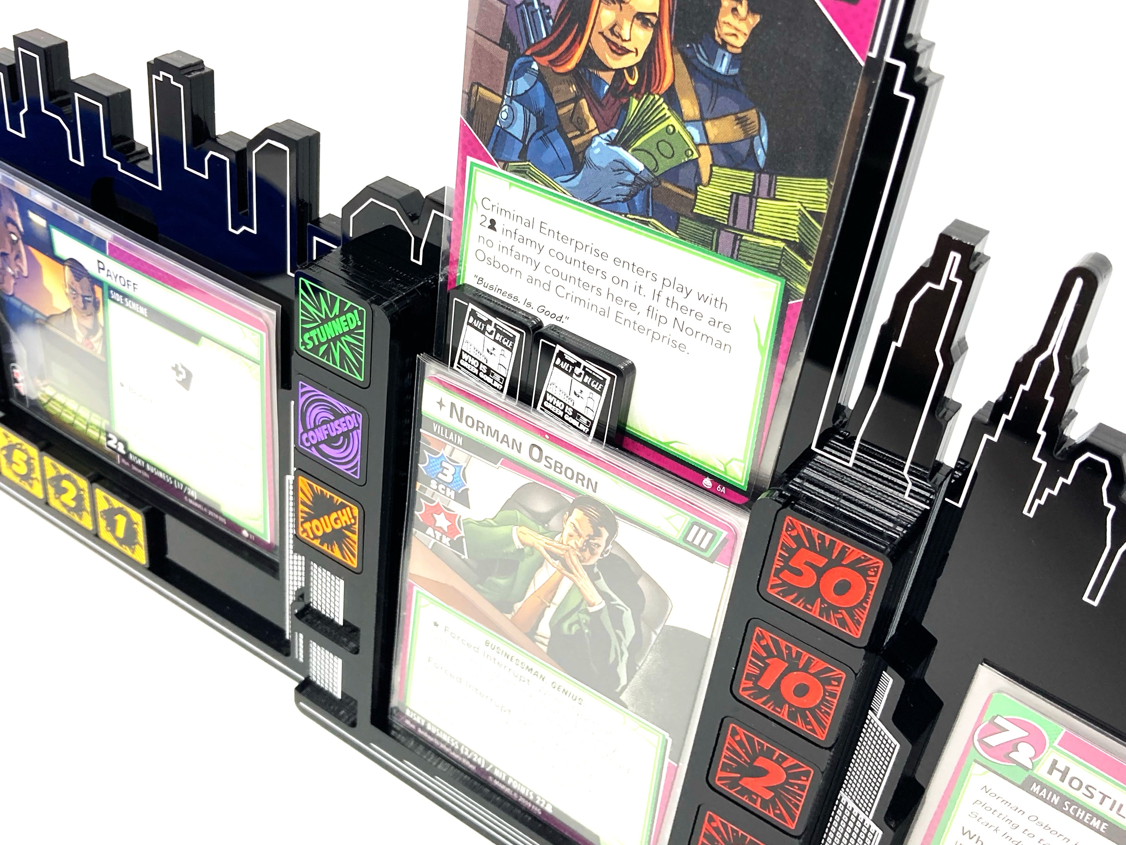 - Stands: Our Villain and Scheme displays are designed to elevate your cards. Each display is supplied with a removable stand. This means the Villain and Scheme cards, as well as the threat and damage tokens, are easy to read while sitting at the table. There is no need to pick up each card to read them!