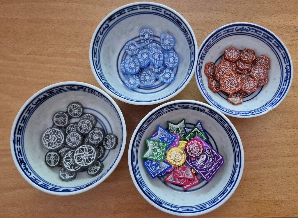 - 8 x Victory Point/High Council tokens, 2 Red, 2 blue, 2 green and 2 yellow mirror acrylic, single sided and painted white, measuring 18mm diameter
