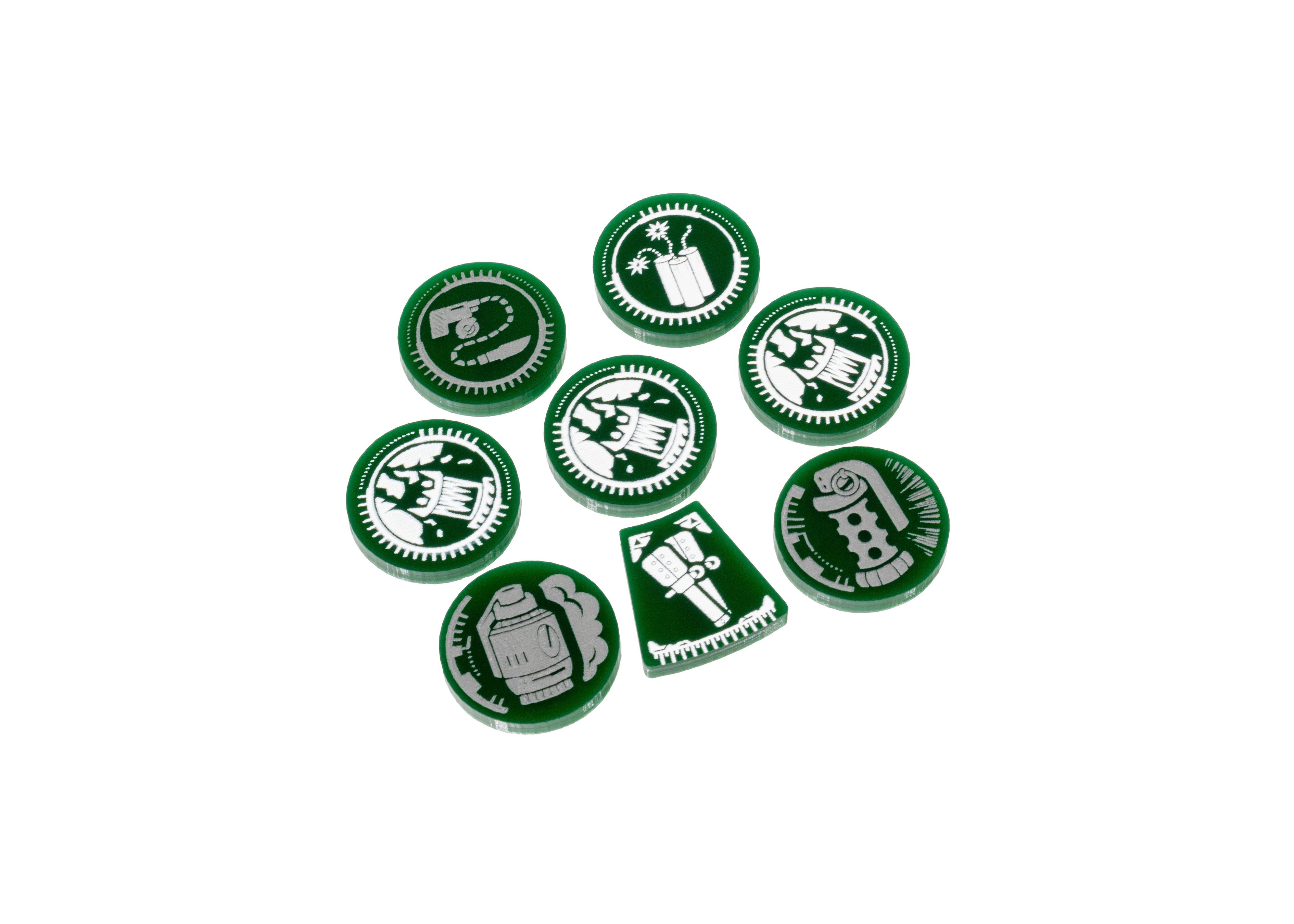 - 1 x Stun Grenade token, etched and cut from dark green opaque acrylic, painted white on one side and grey on the reverse. Measuring 20mm in diameter.
