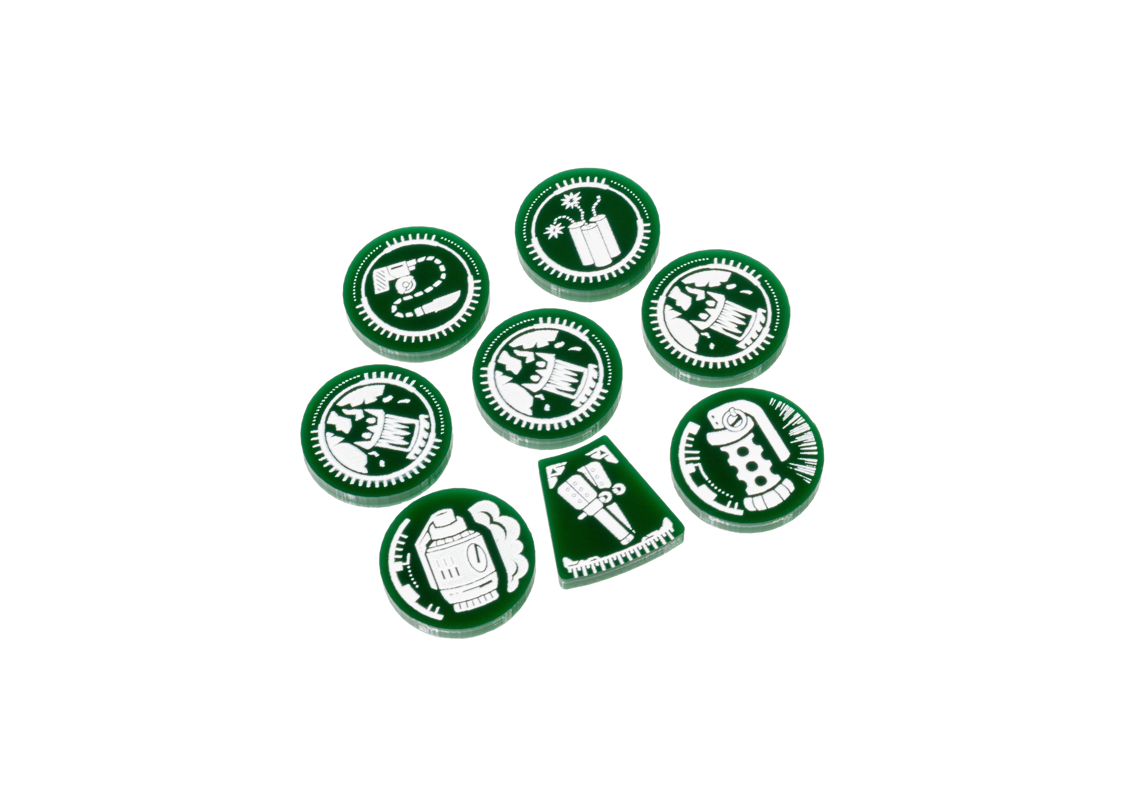 1 x Explosives token, etched and cut from dark green opaque acrylic, painted white on both sides and measuring 18mm x 18mm.