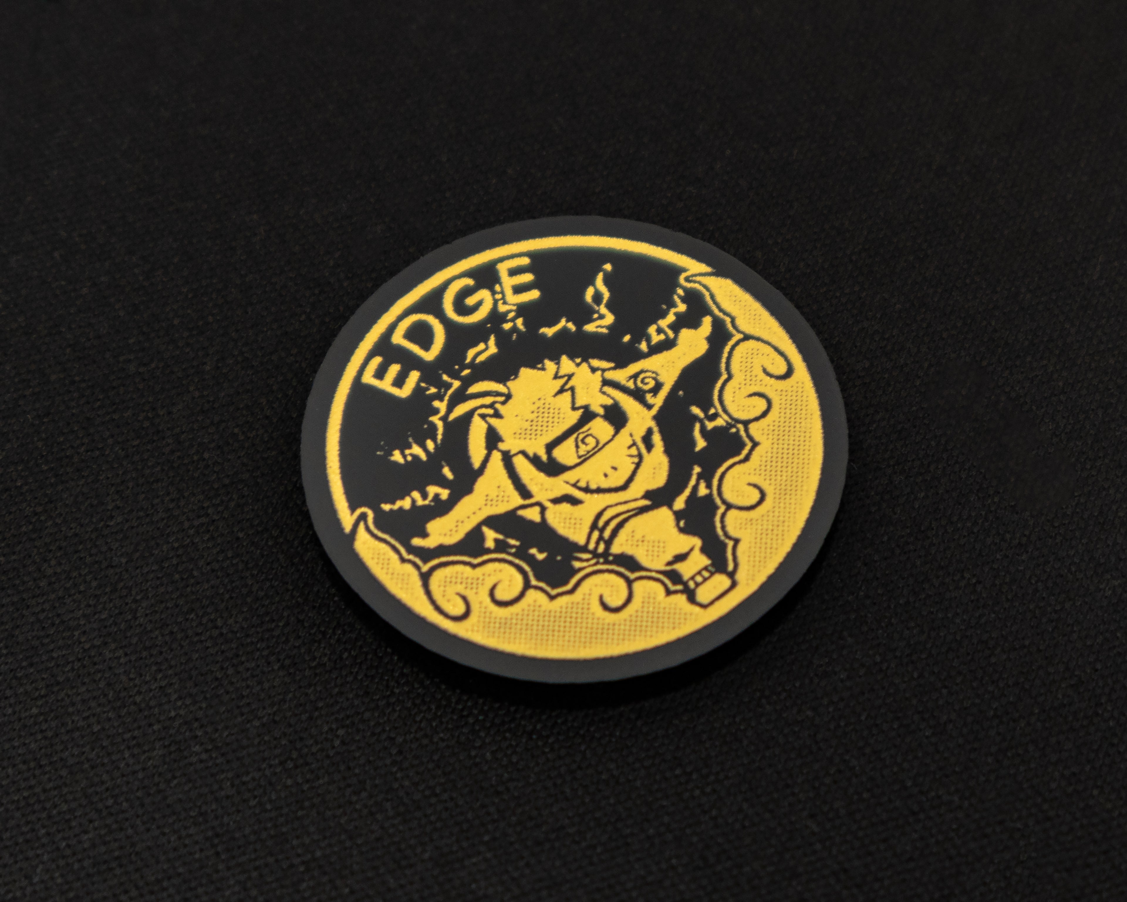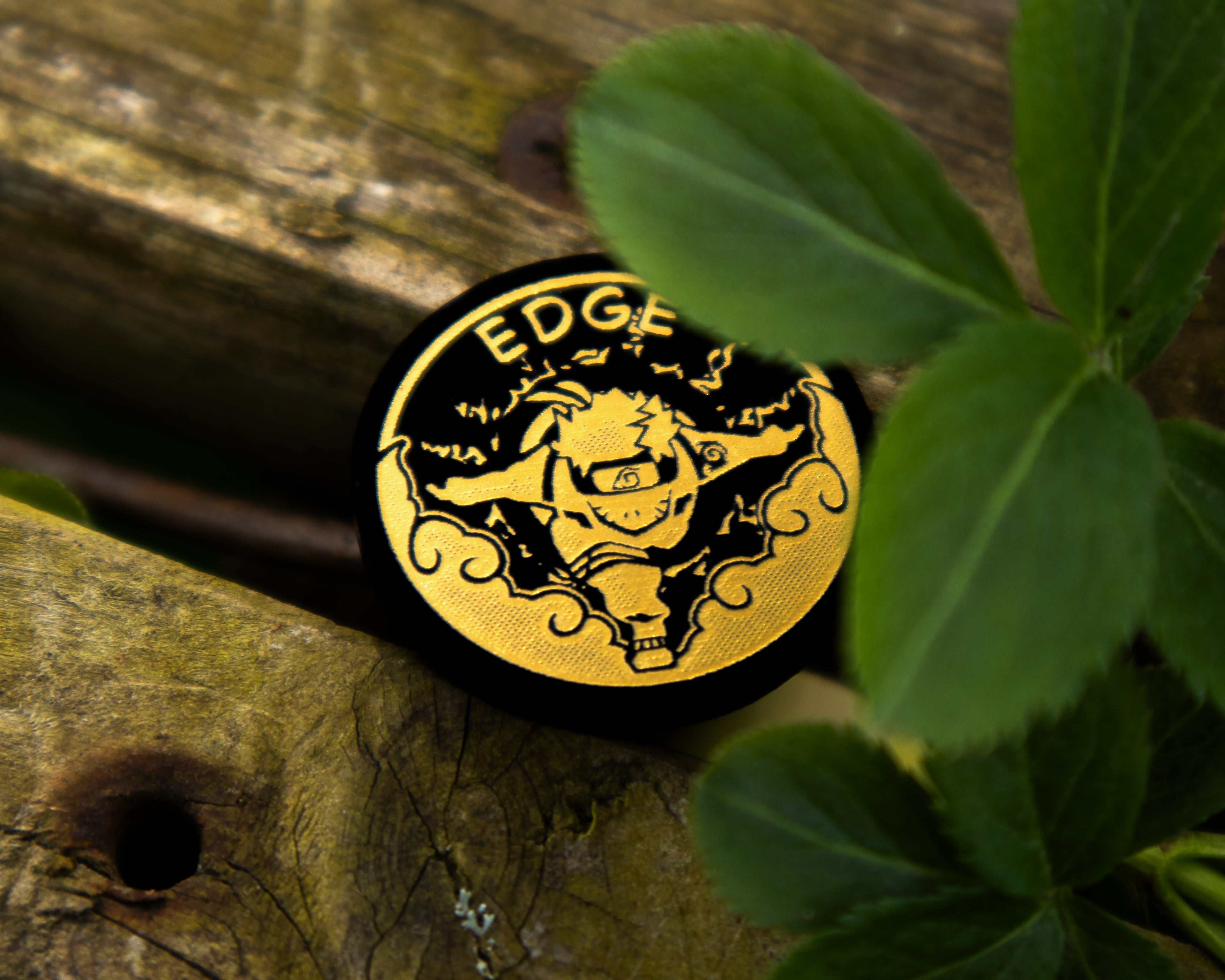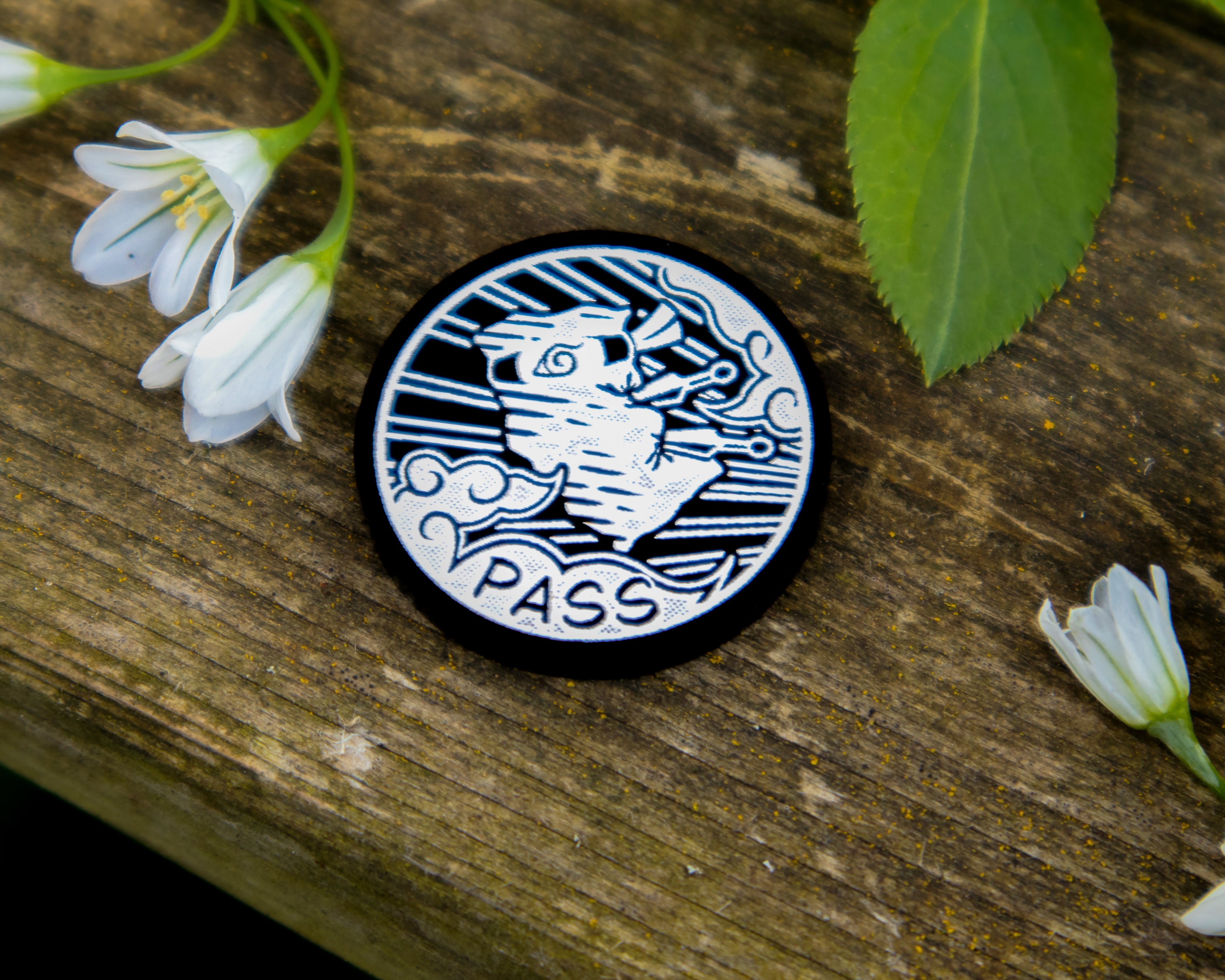 - 1 x Edge Token, double sided, etched and cut from black 3mm acrylic, painted gold on the edge side and white on the pass side. Measuring approximatley 30mm in diameter.