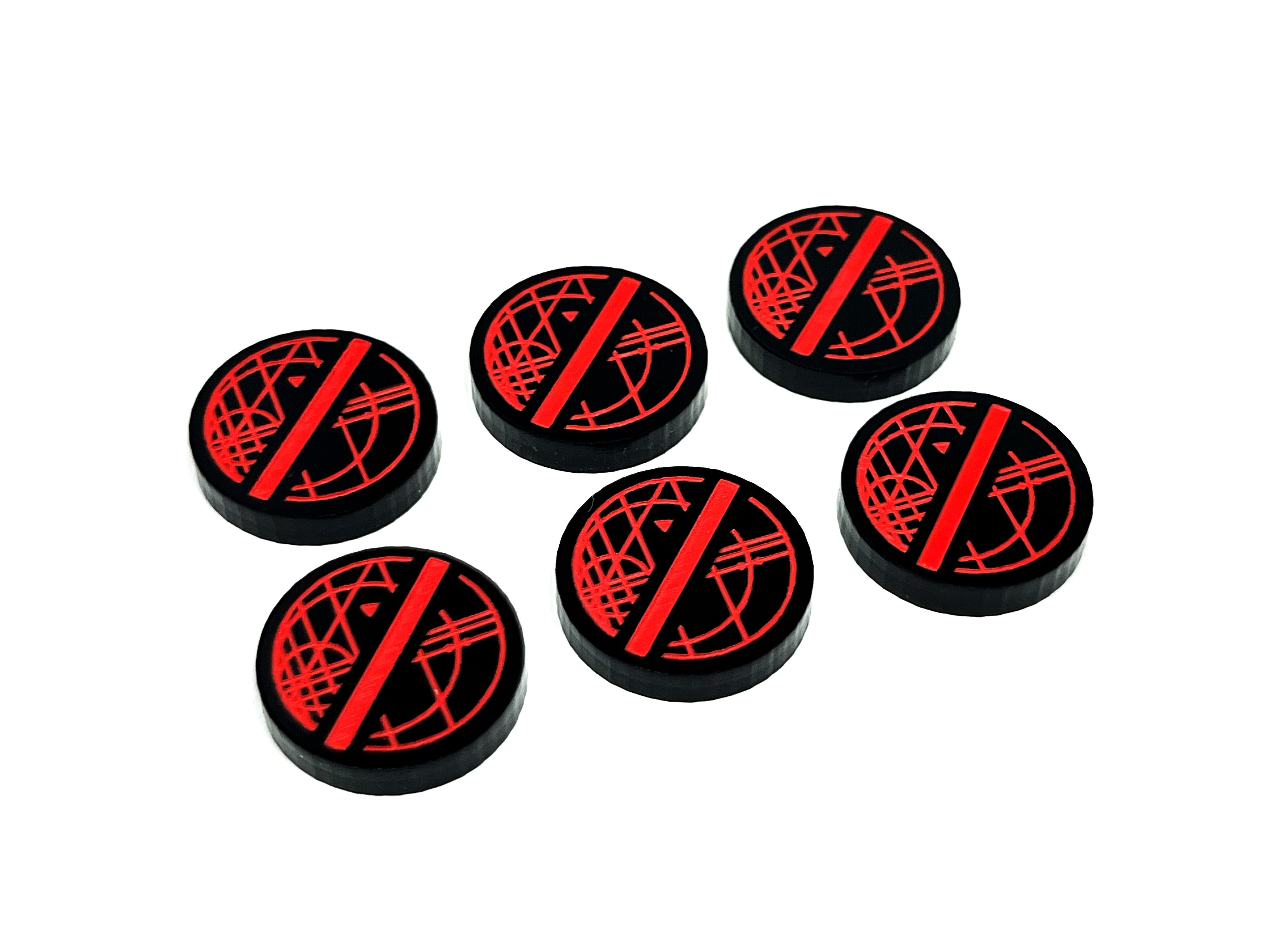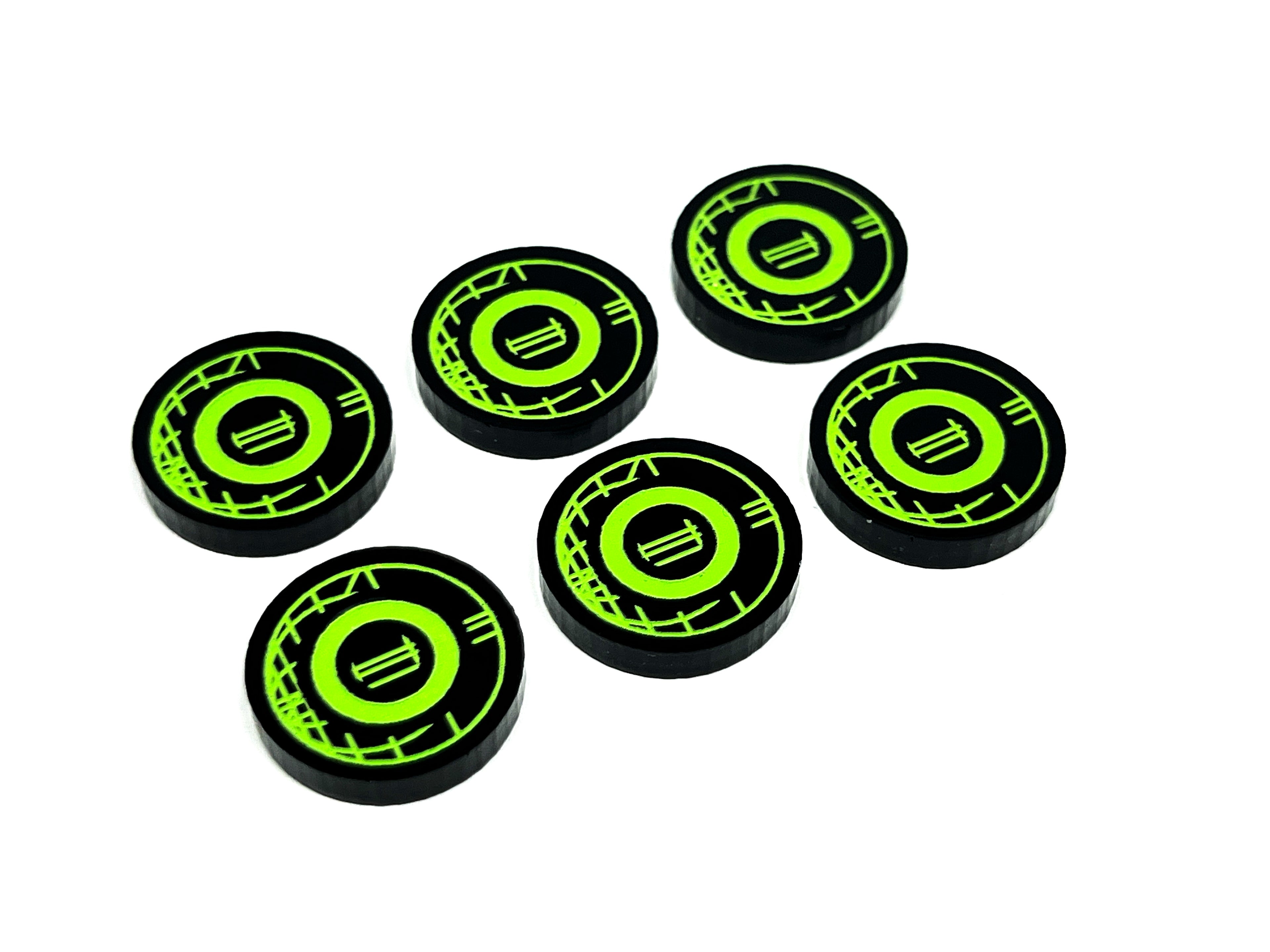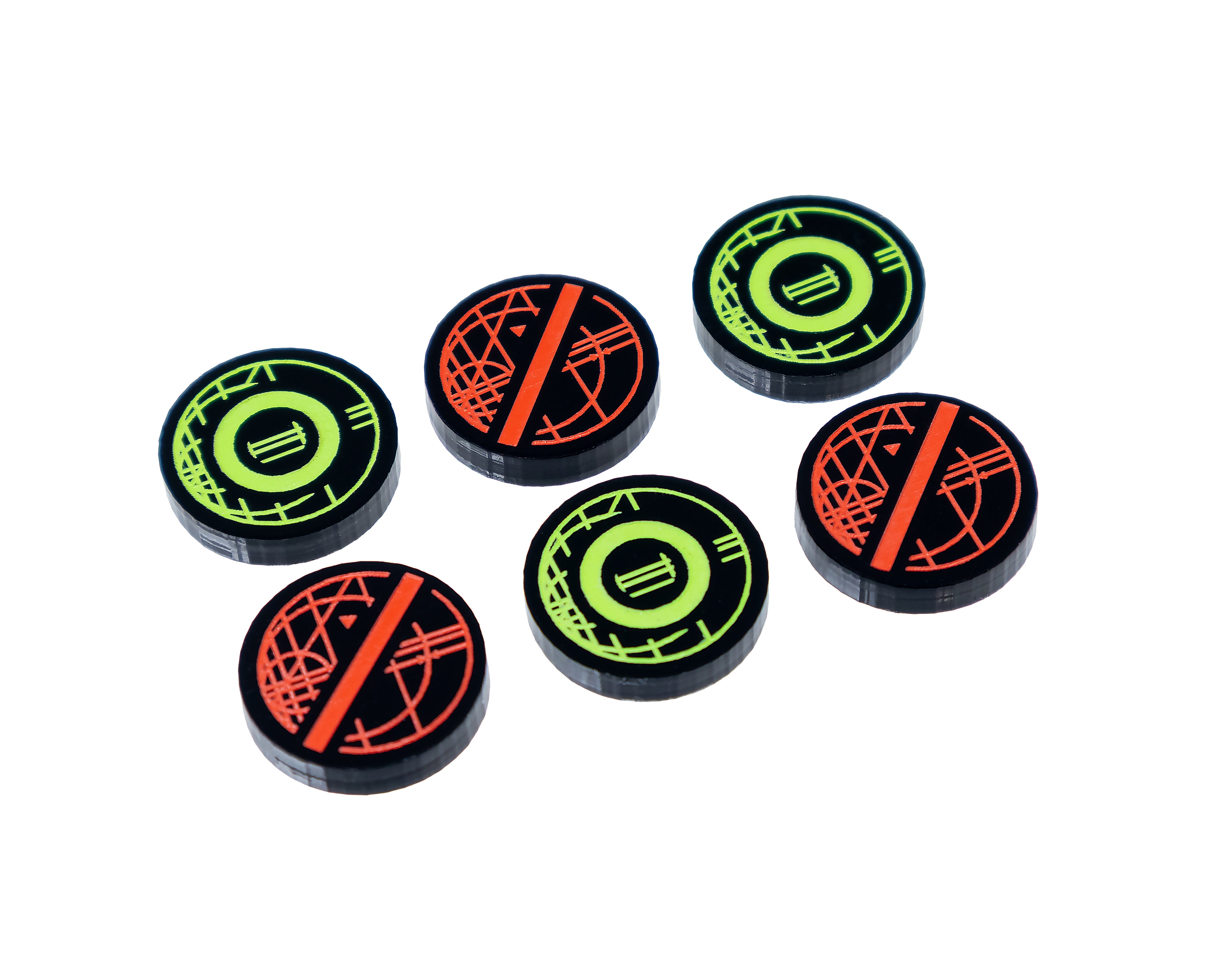 - 6 x Ready / Exhausted tokens, etched and cut from black opaque 3mm acrylic. Painted green on one side and red on the reverse and measuring 16mm in diameter