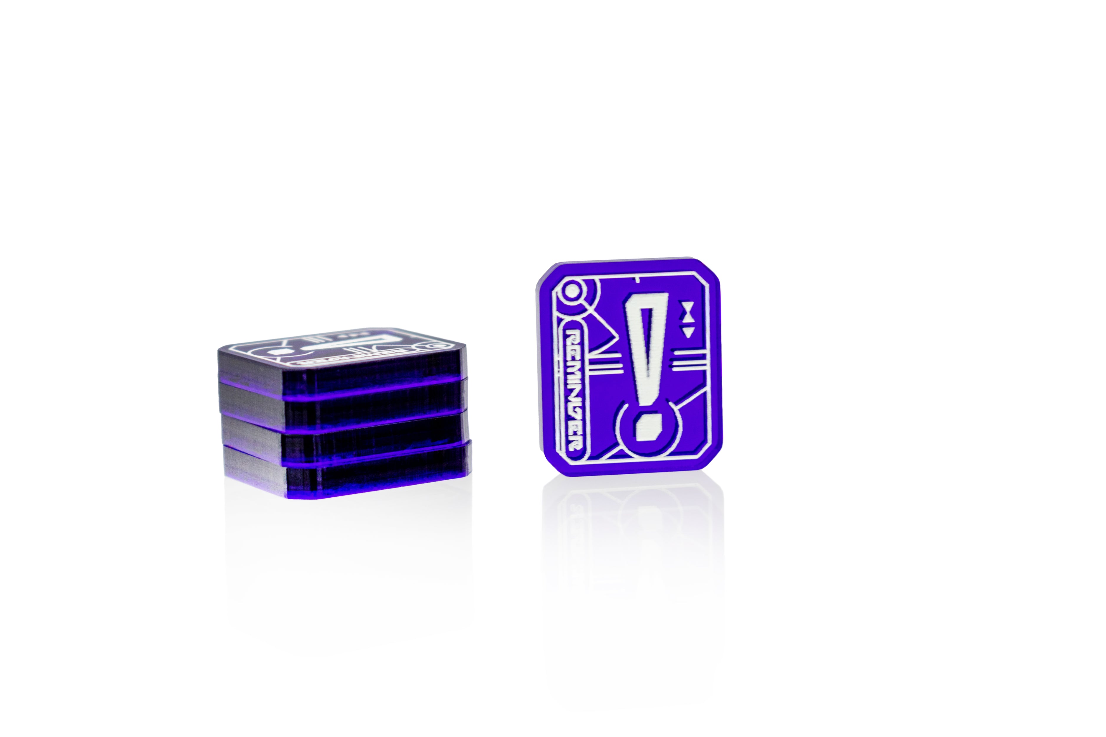 - 5 x Reminder tokens, etched and cut from purple translucent 3mm acrylic. Painted white on both sides and measuring 17mm x 20mm