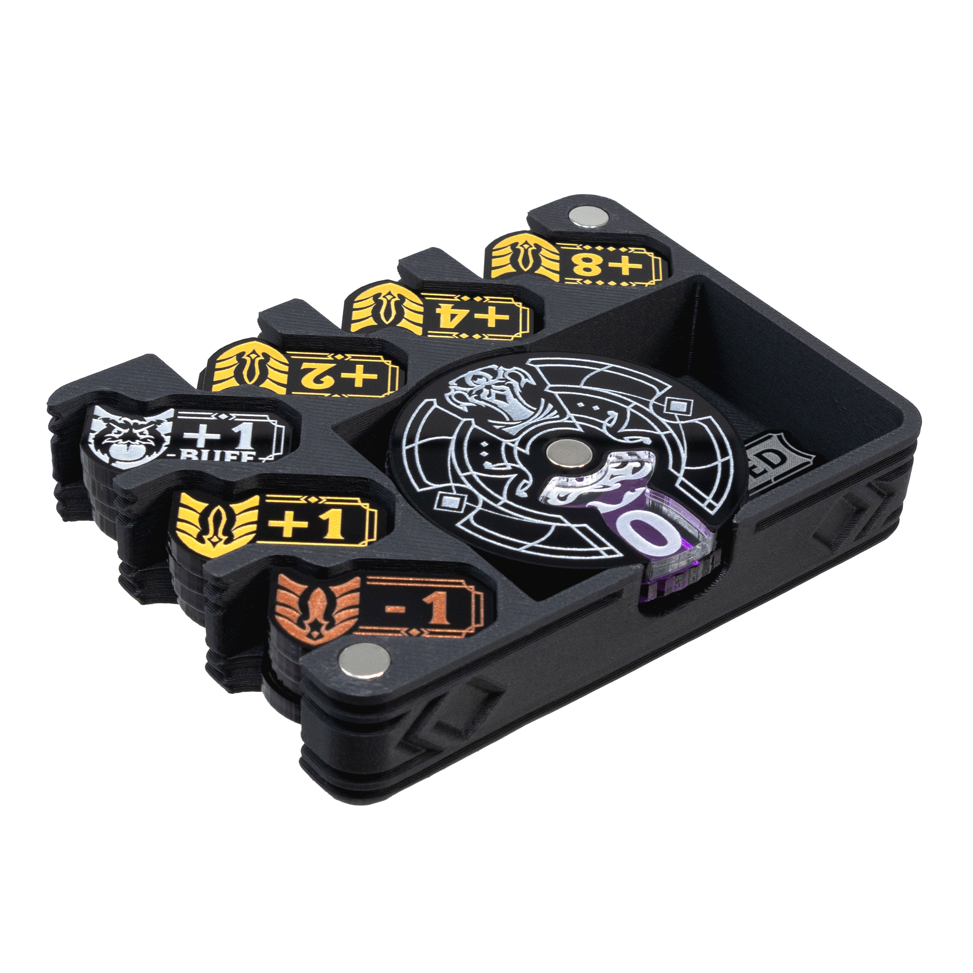 - 4 x Might Modifier -1/-2 Tokens, double sided, etched and cut from black 3mm acrylic, painted copper and measuring 26mm x 14mm.