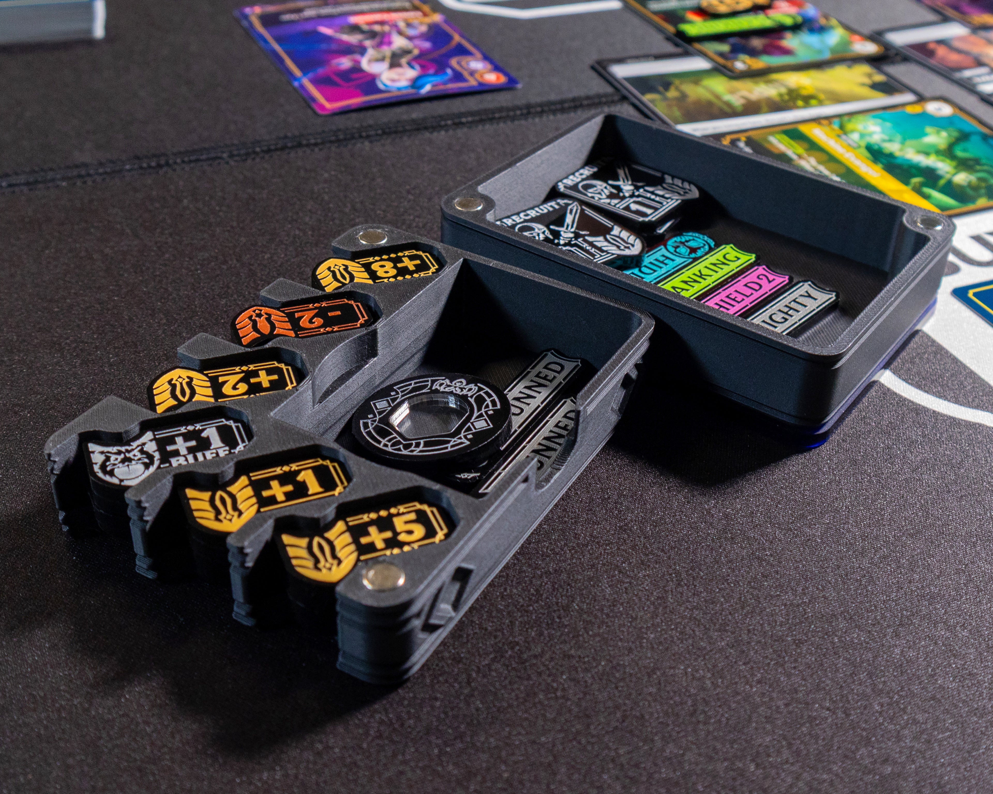- 1 x Token Organiser, 3d printed from Black PLA, with choice of frosted acrylic colour cover, measuring 93mm x 70mm x 22mm OR 40mm (dependent on chosen option)