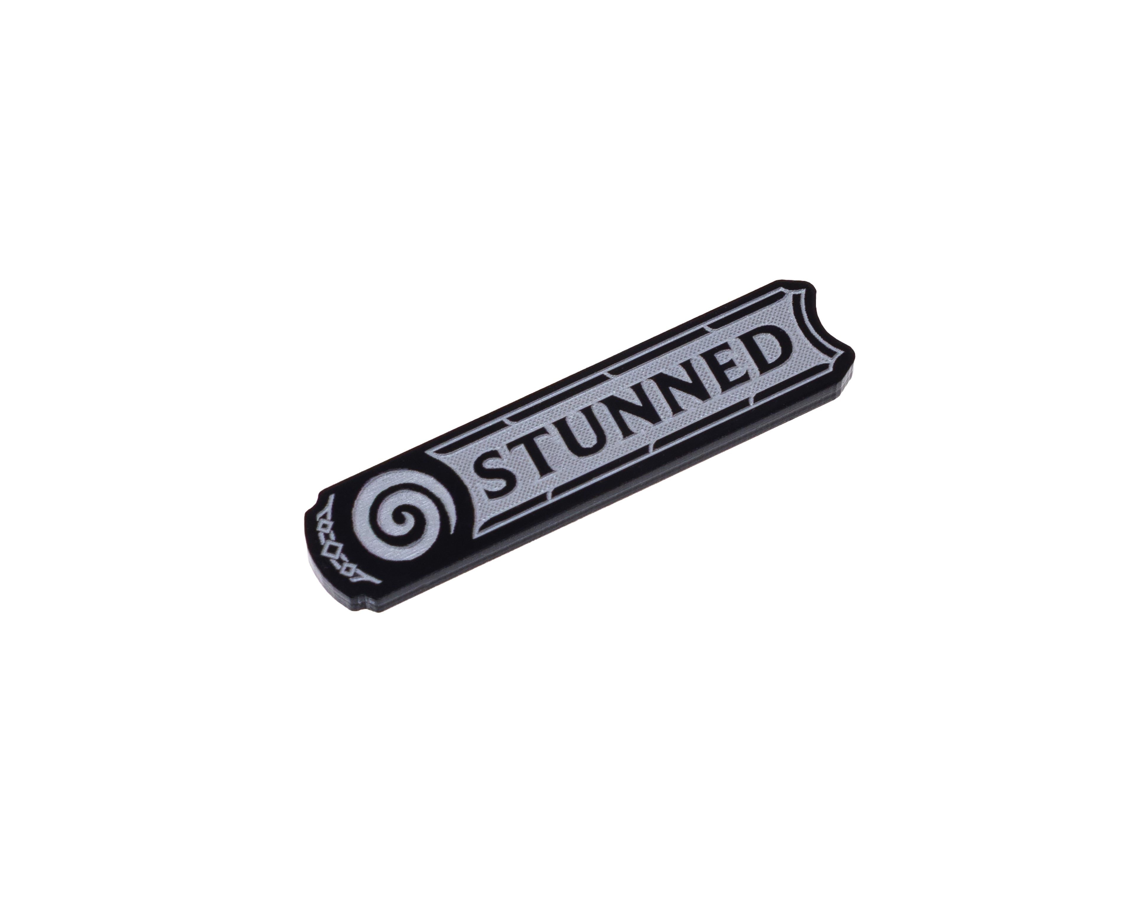 - 2 x Stunned Tokens, double sided, etched and cut from black 3mm acrylic, painted grey and measuring 46mm x 10mm.