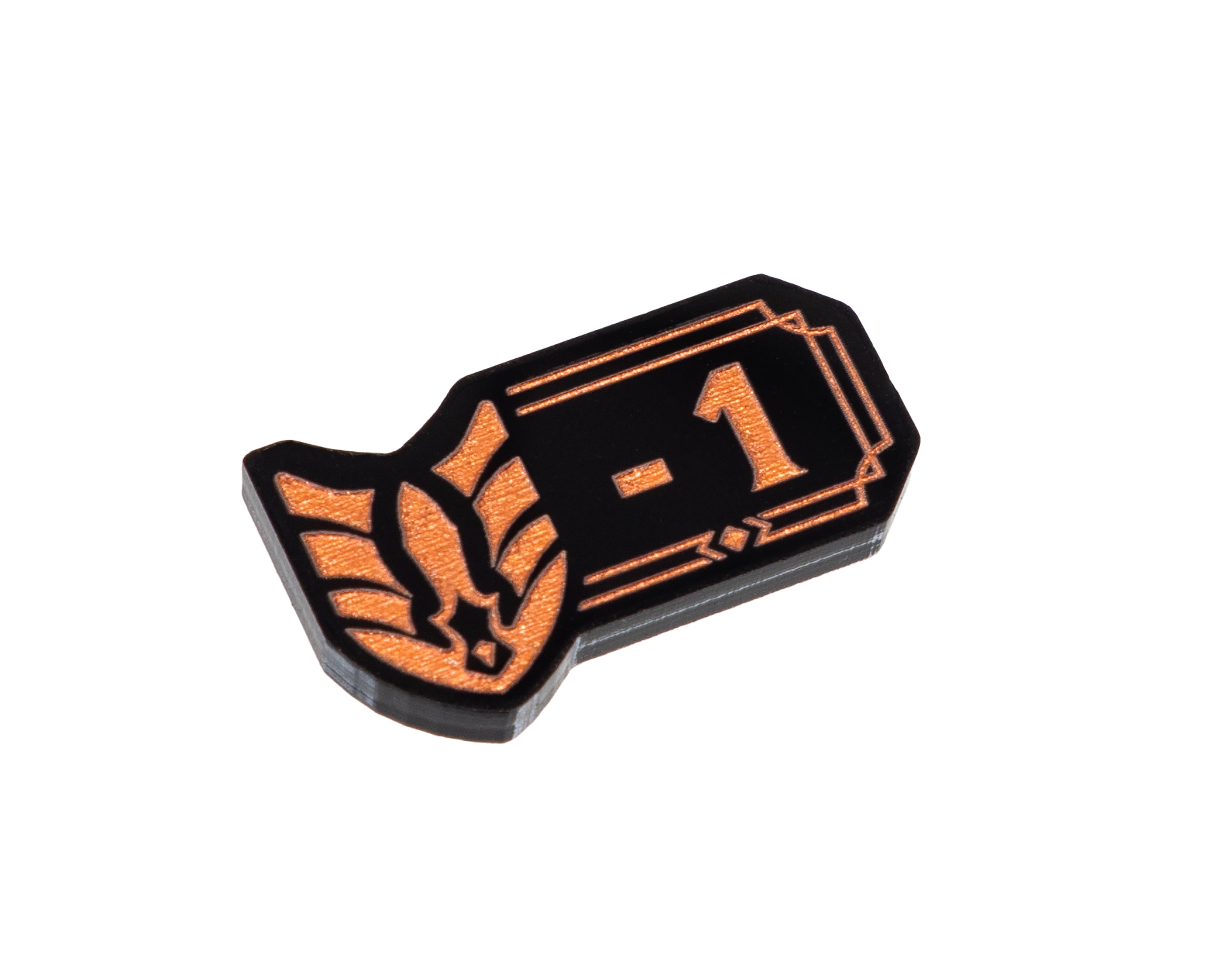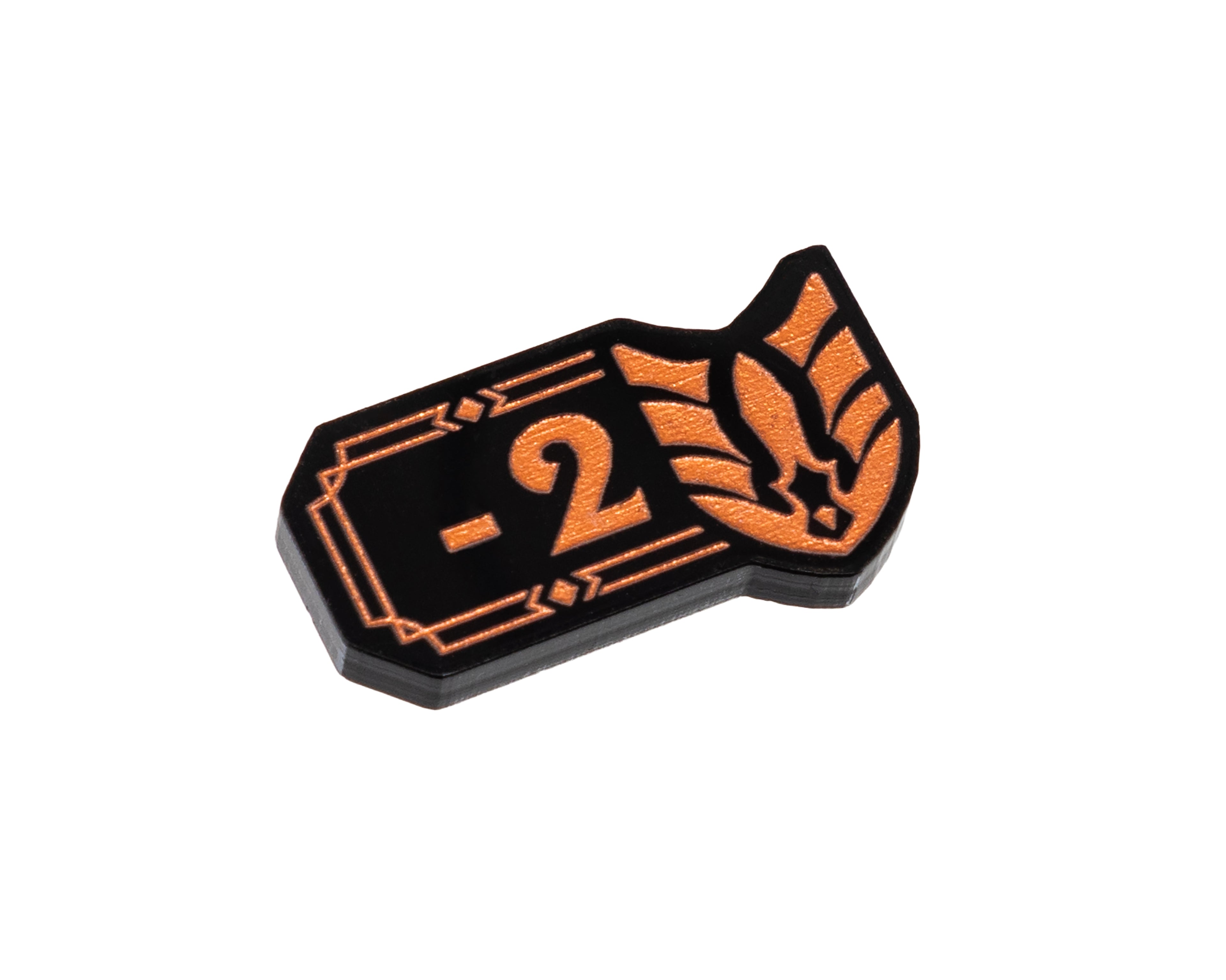 - 4 x Might Modifier -1/-2 Tokens, double sided, etched and cut from black 3mm acrylic, painted copper and measuring 26mm x 14mm.