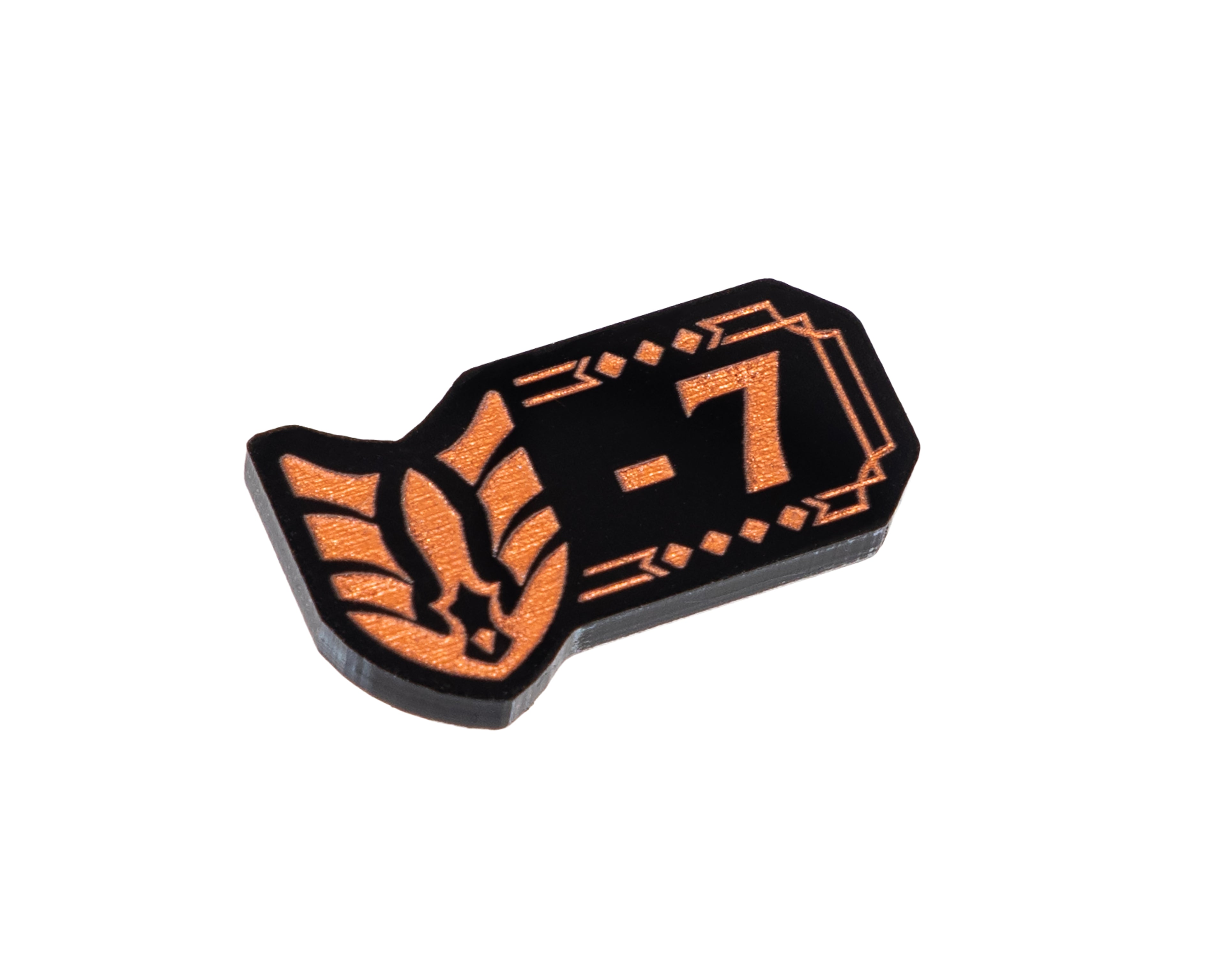 - 1 x Might Modifier -7/-8 Token, double sided, etched and cut from black 3mm acrylic, painted bright copper and measuring 26mm x 14mm.