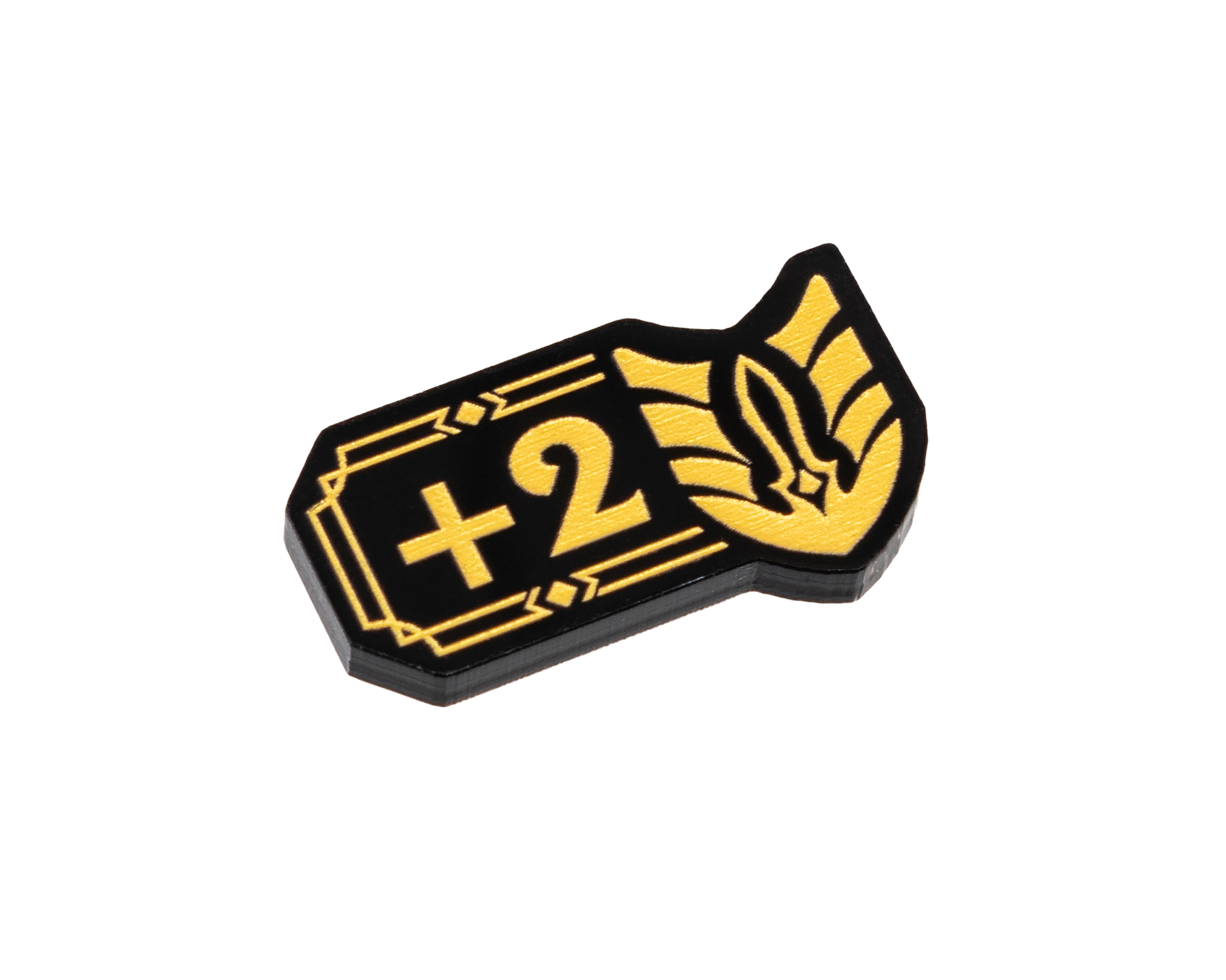 - 1 x Might Modifier +7/+8 Token, double sided, etched and cut from black 3mm acrylic, painted bright gold and measuring 26mm x 14mm.