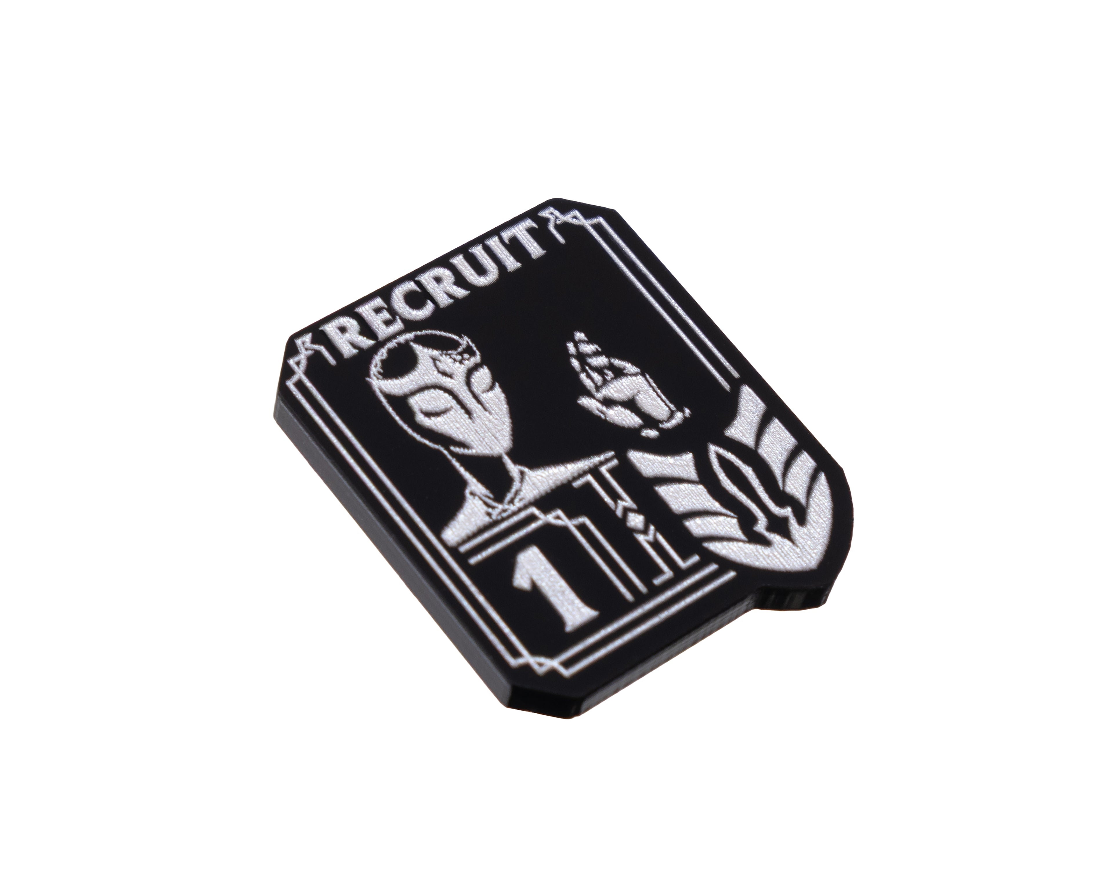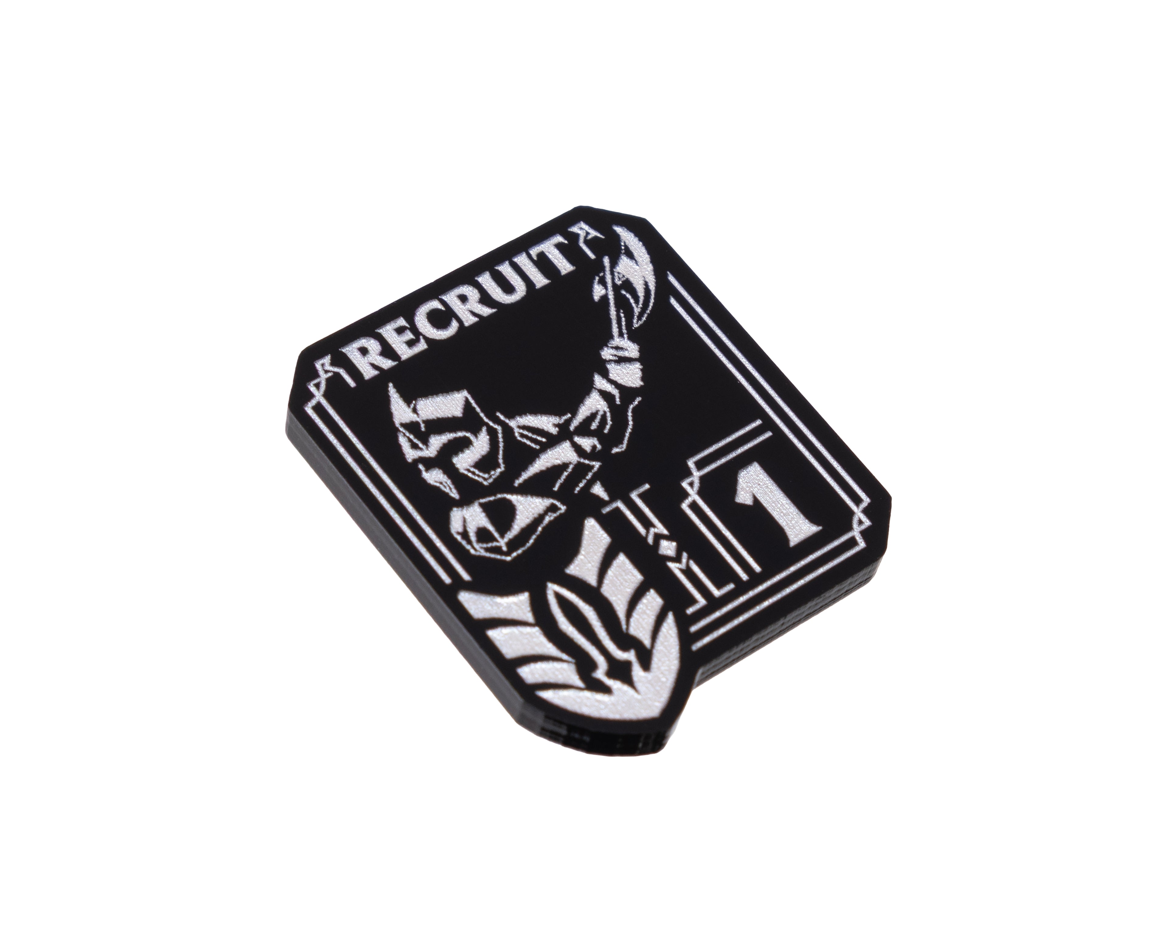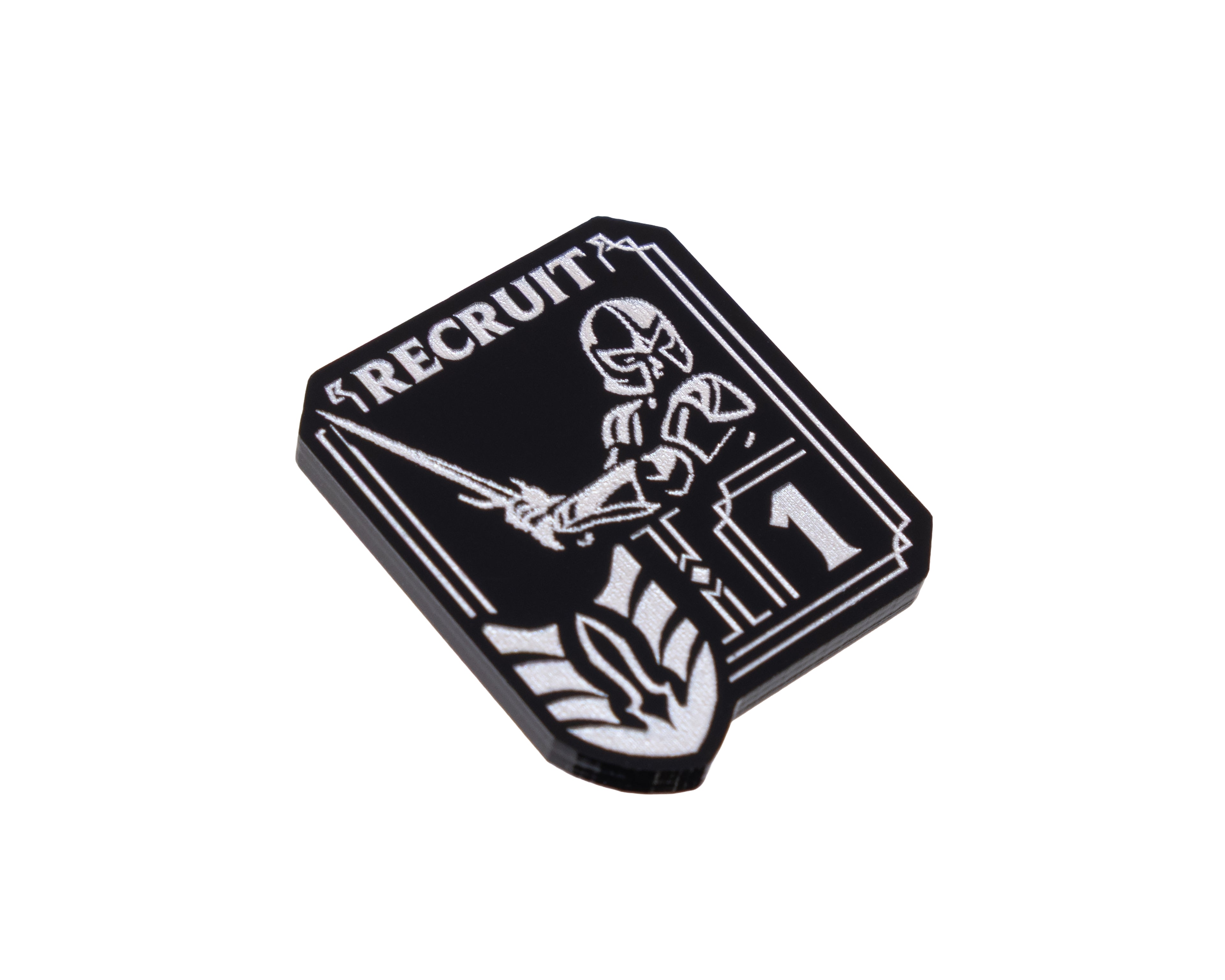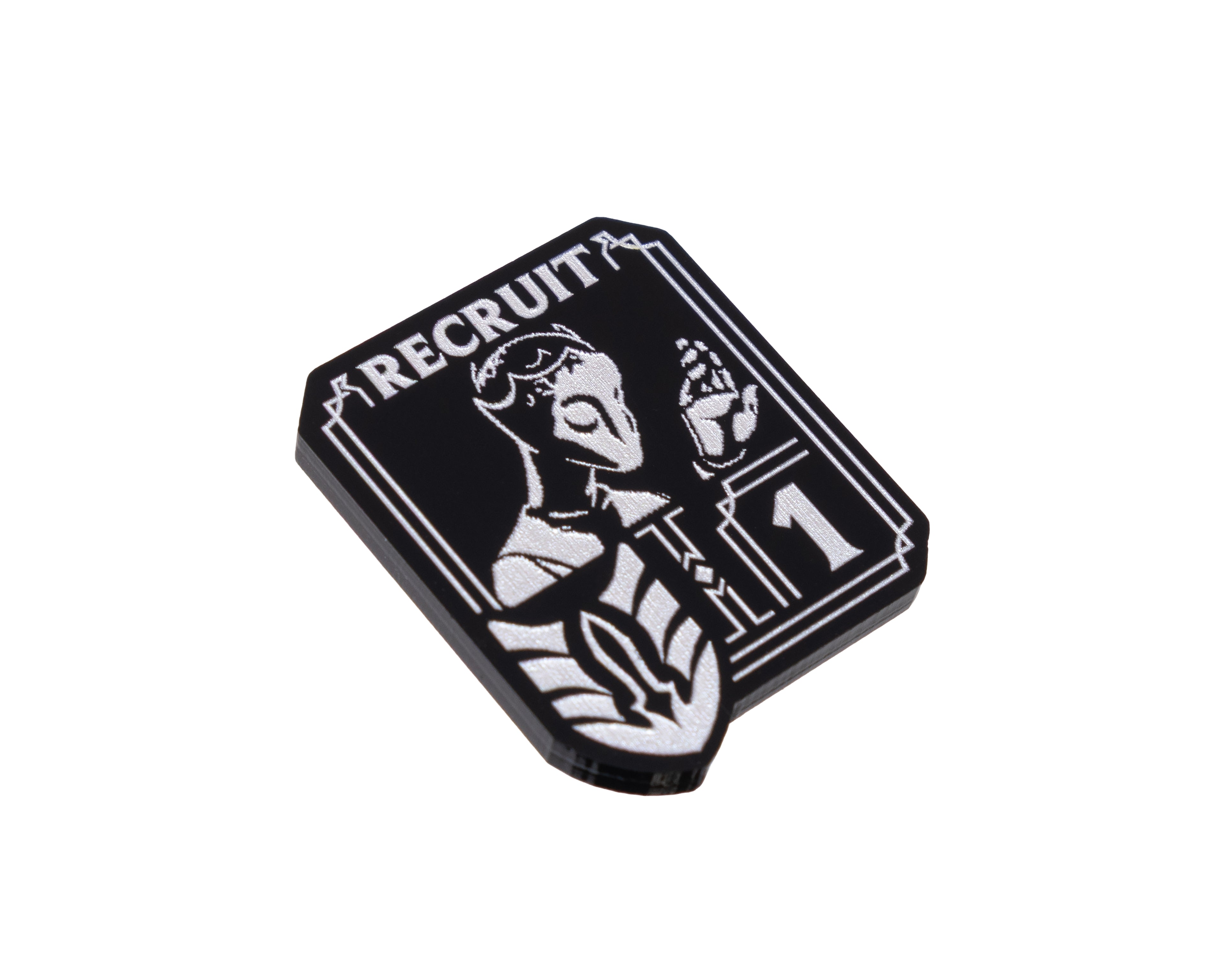 - 1 x Unit Token, etched and cut from black 3mm acrylic and painted pearl silver OR blue (dependent on chosen option). Measuring 26mm x 31mm.