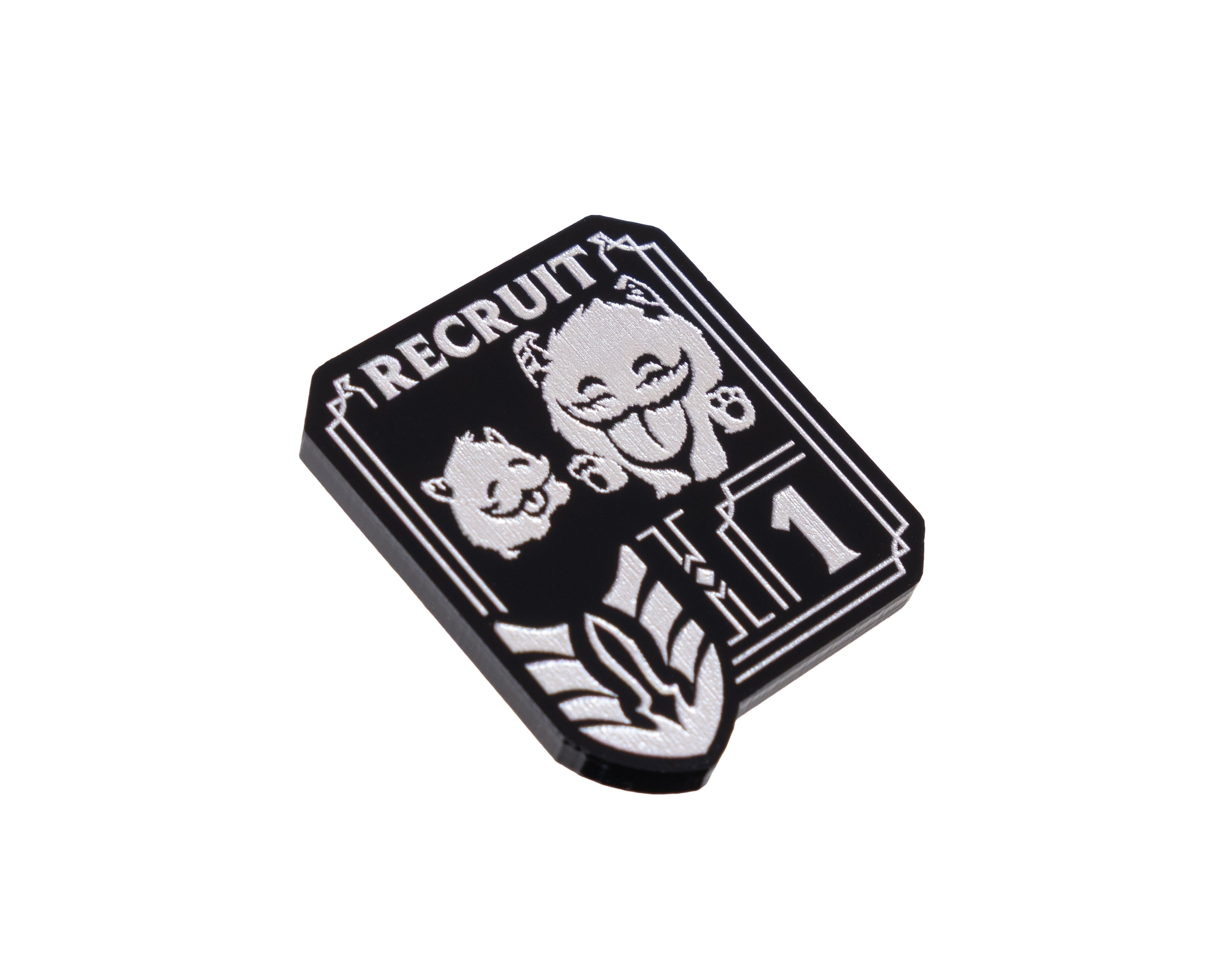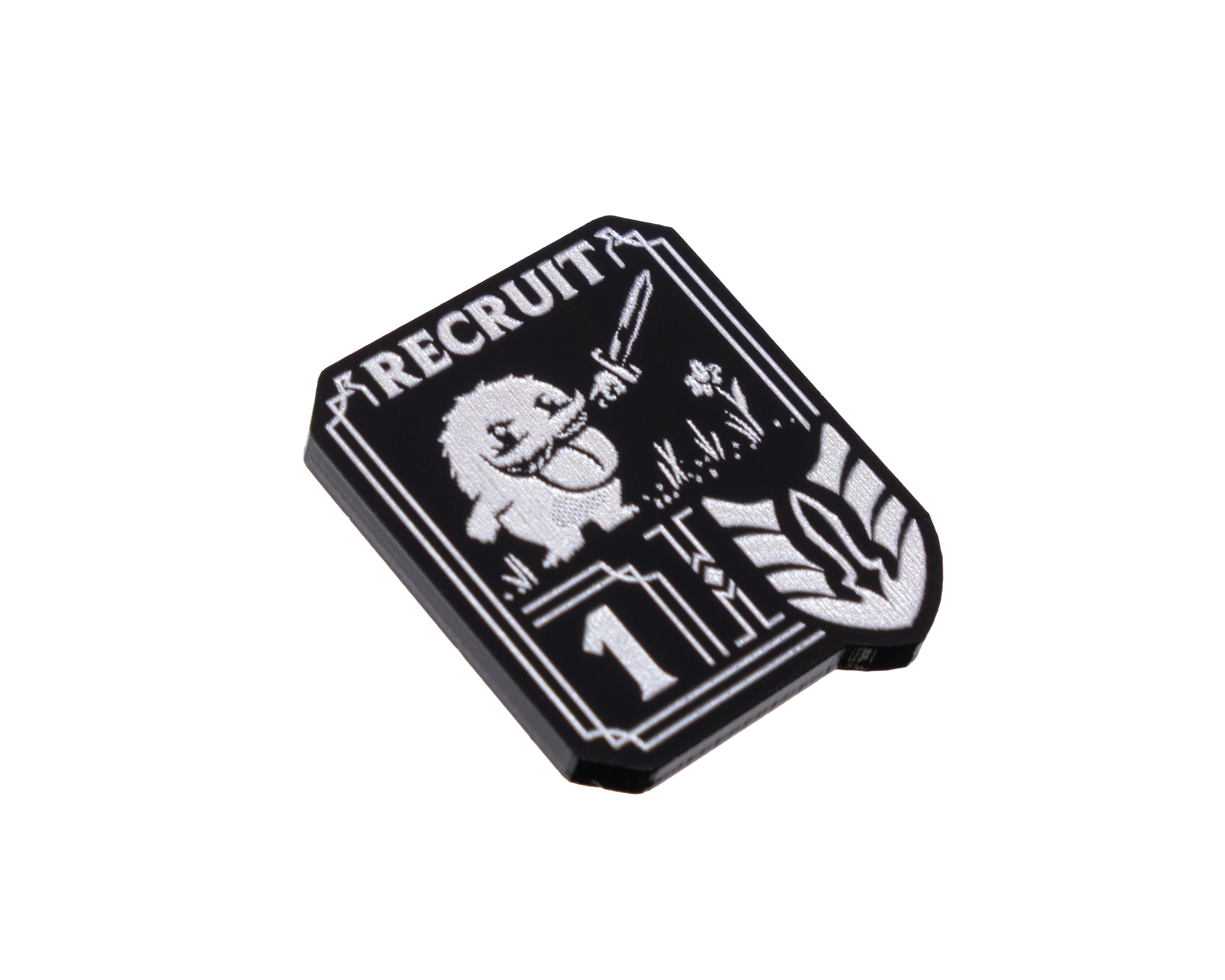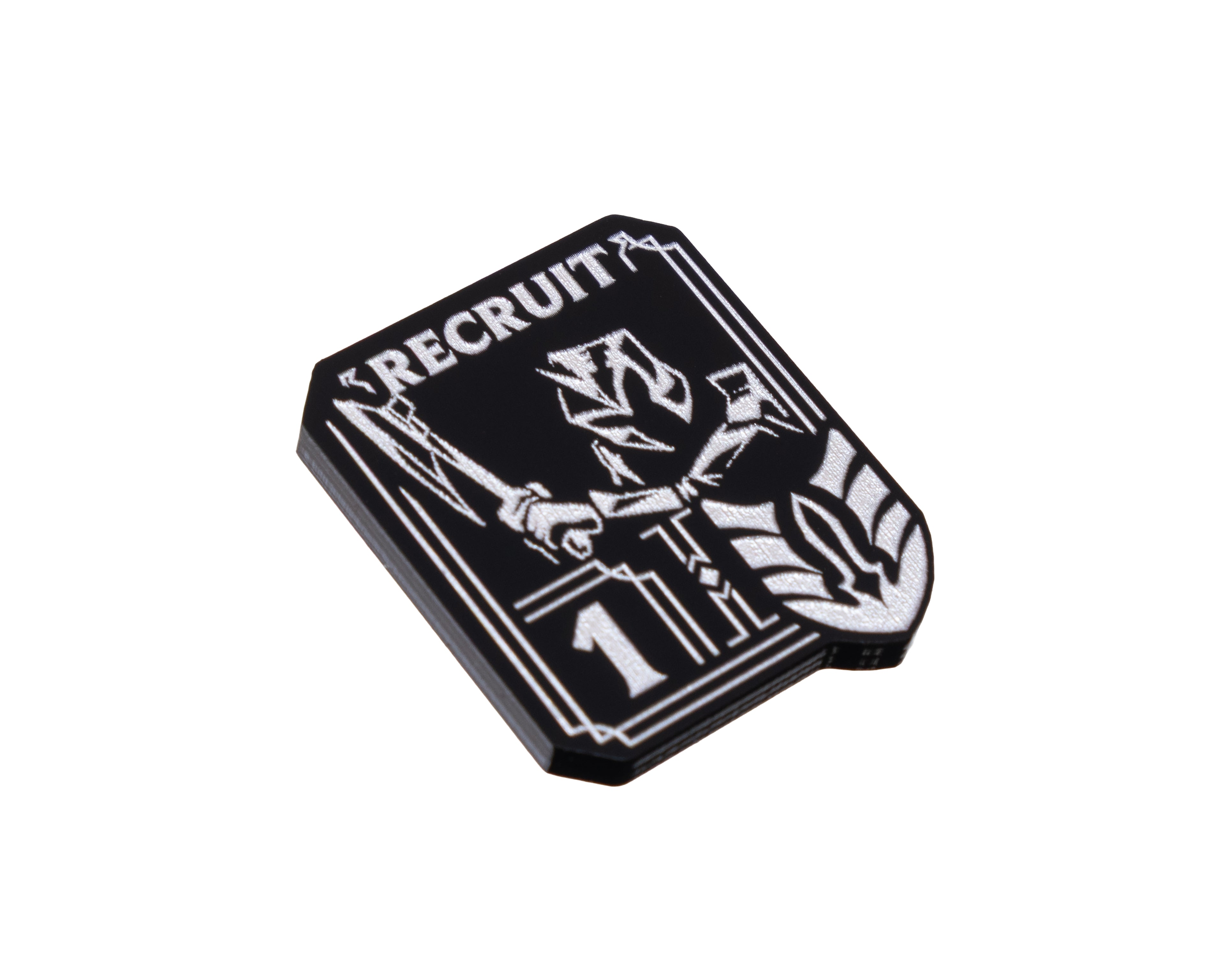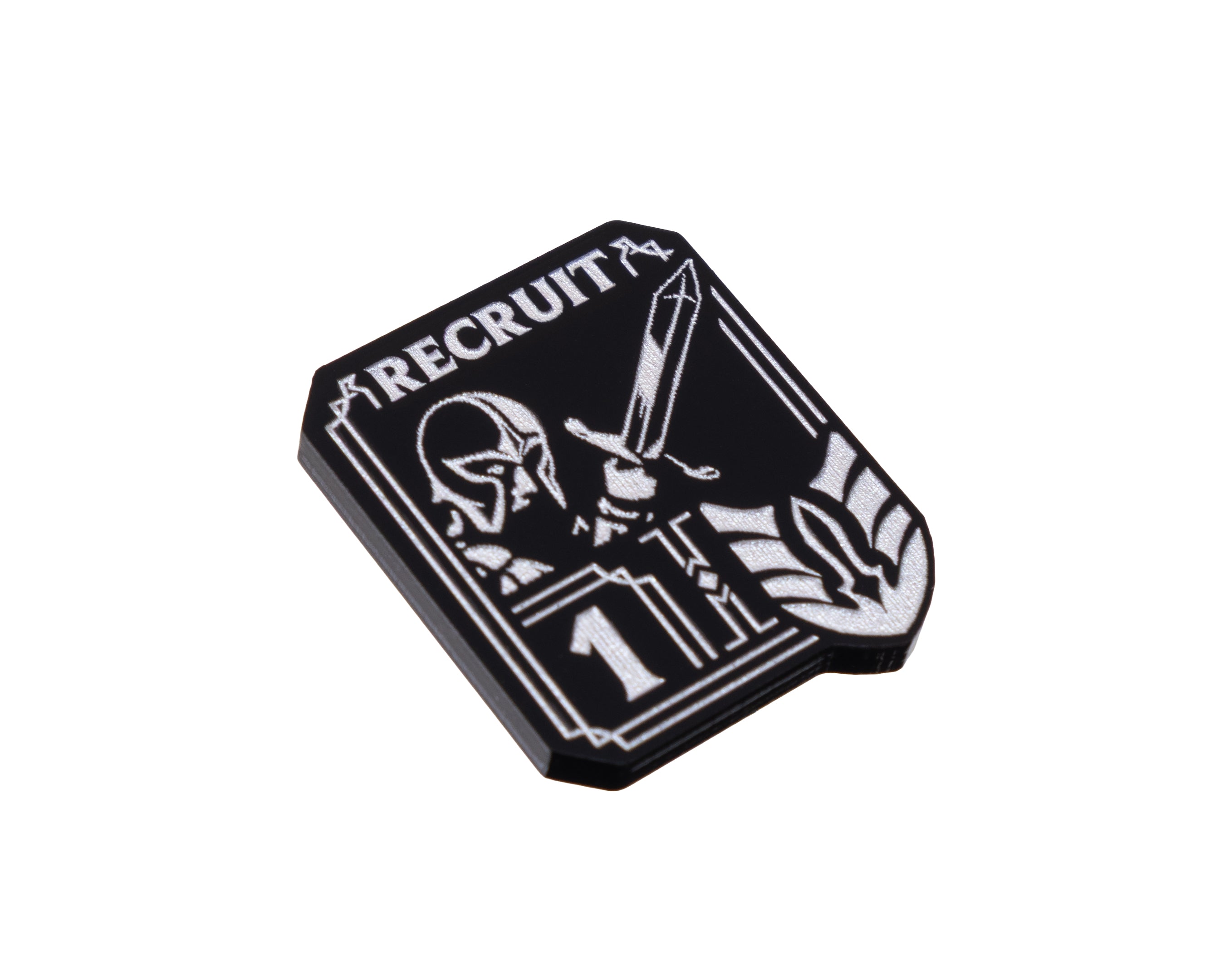 - 1 x Unit Token, etched and cut from black 3mm acrylic and painted pearl silver OR blue (dependent on chosen option). Measuring 26mm x 31mm.