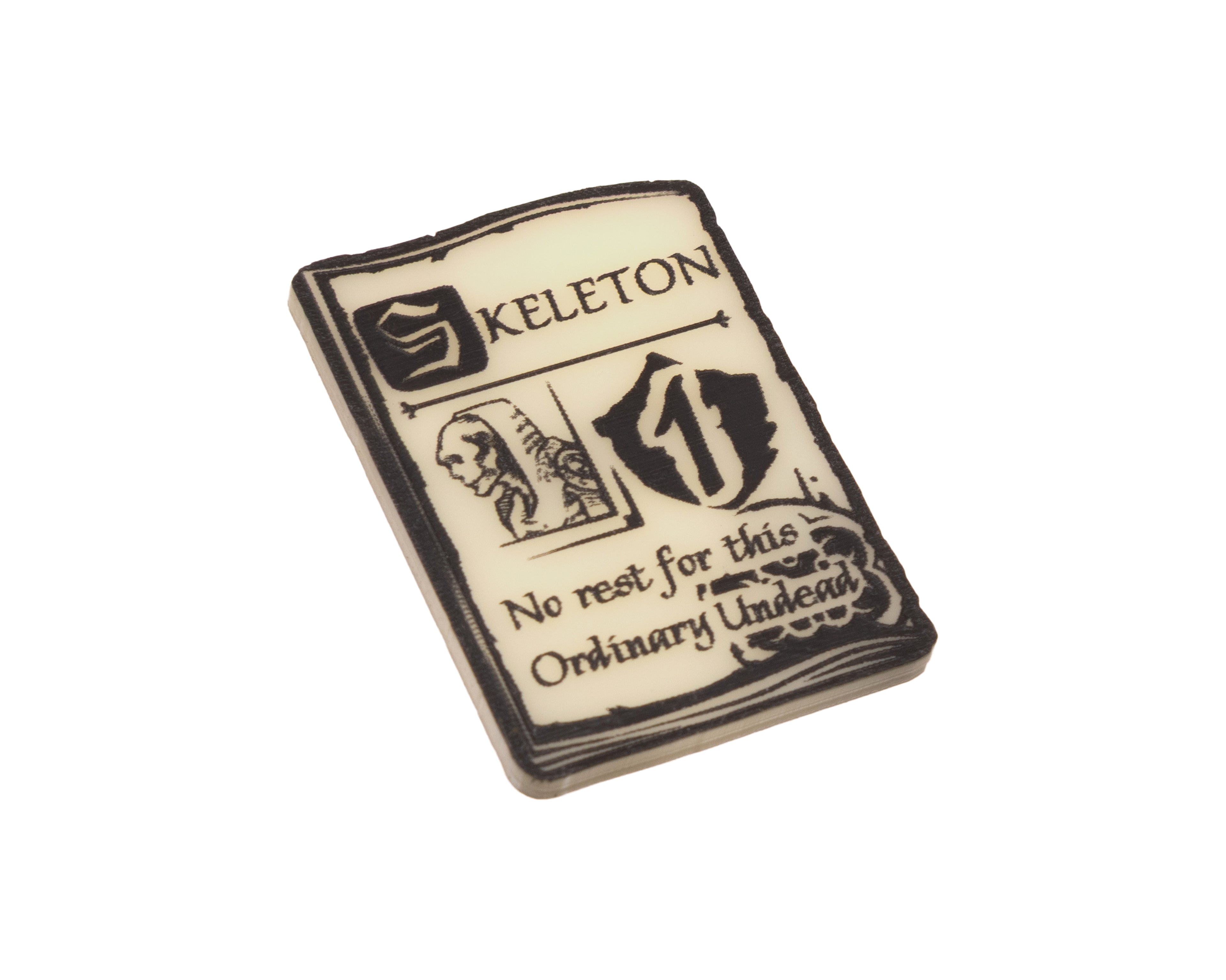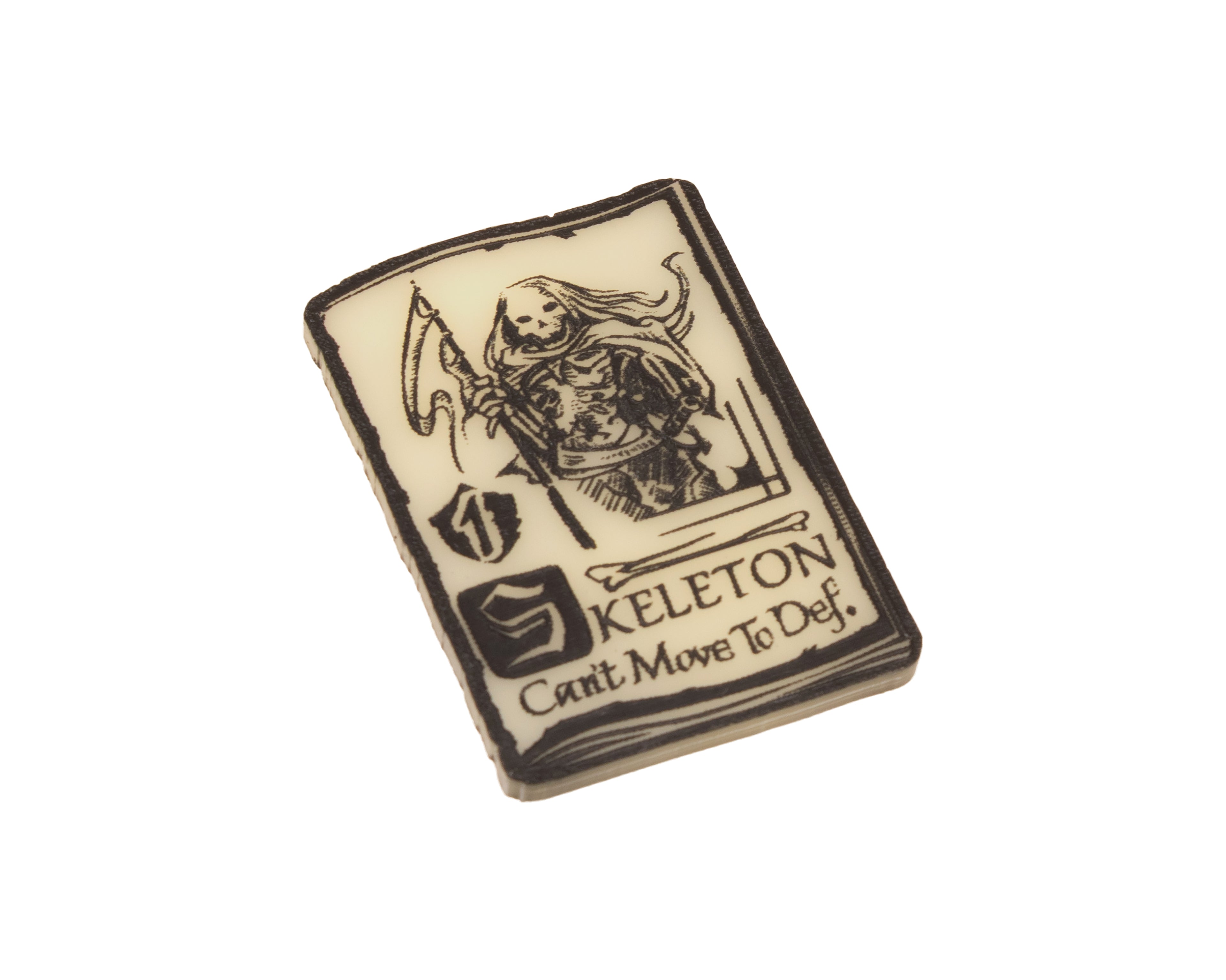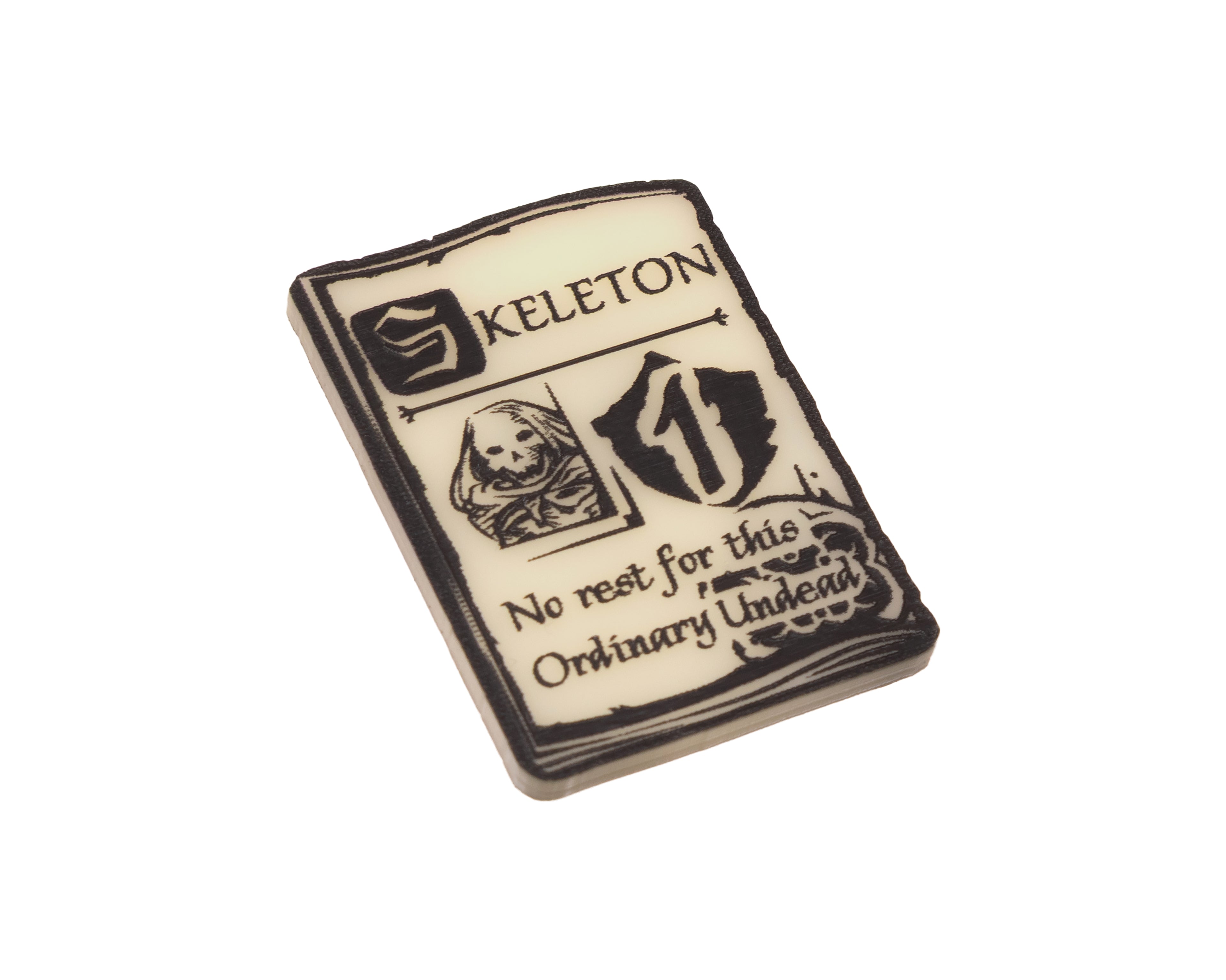 - 4 x Skeleton Unit Tokens, etched and cut from Ivory acrylic, etched on both sides and painted black. Measuring approximately 44mm x 31mm.