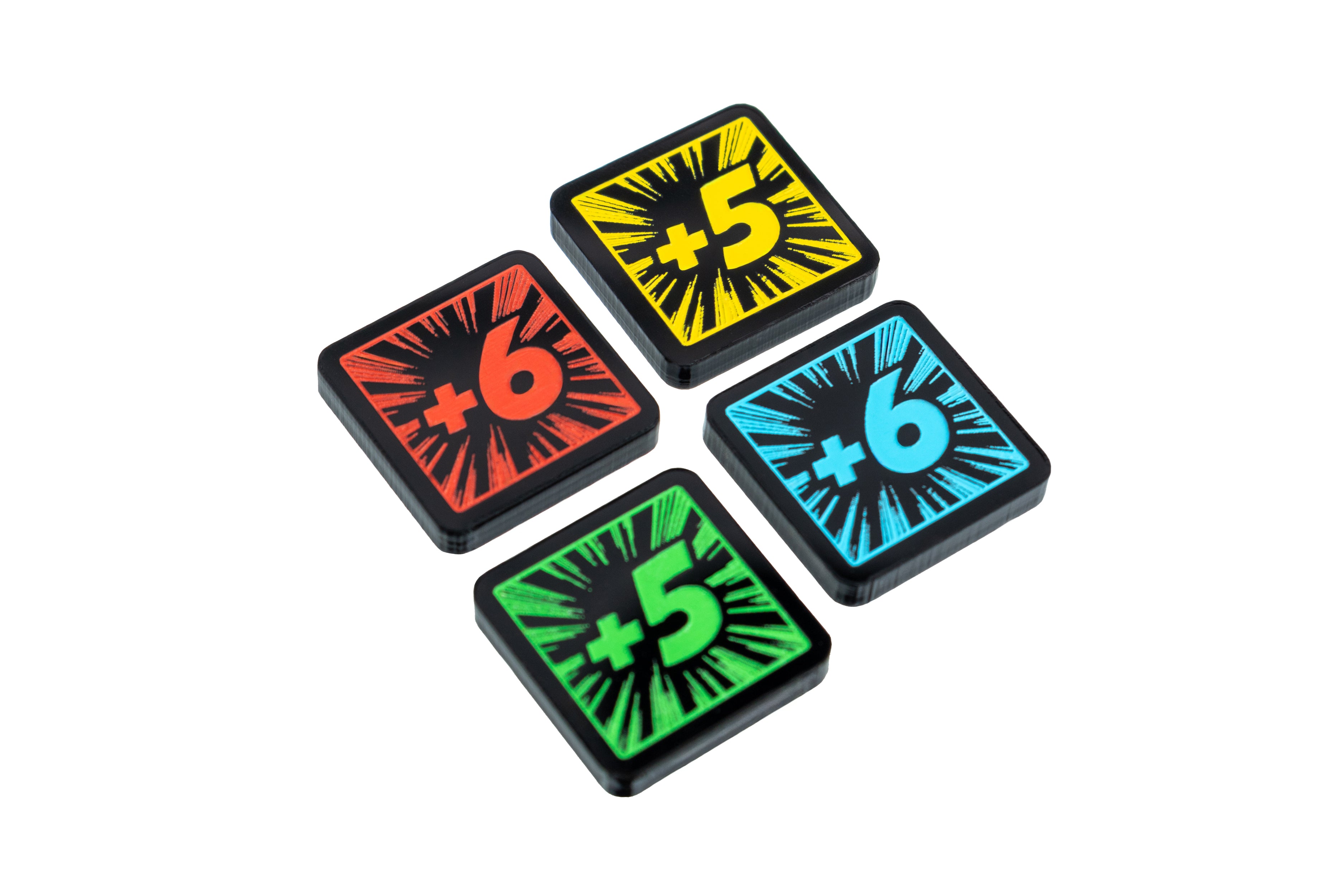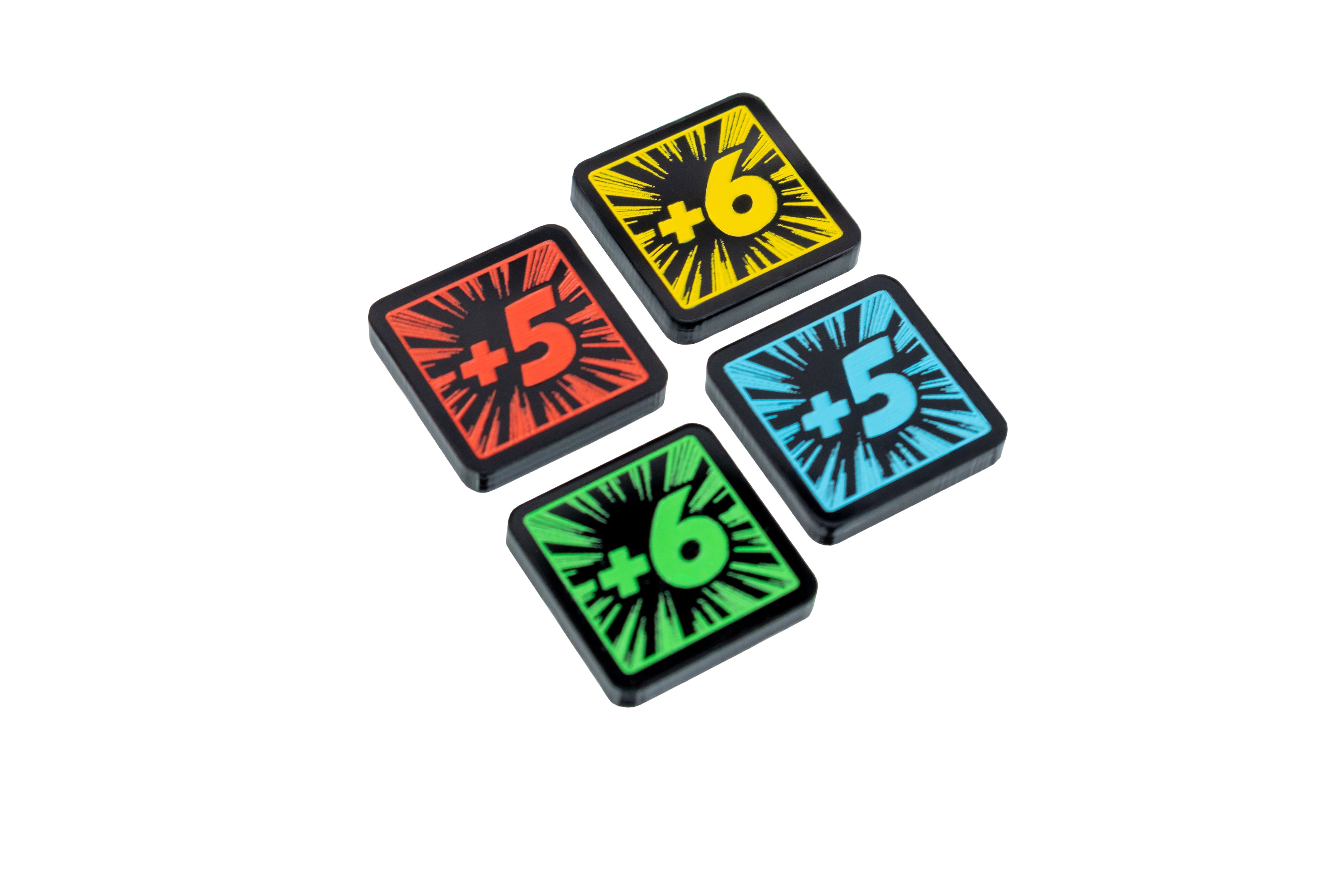 - 4 x Stat Boost Tokens +5 /+6, double sided, painted red, green, blue and yellow, measuring 18mm x 18mm
