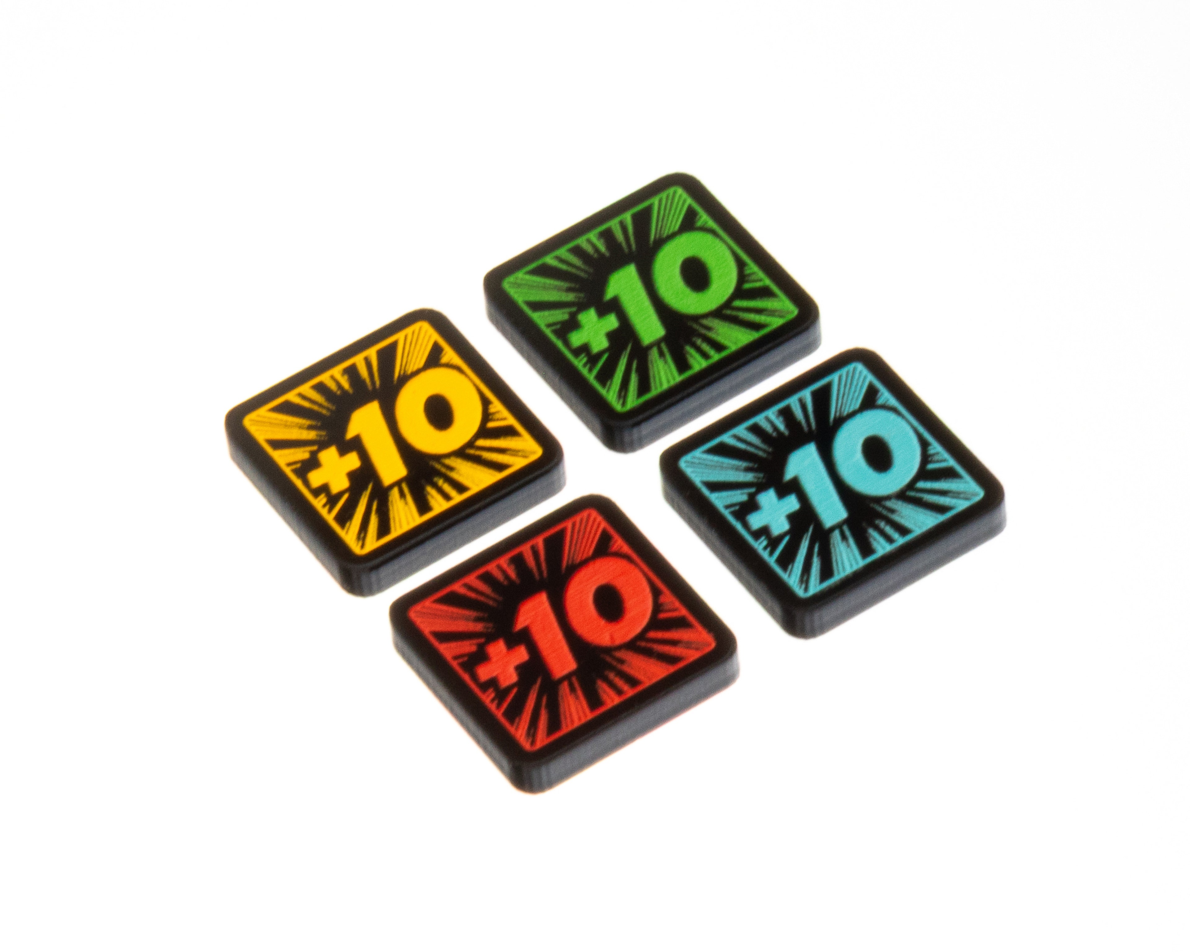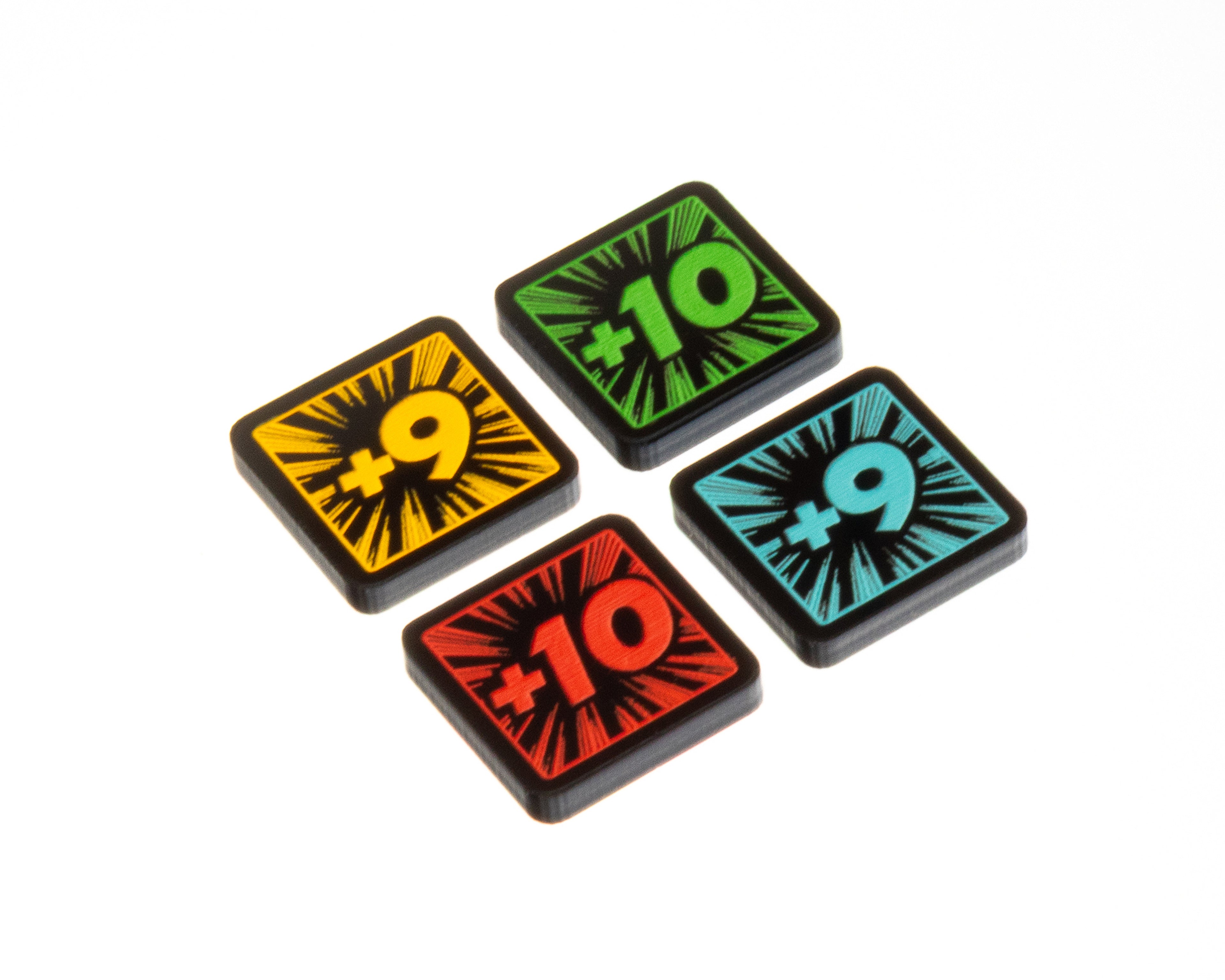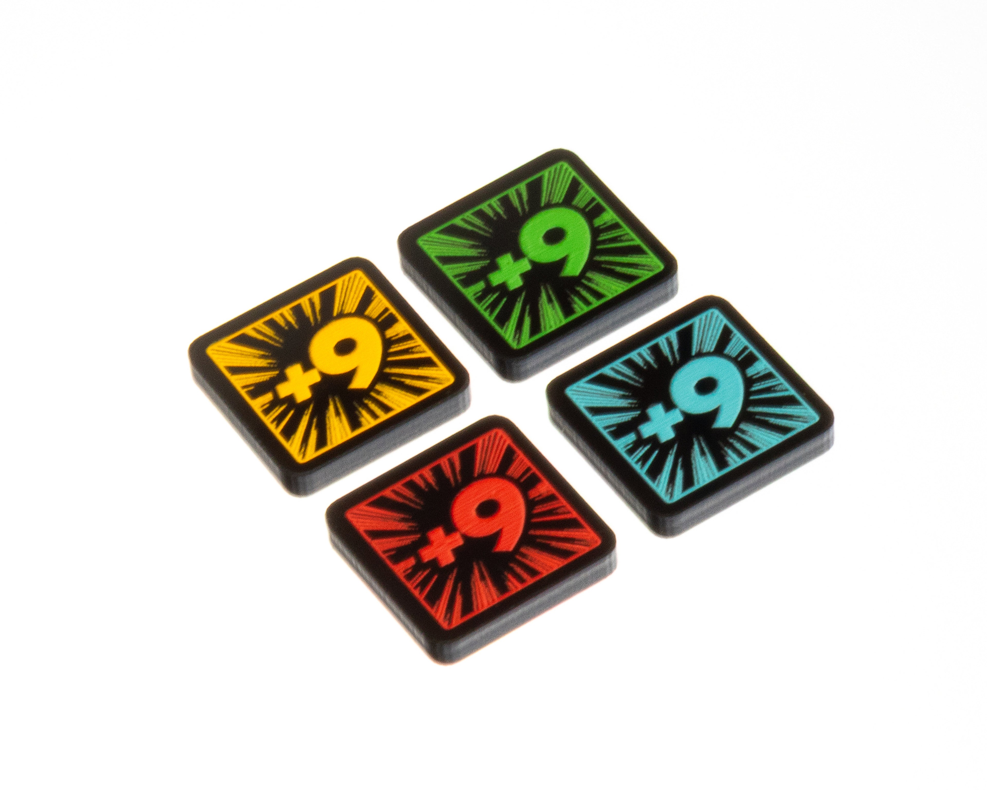 - 4 x Stat Boost Tokens +9 /+10, double sided, painted red, green, blue and yellow, measuring 18mm x 18mm