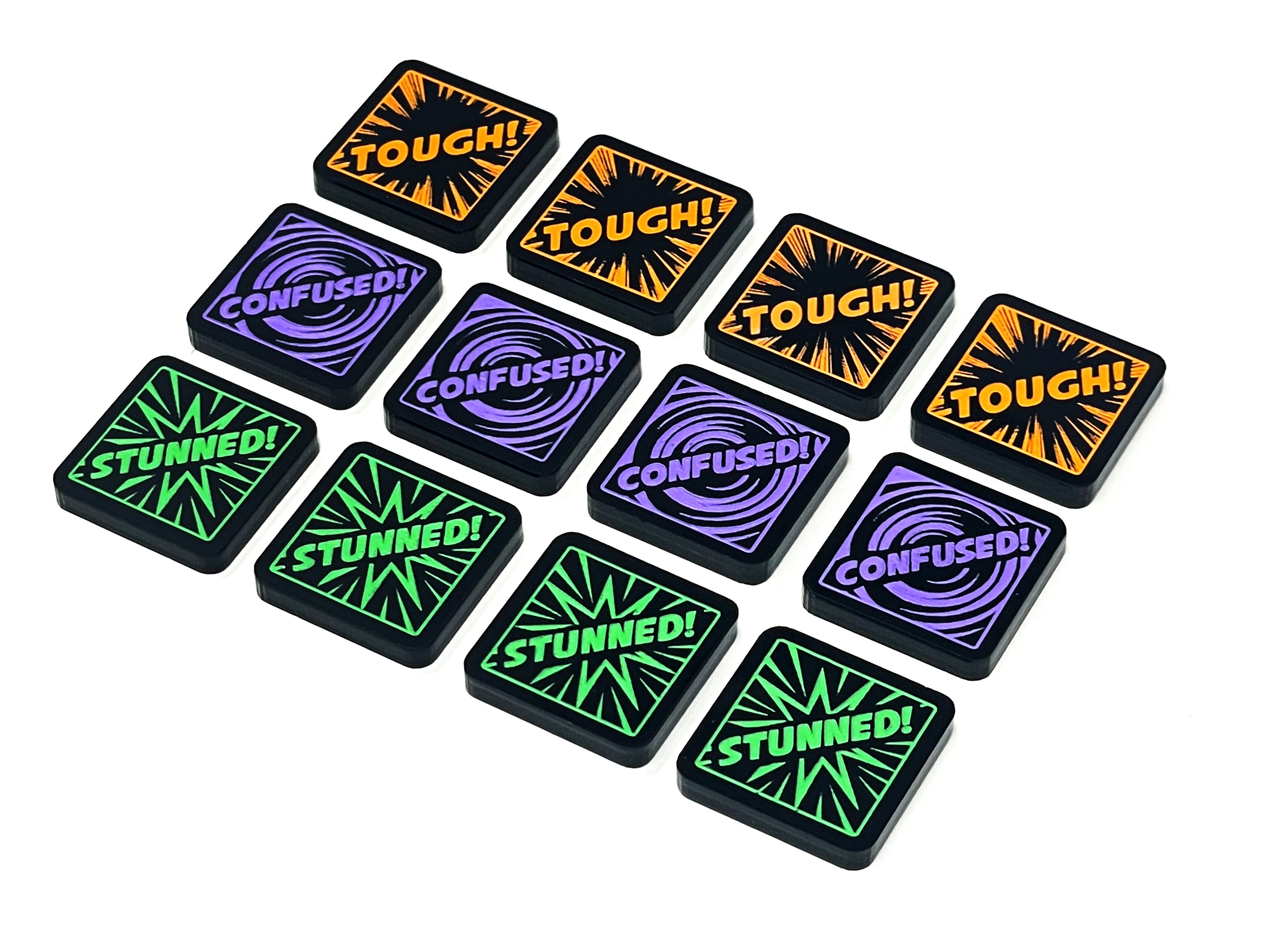 - 4 x Confused status tokens, etched and cut from black acrylic and painted purple on both sides. Measuring 18mm x 18mm