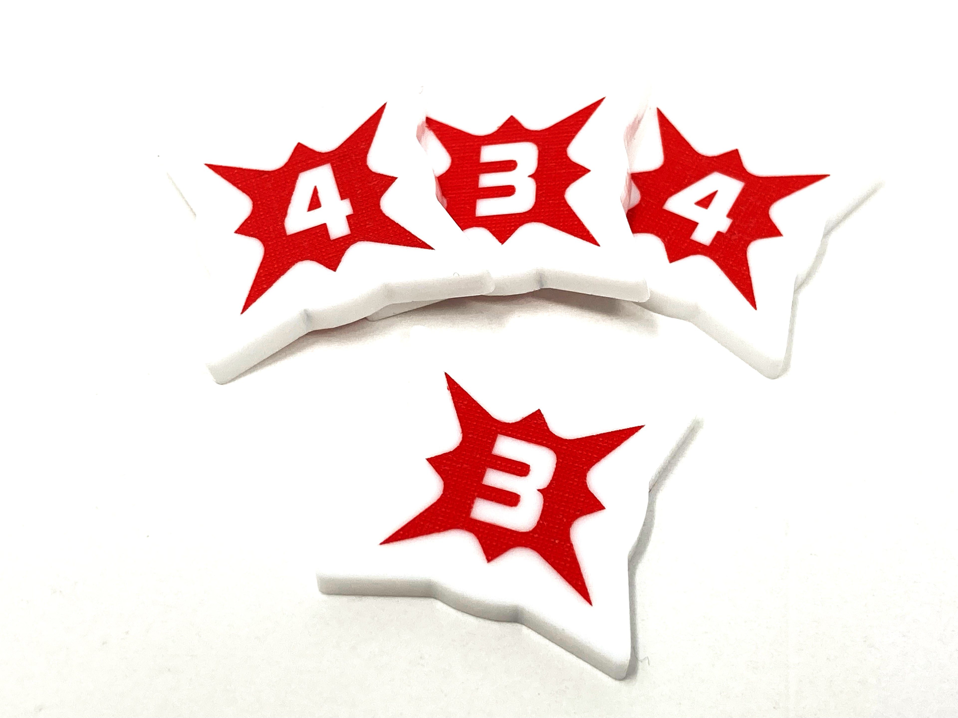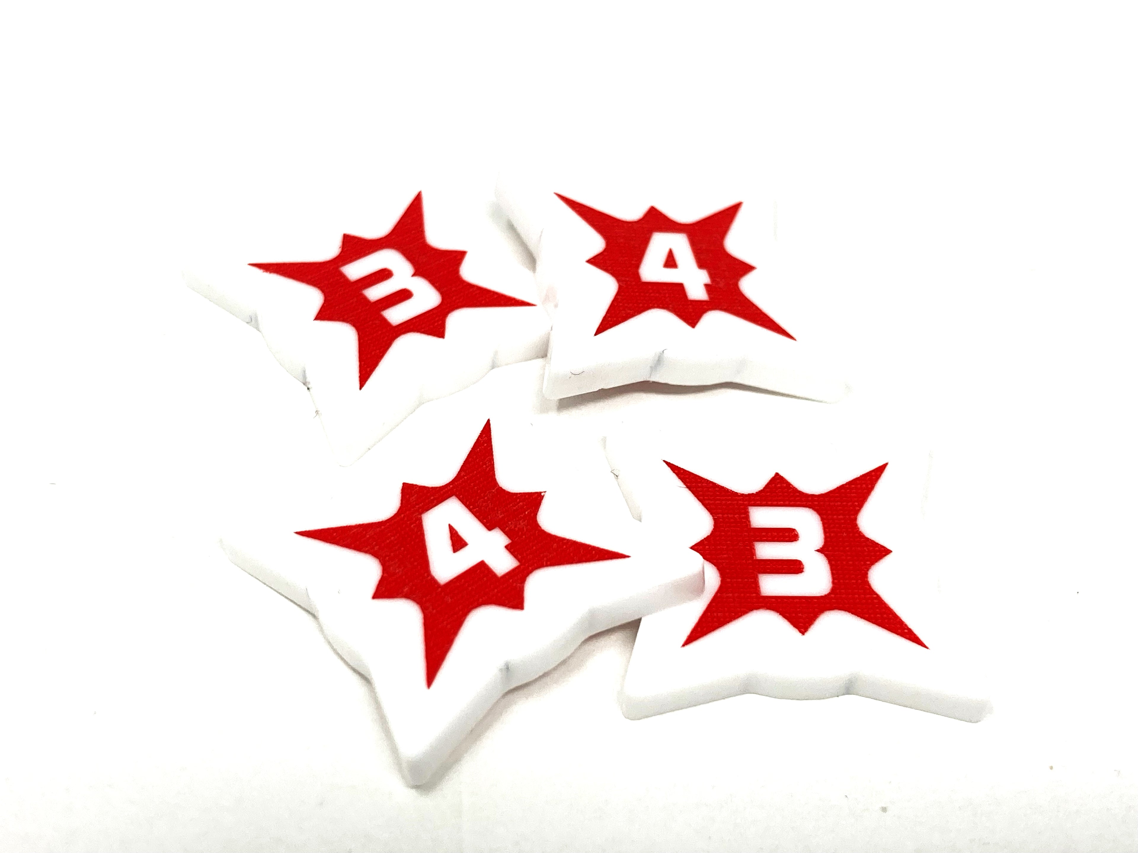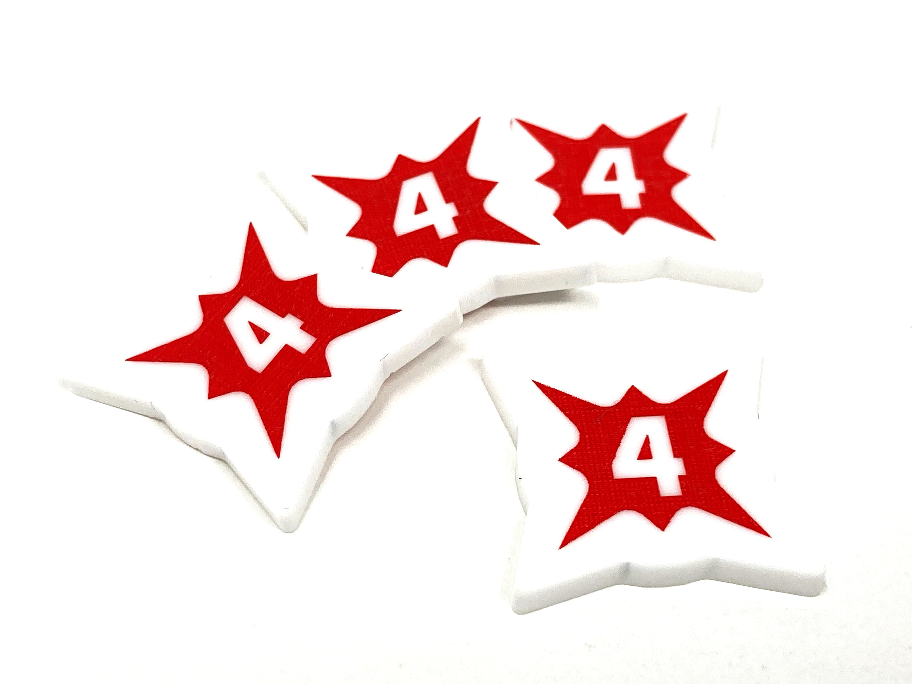 - 4 x 3/4 Wound / damage tokens (Solid white acrylic, painted red)