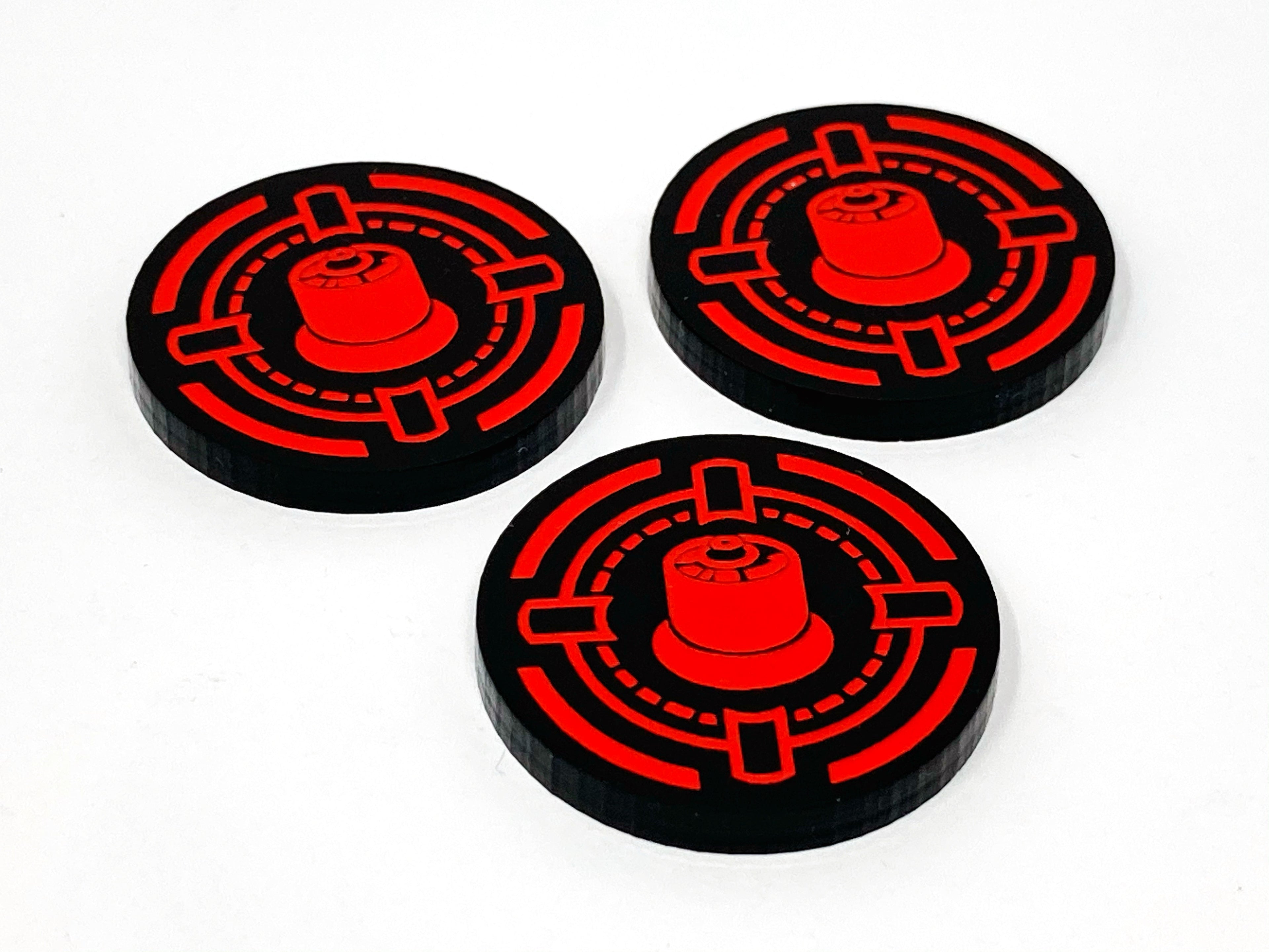 - 3 x Proton charge tokens (black acrylic, painted blue & red)