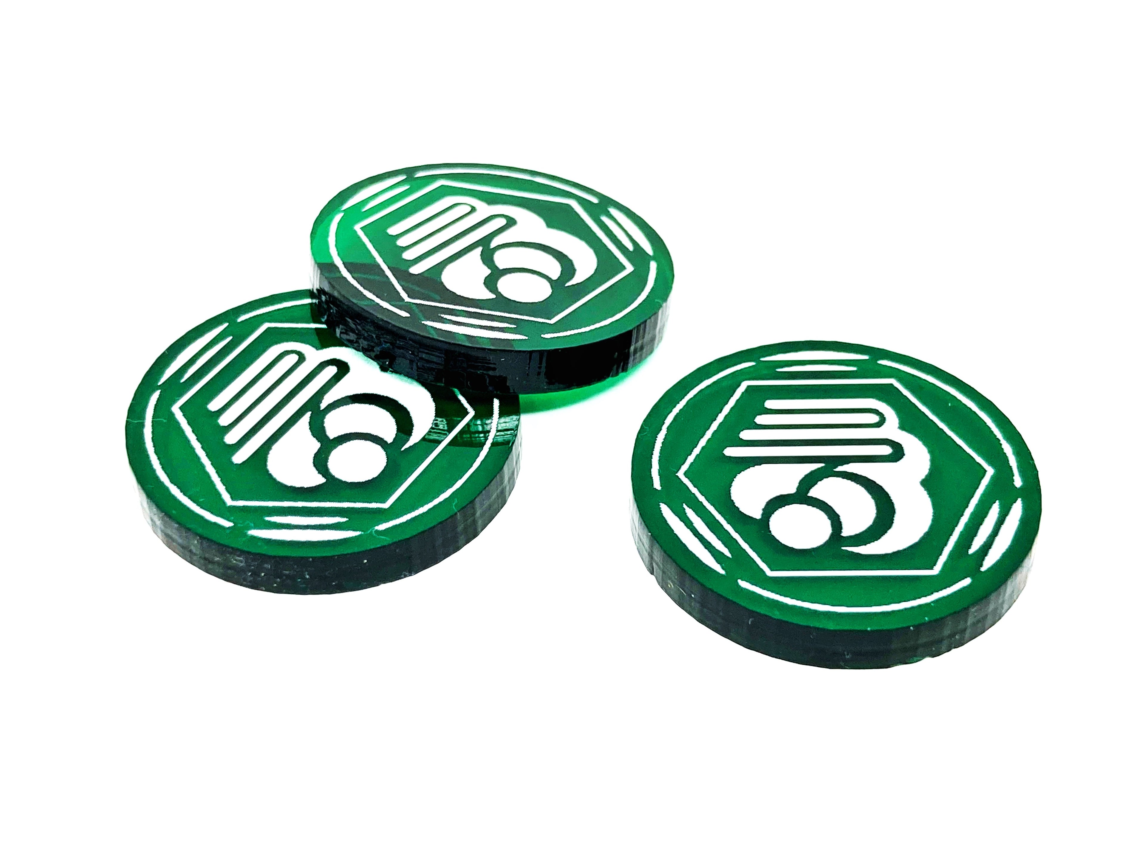 - 3 x Smoke tokens (Single sided, dark green translucent acrylic, painted white)