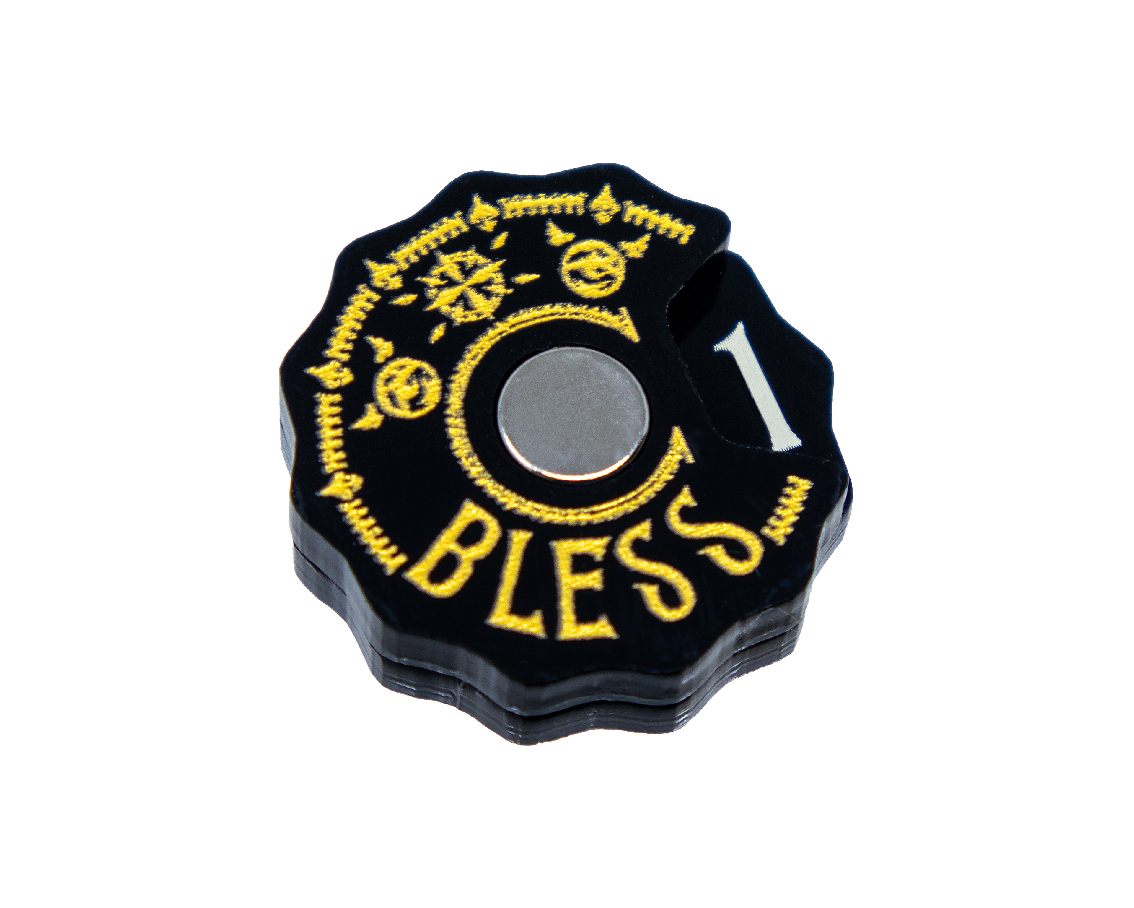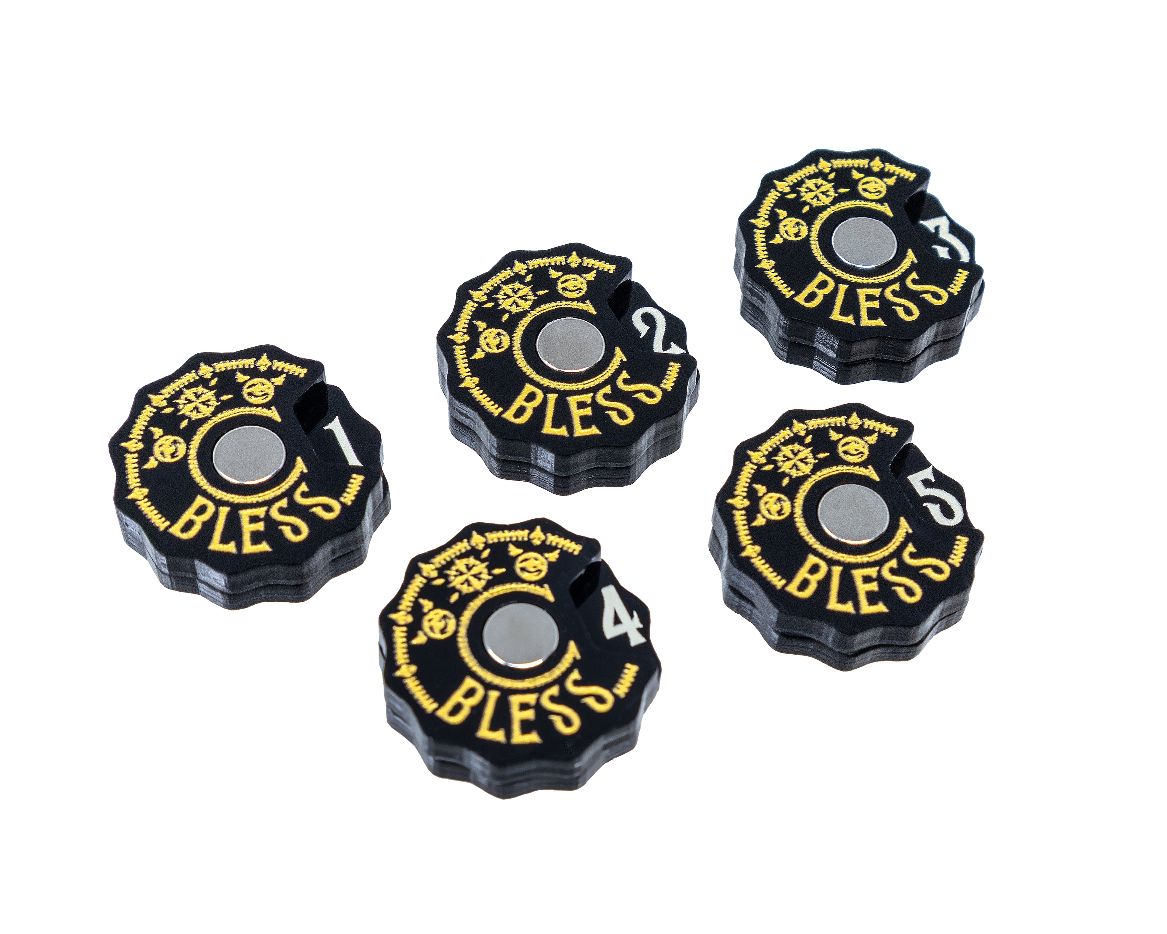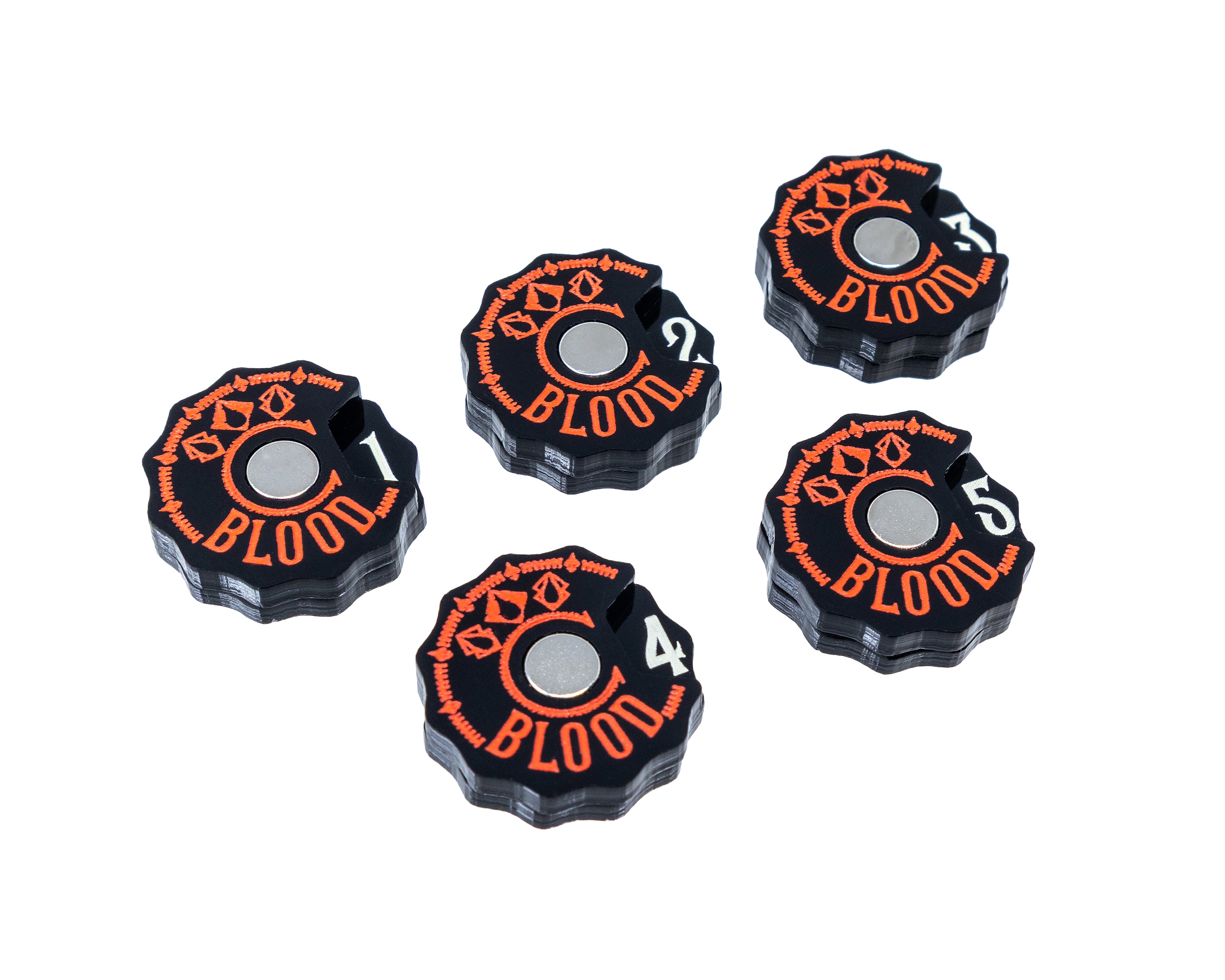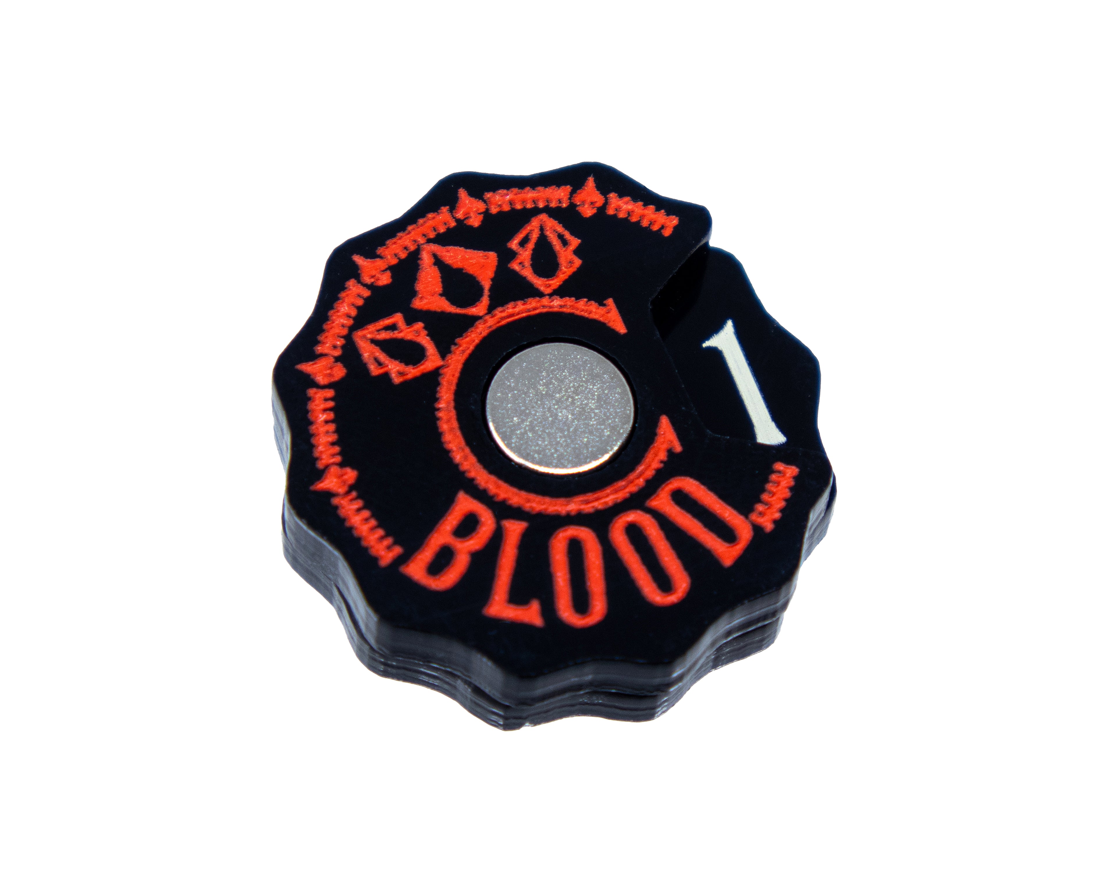 These thematic and practical dials are perfect for keeping track of in game conditions such as blood, bless and infection, while keeping accessory clutter on the battlefield to a minimum and will compliment your miniatures on the battlefield no matter where your allegiances lie...be it the forces of heaven, or hell.