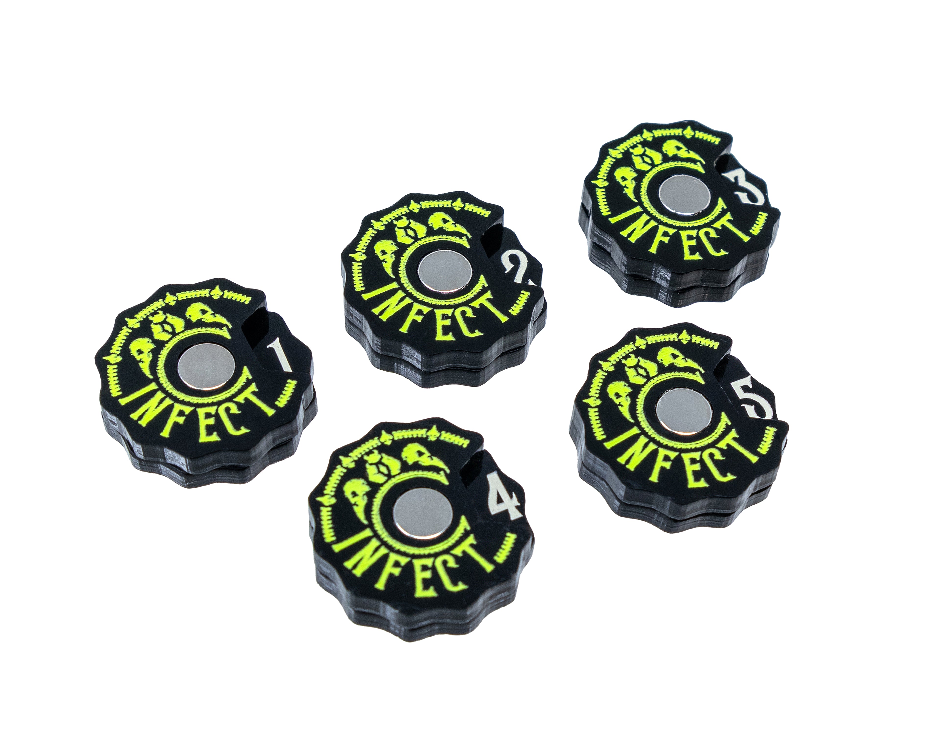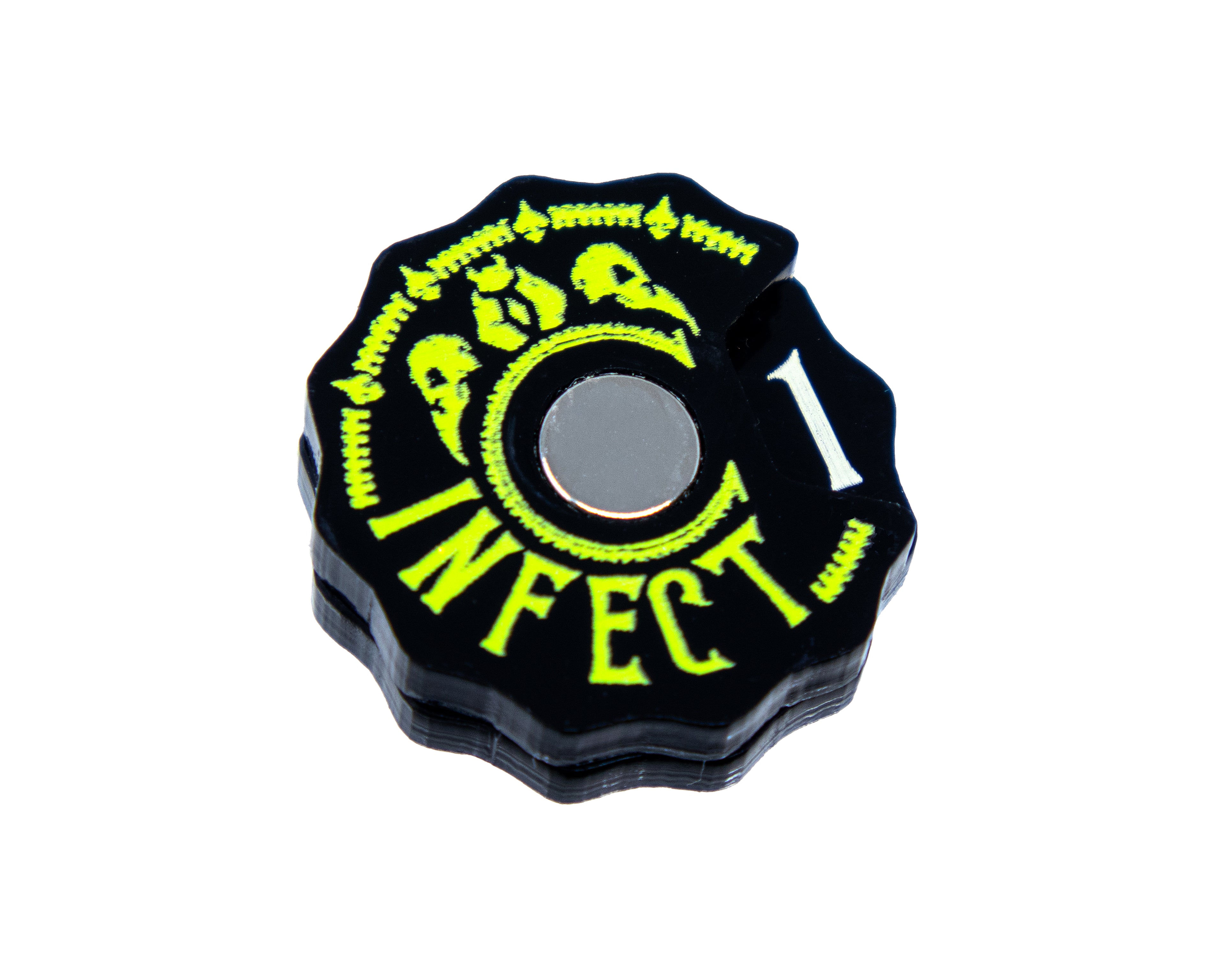 Infection Dial, single sided, etched and cut from 2 parts of black 3mm acrylic. Measuring 22mm in diameter and 6mm total thickness. Painted parchment and yellow/green.