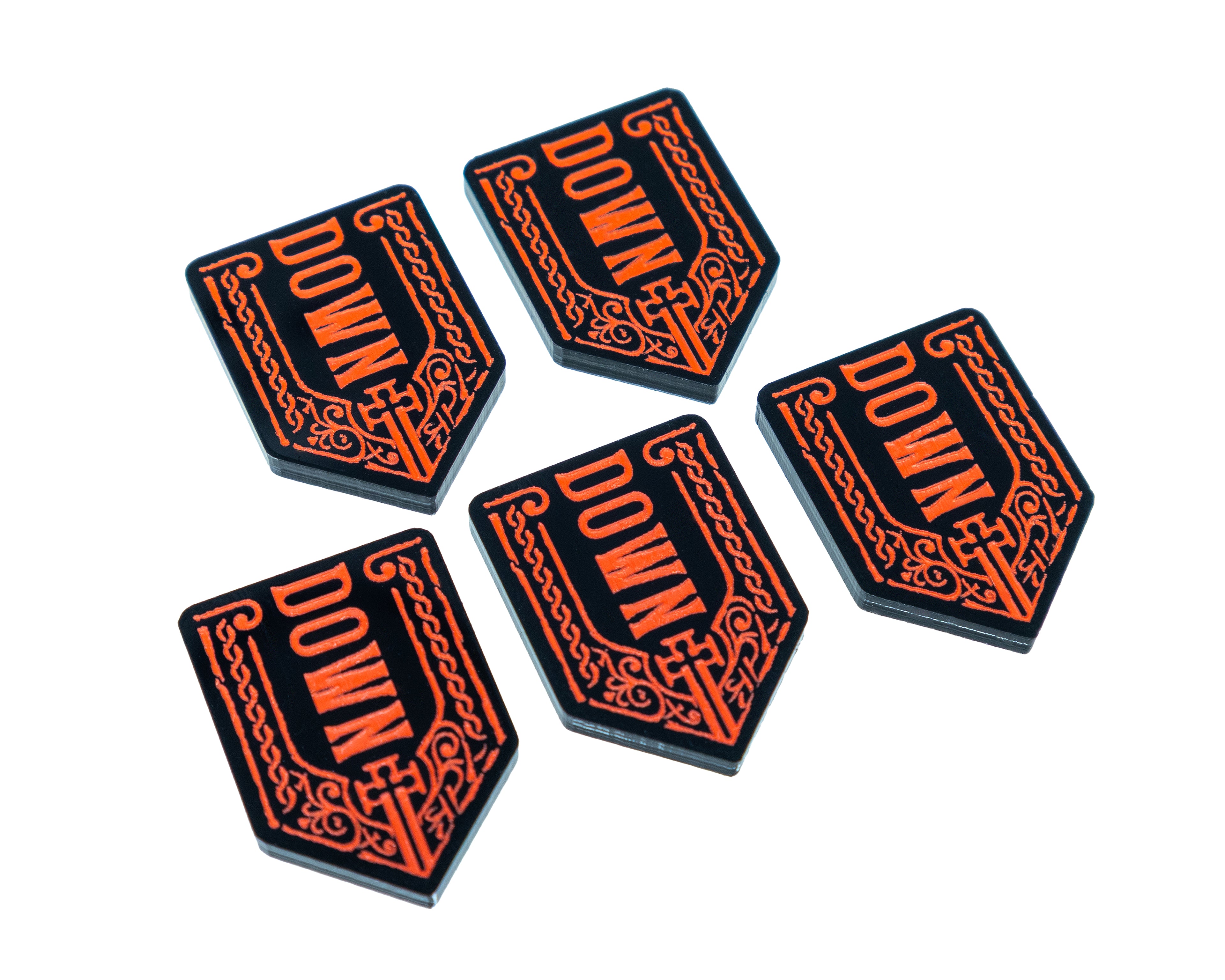 - 5 x Downed token, double sided, etched and cut from black 3mm acrylic and painted red on both sides. Measuring 24mm x 18mm.