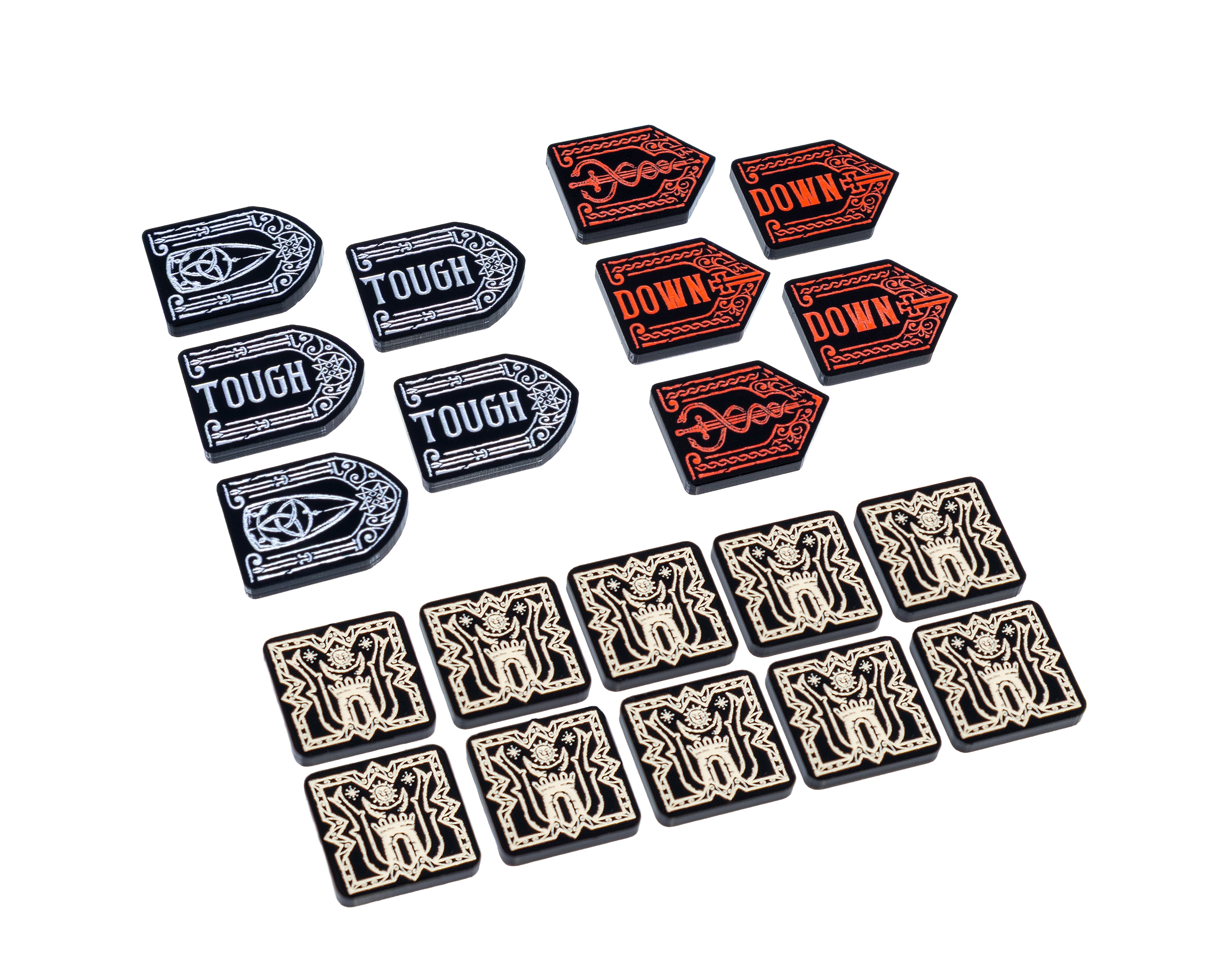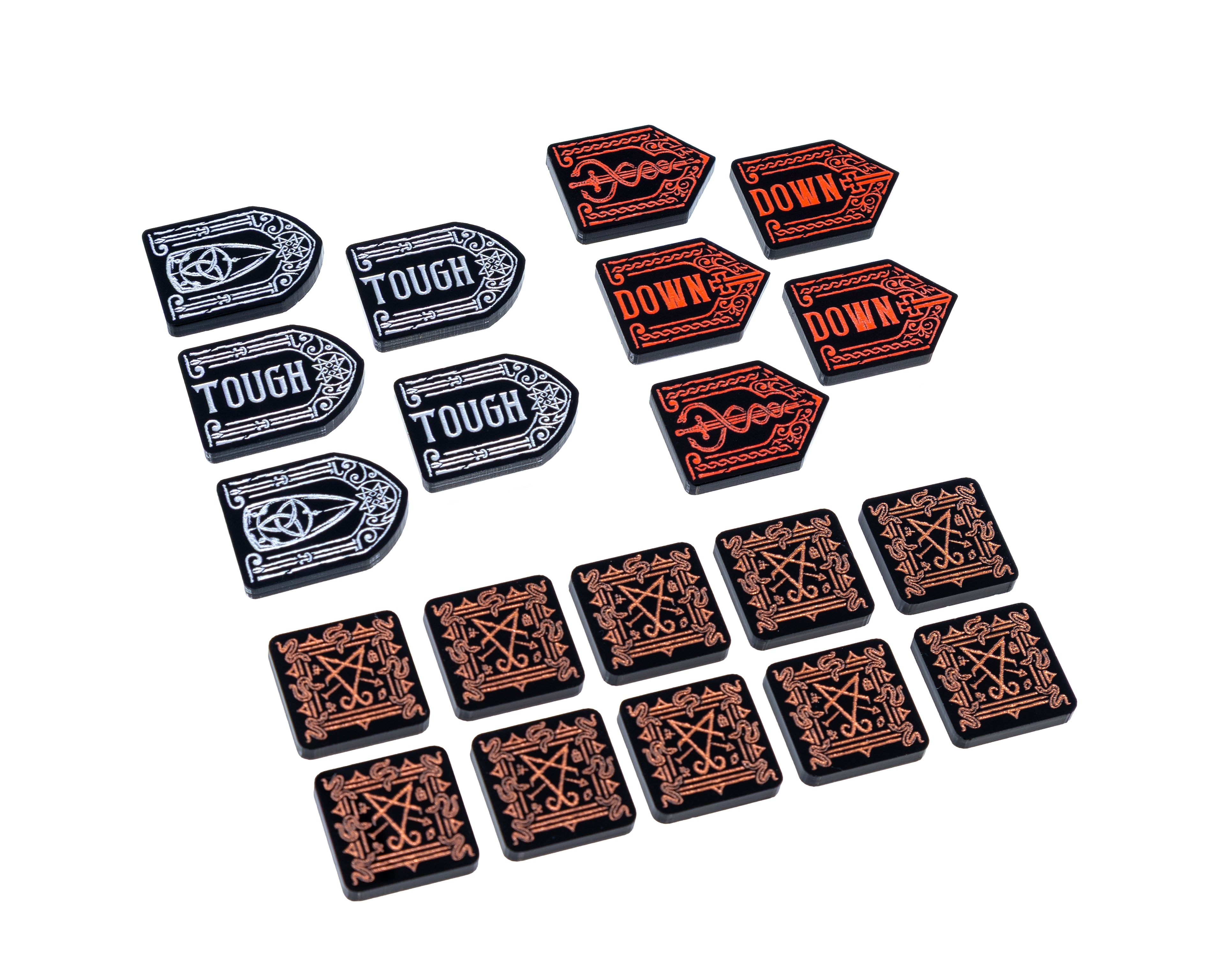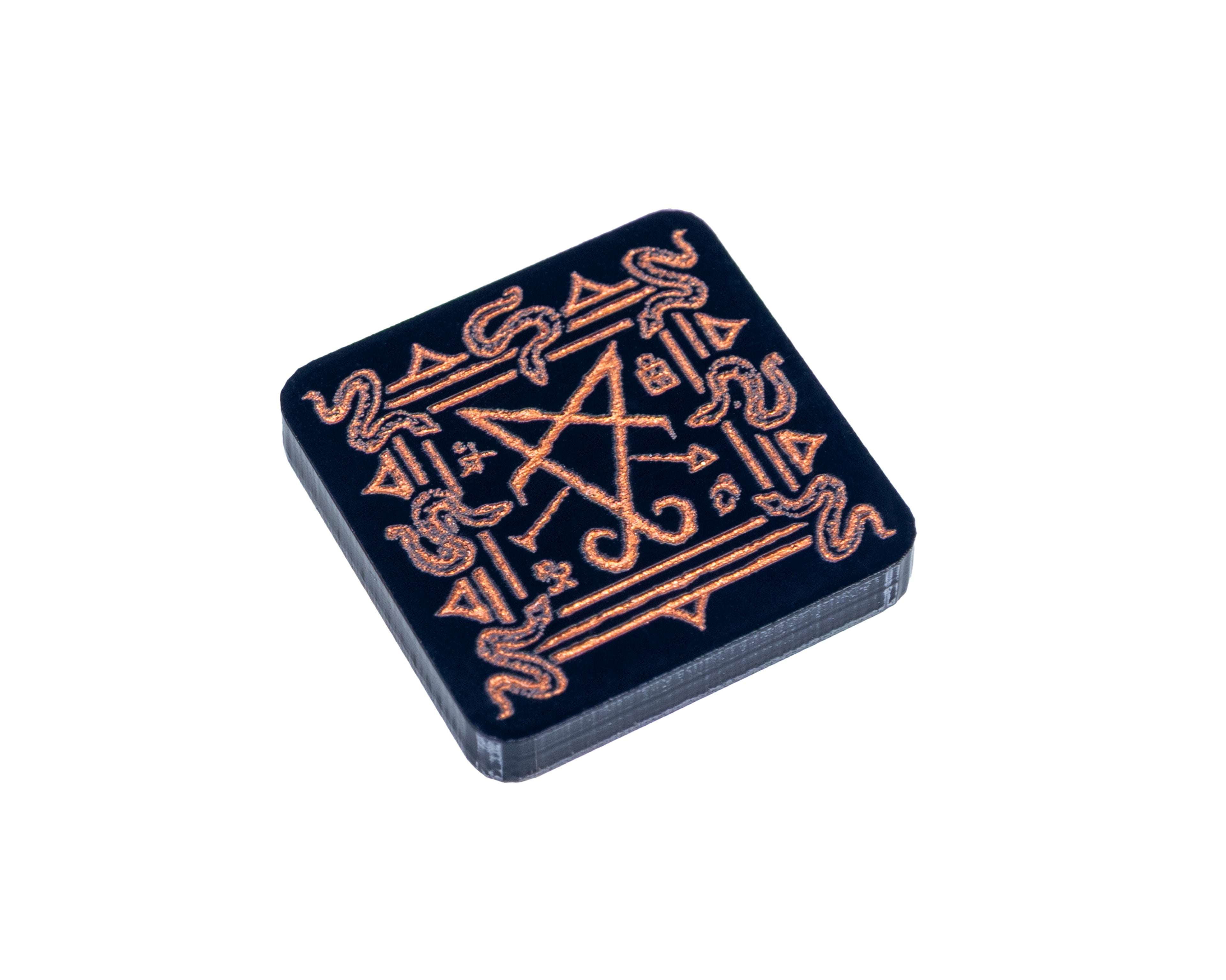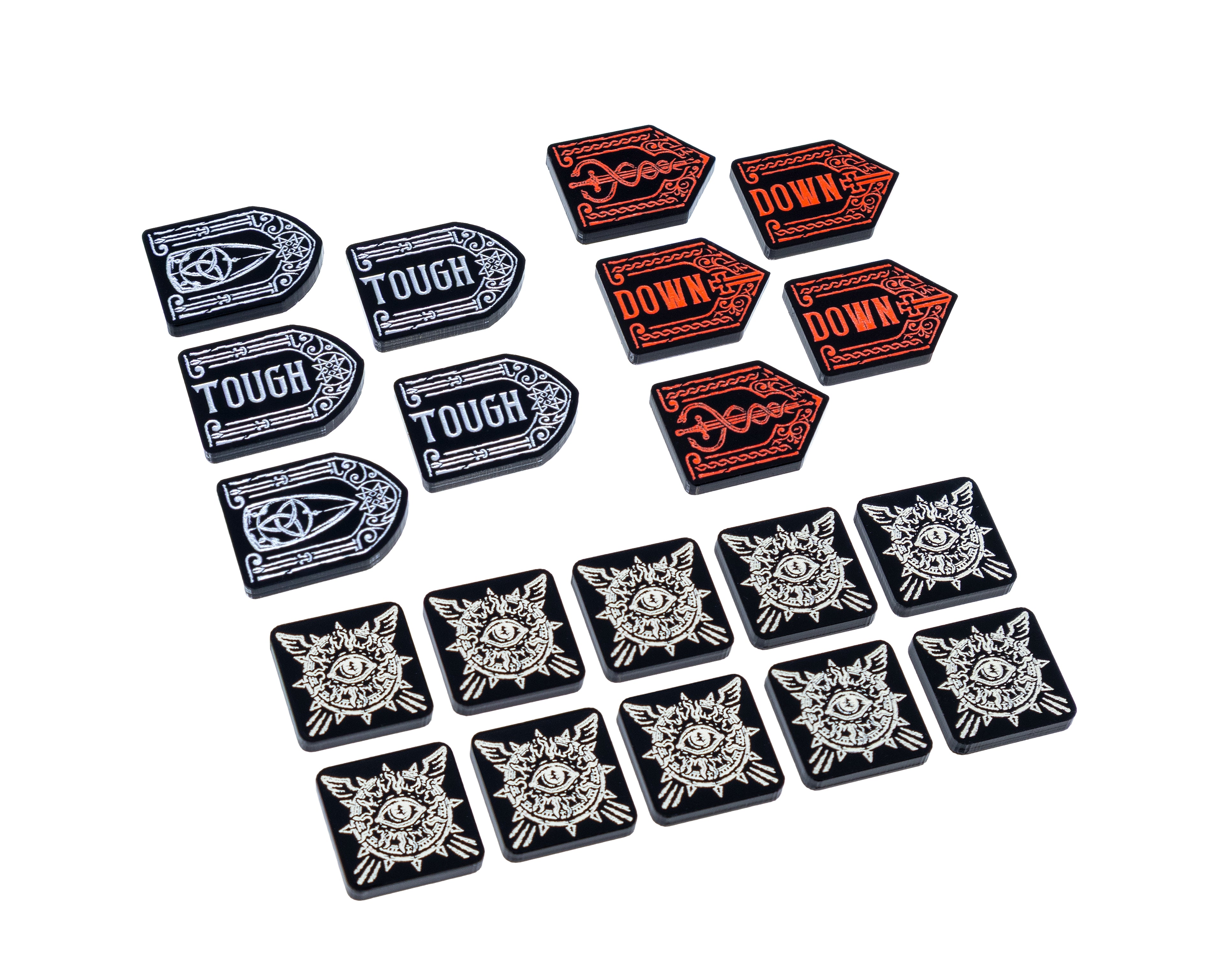 - 10 x Activation tokens, double sided, etched and cut from black 3mm acrylic. Measuring 18mm x 18mm.