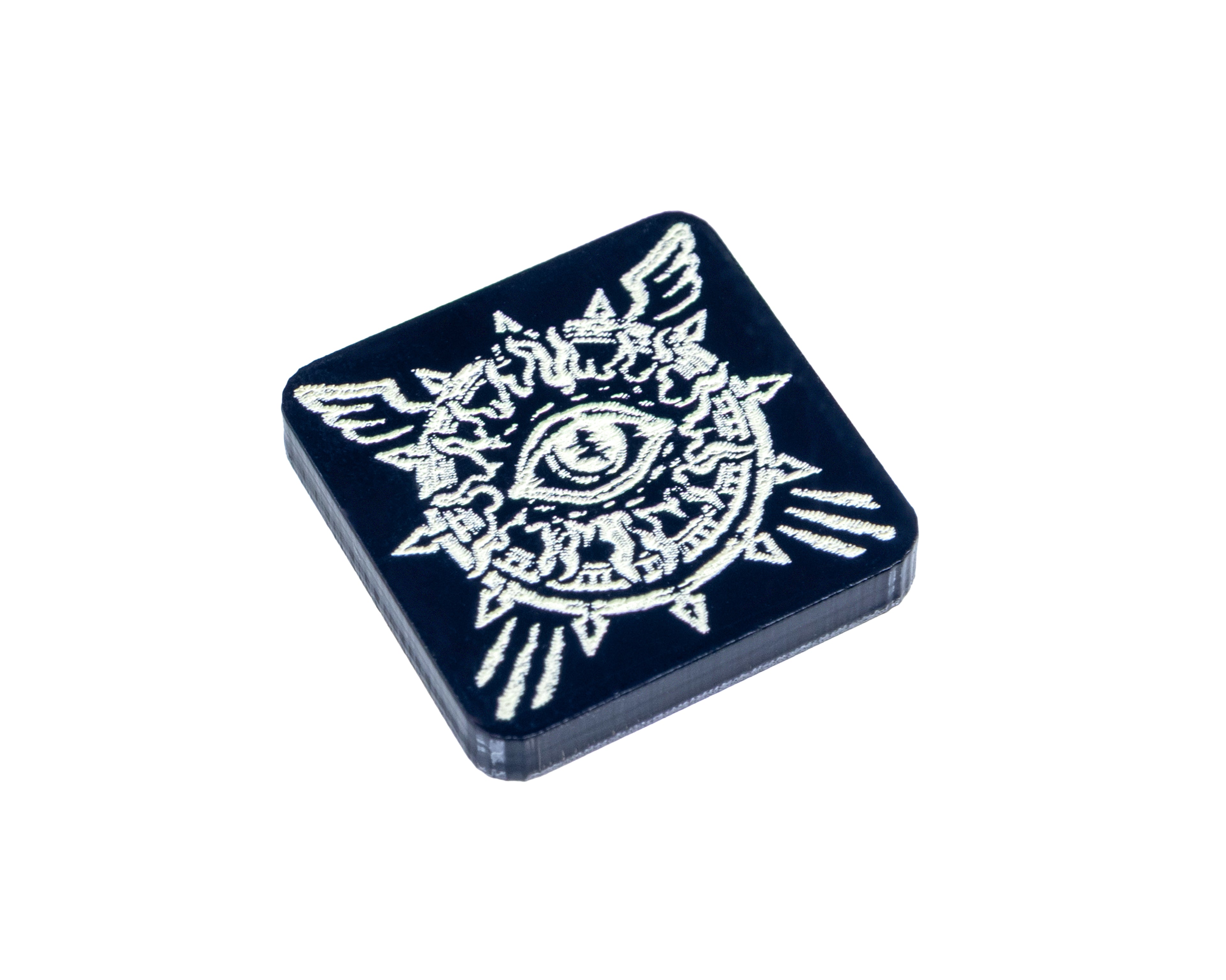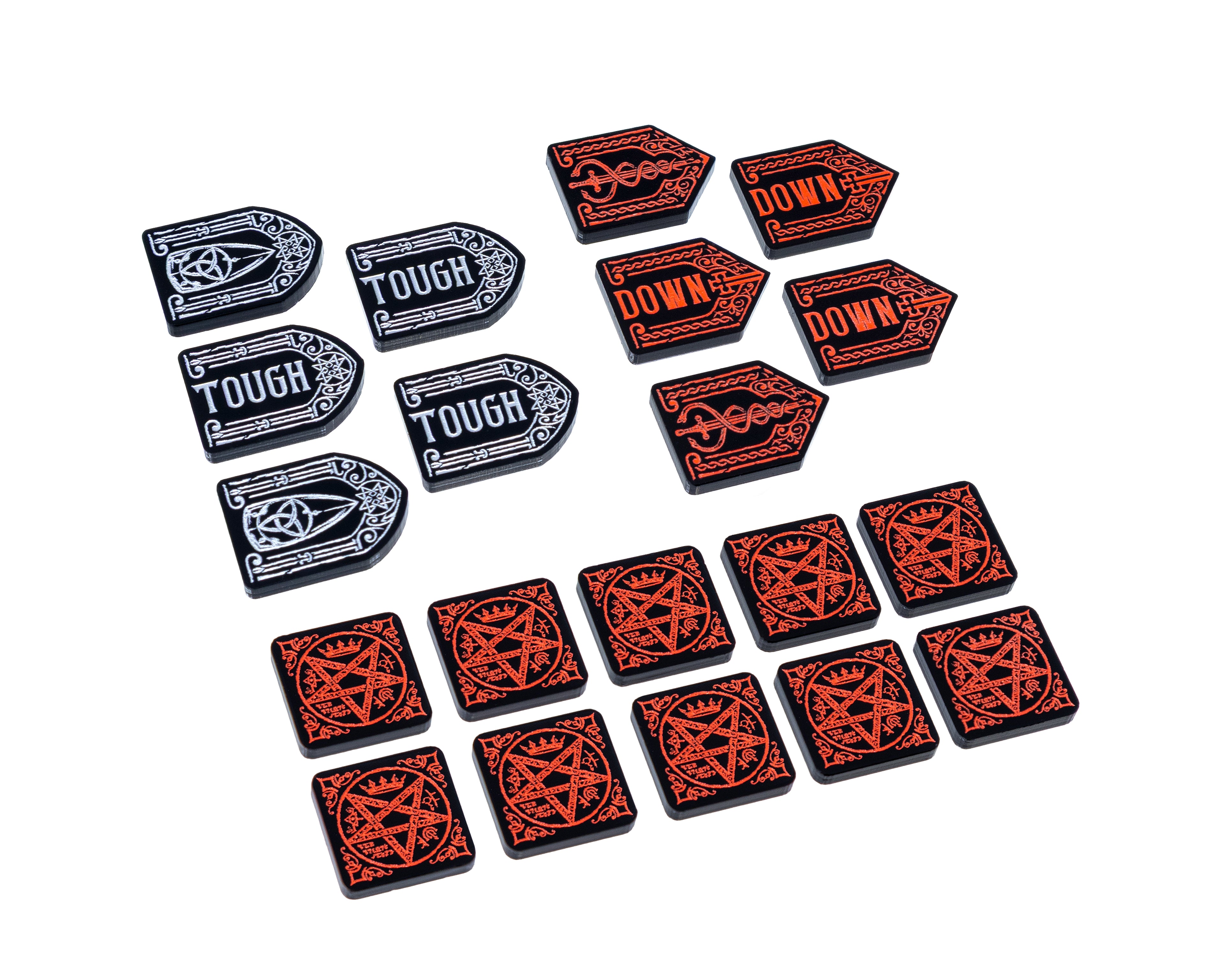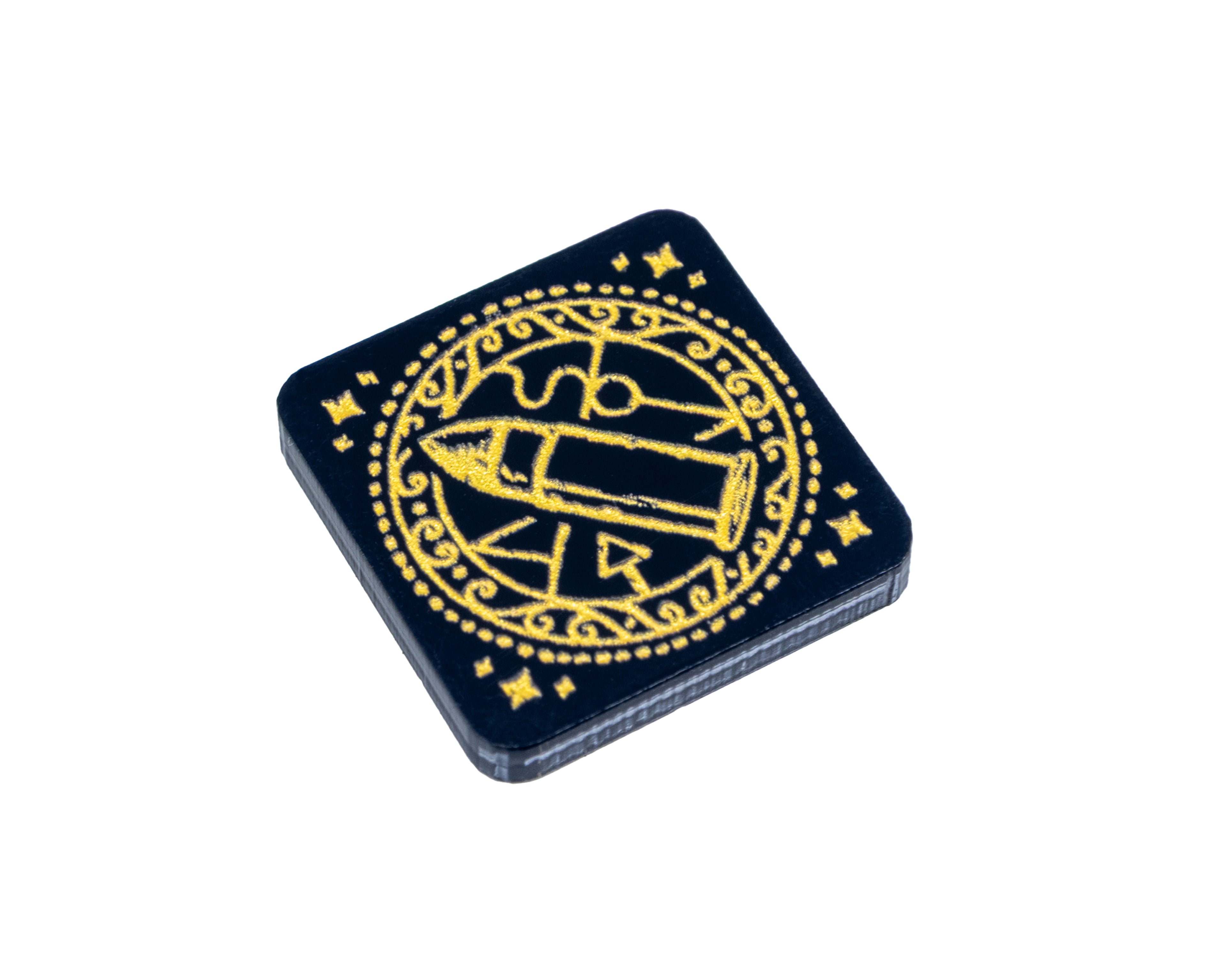 - 10 x Activation tokens, double sided, etched and cut from black 3mm acrylic. Measuring 18mm x 18mm.