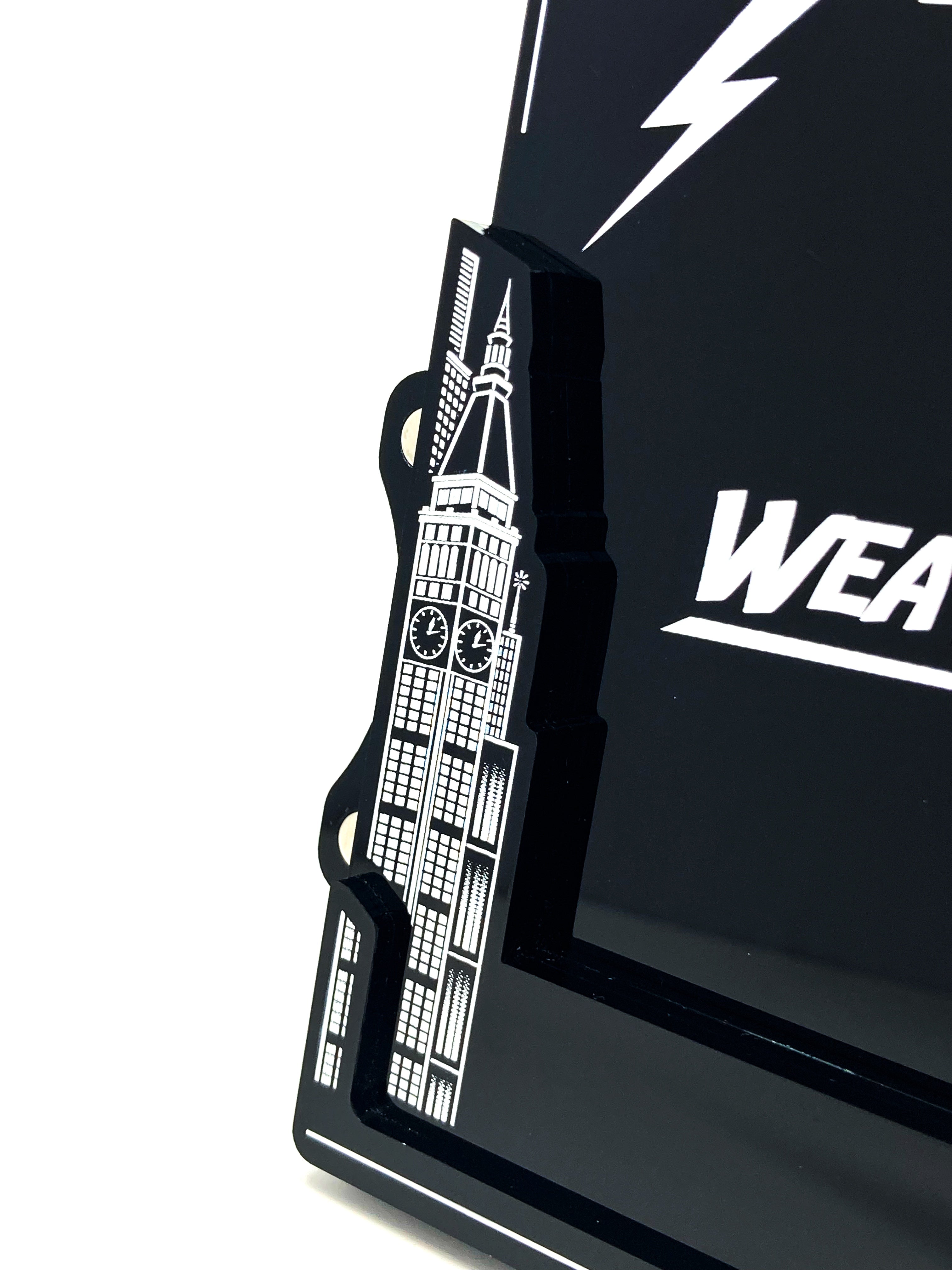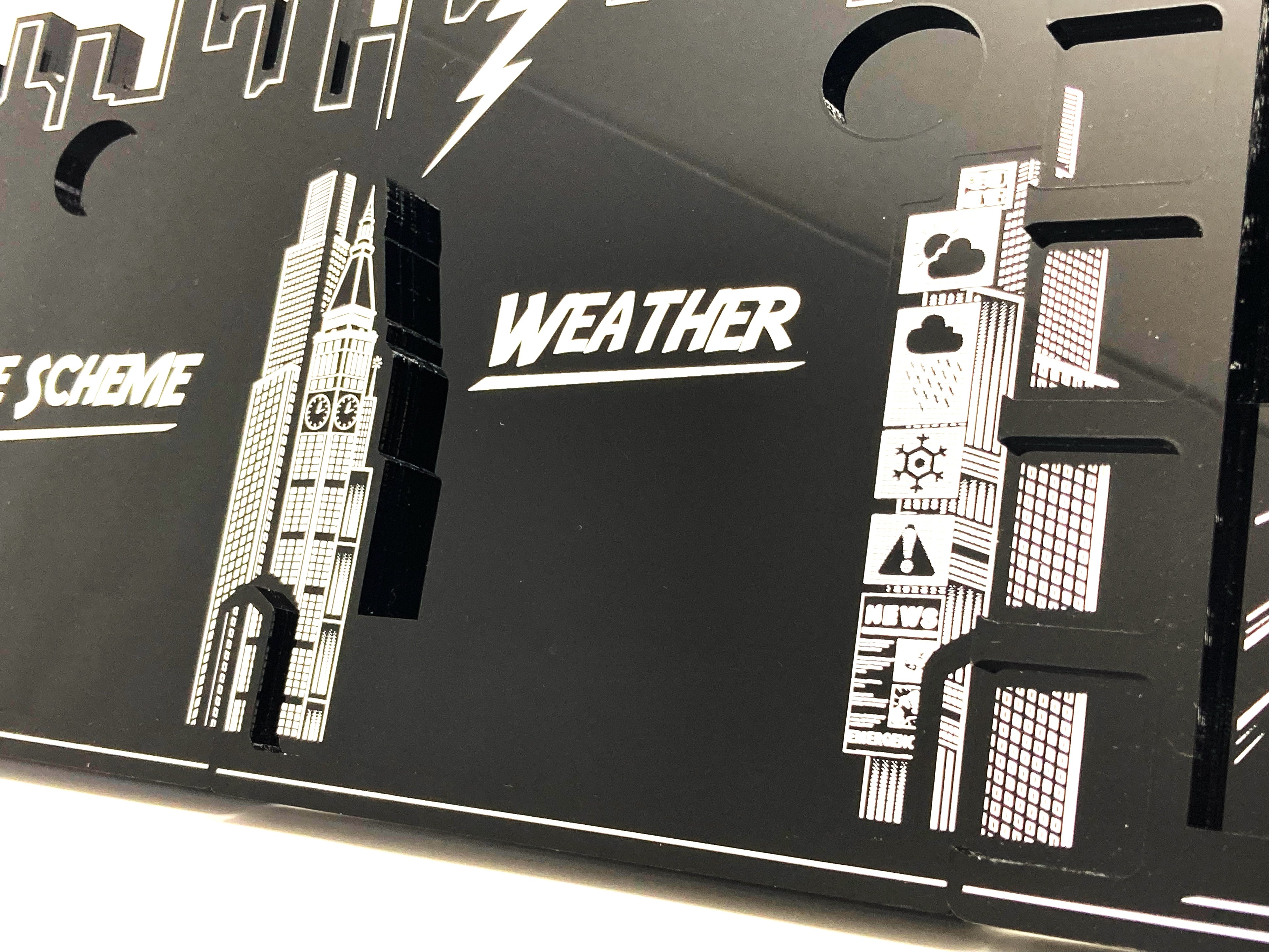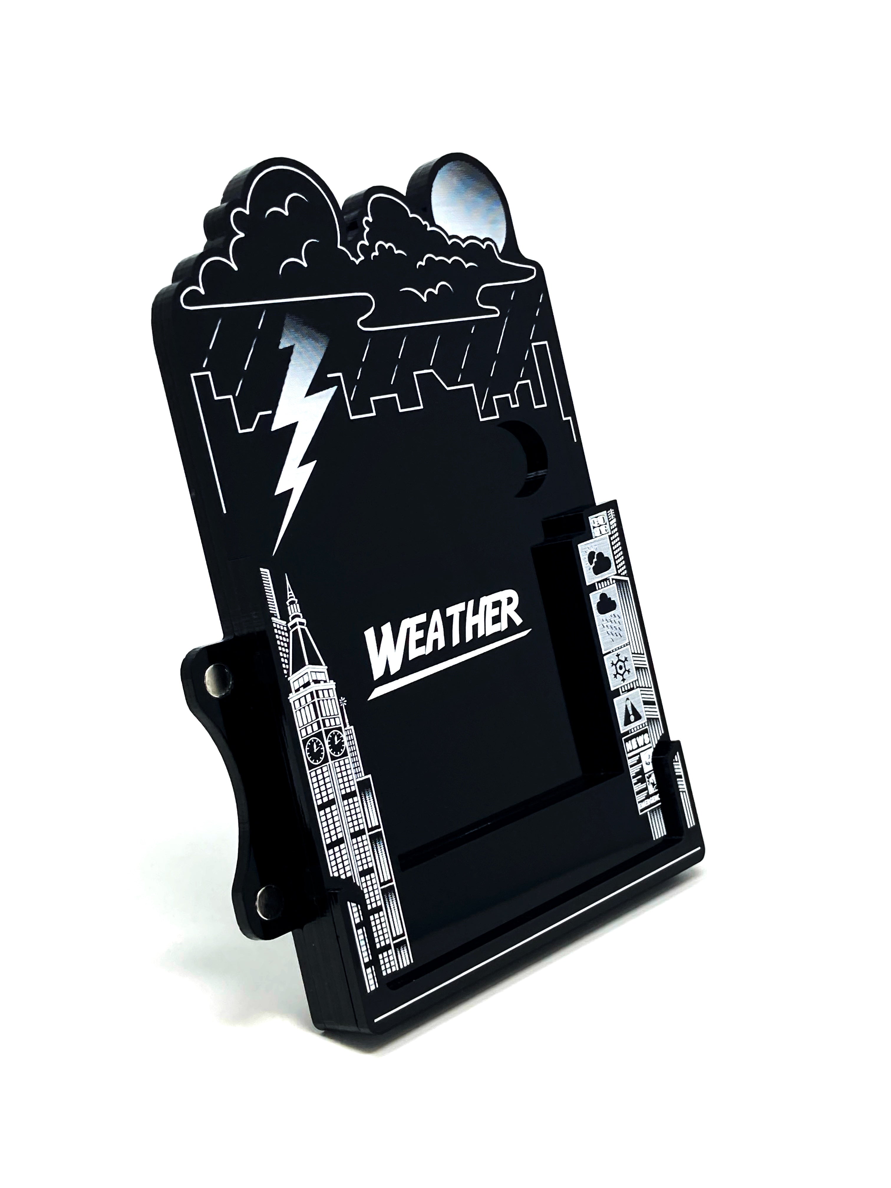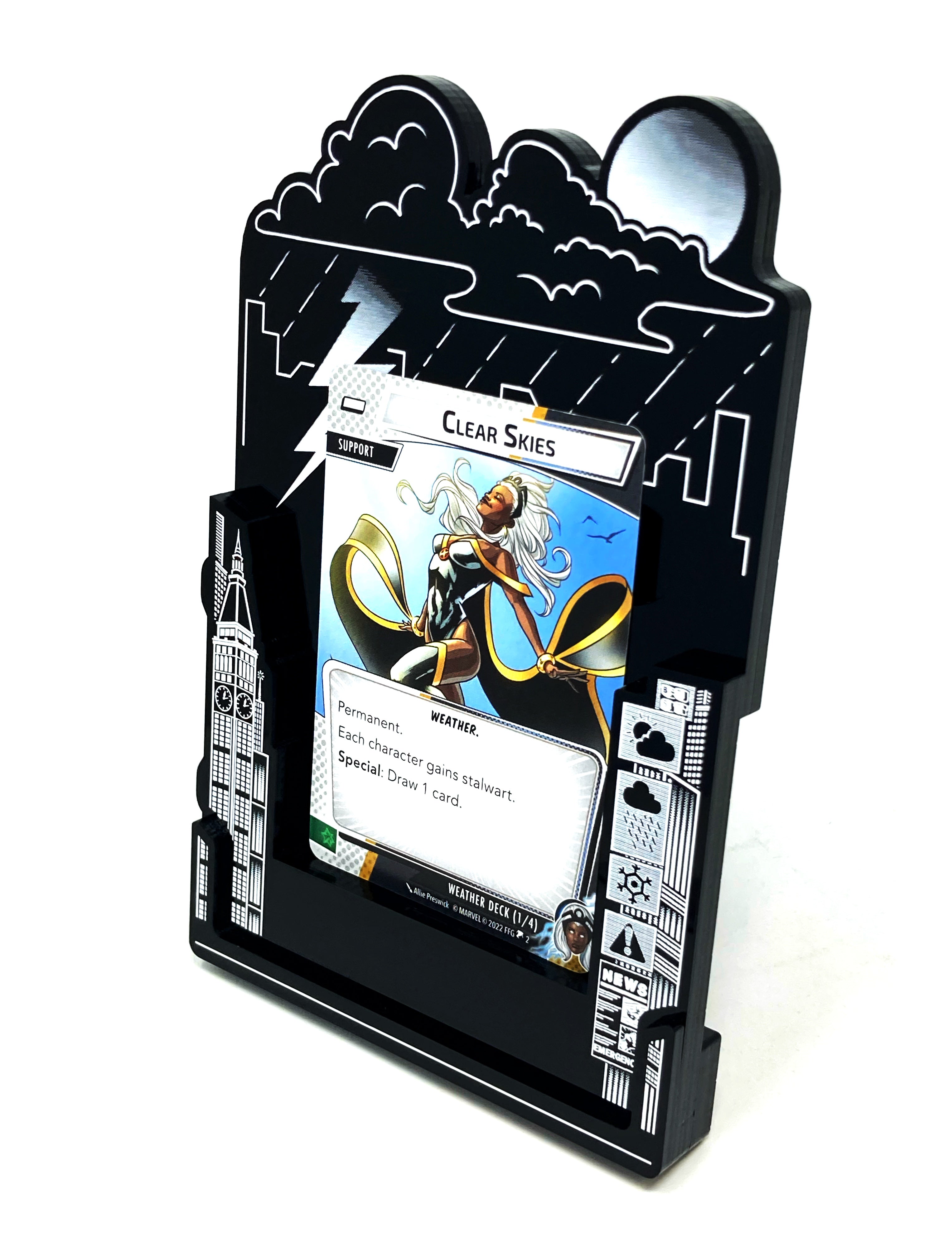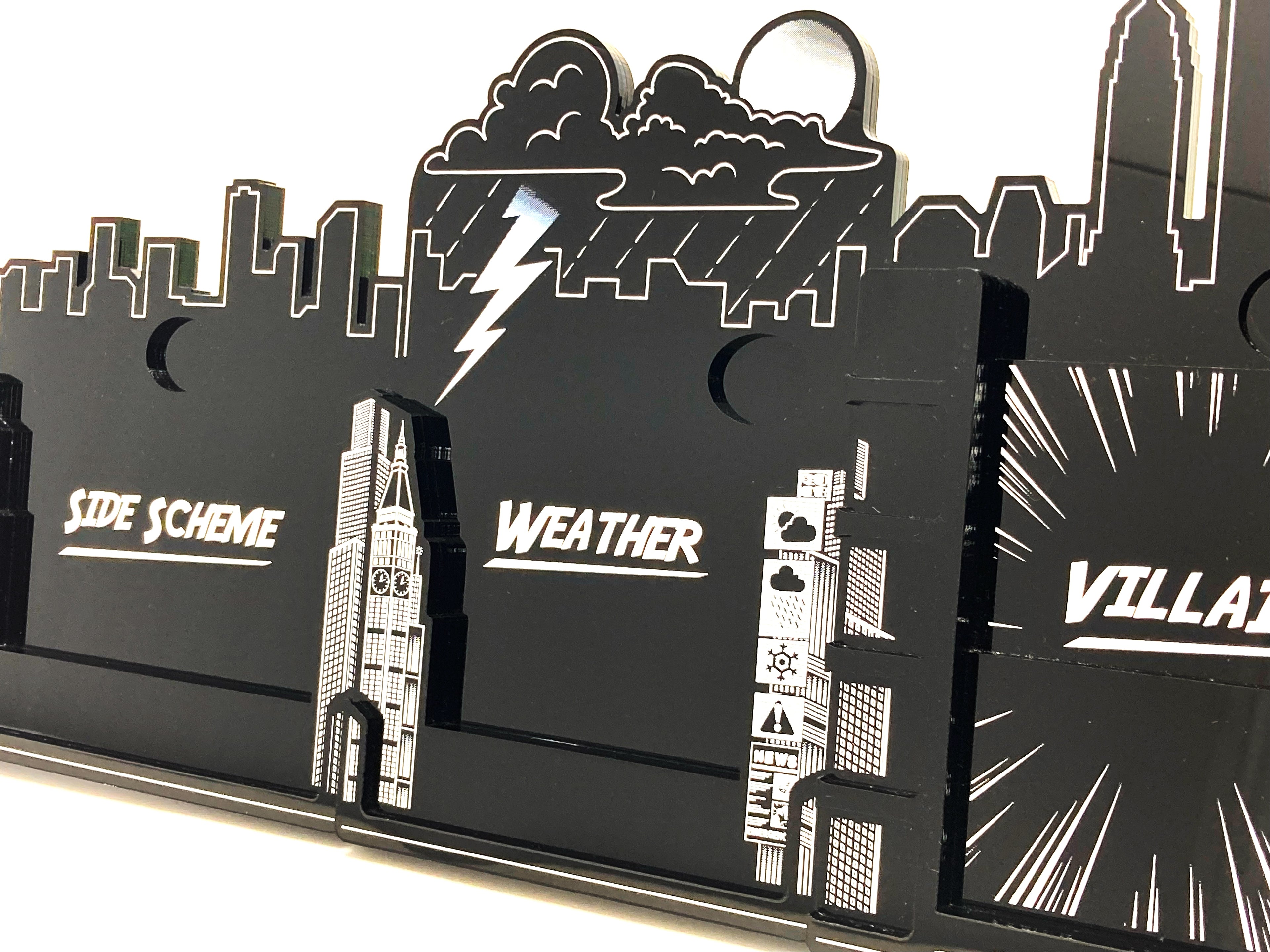 We have designed these boards as a "frame" to the games cards. We wanted to accentuate the beauty of the original artwork not compete with it and therefore we decided on the stark black and white colour to help the colours on the cards "pop". We designed the holders to have a profile of the New York skyline and various weather states found in Storm's deck.
