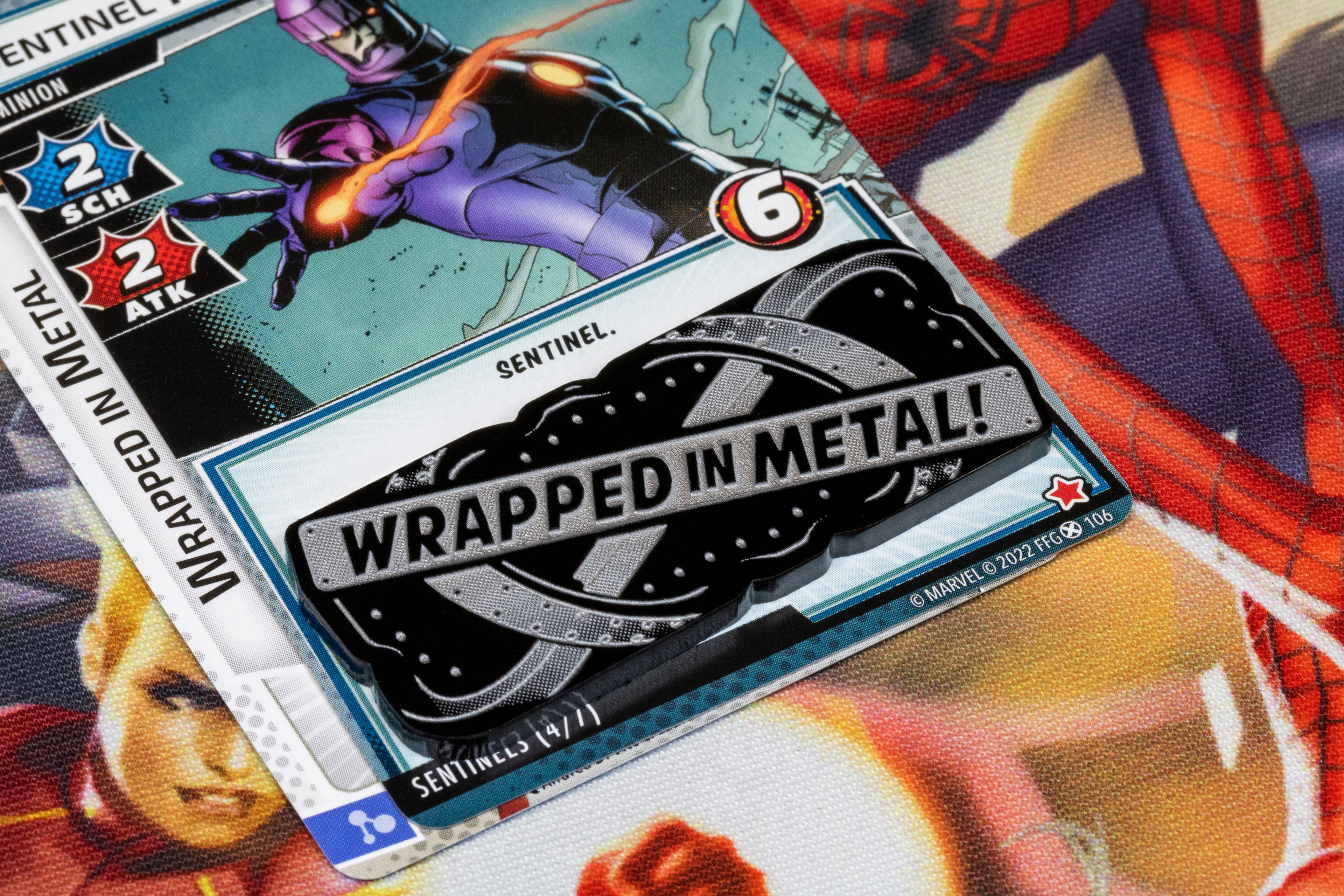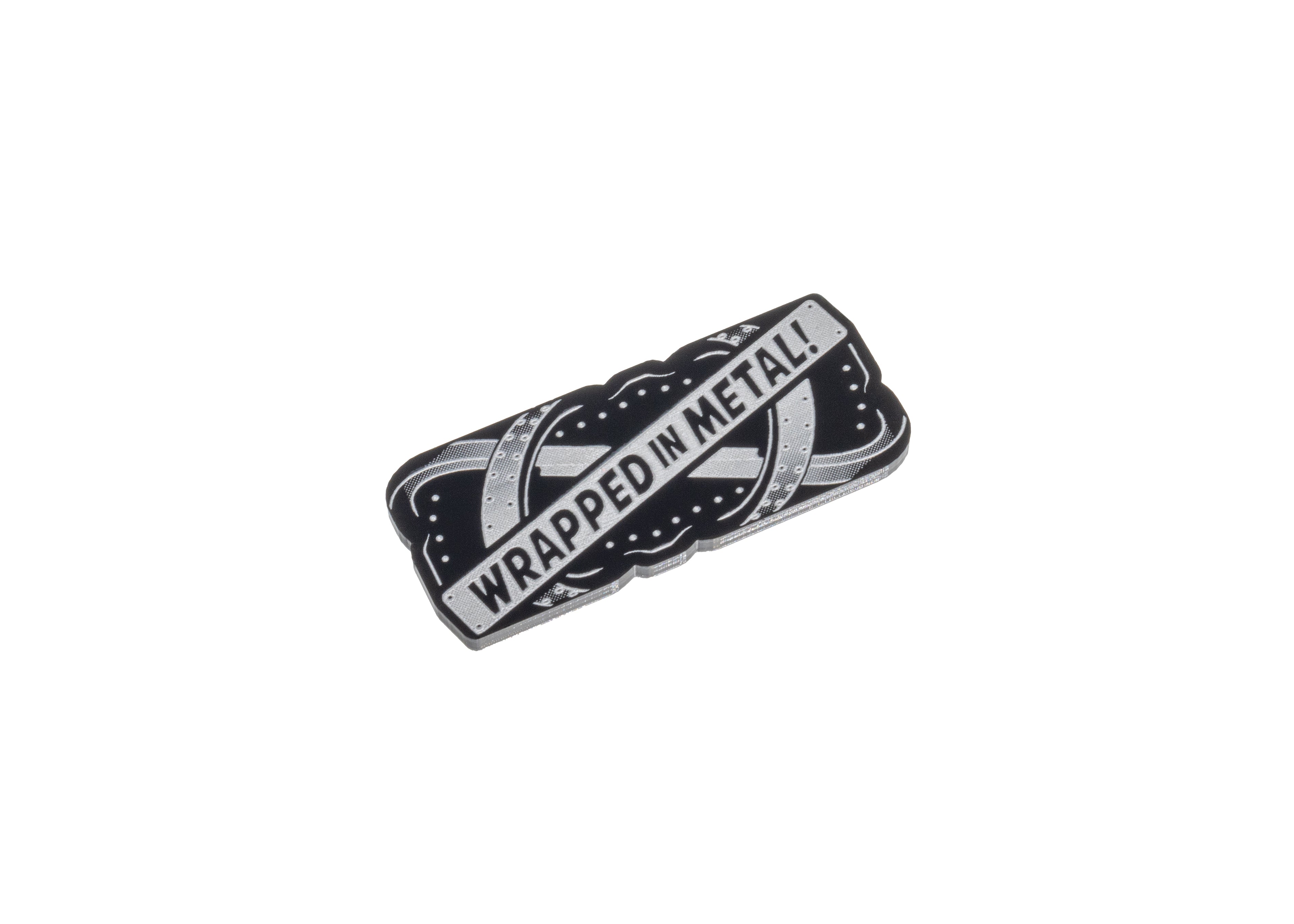 - 1 x Wrapped In Metal Token, double sided, etched and cut from opaque black acrylic and painted sliver on both sides. Measuring 57mm x 24mm