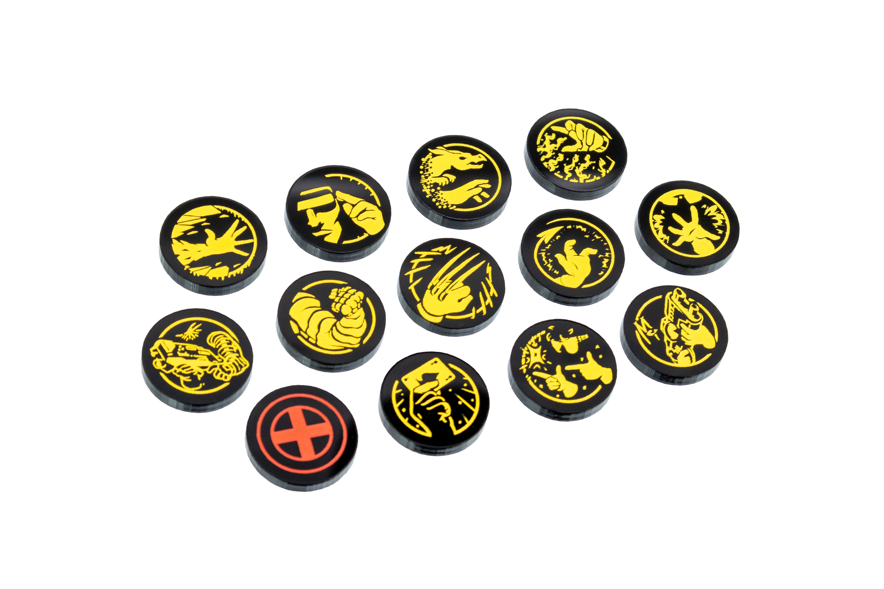 - 13 x Hero Specific Activation Tokens, etched and cut from opaque black acrylic, painted yellow on the active side and red on the reverse, inactive side. Measuring approximately 18mm diameter.