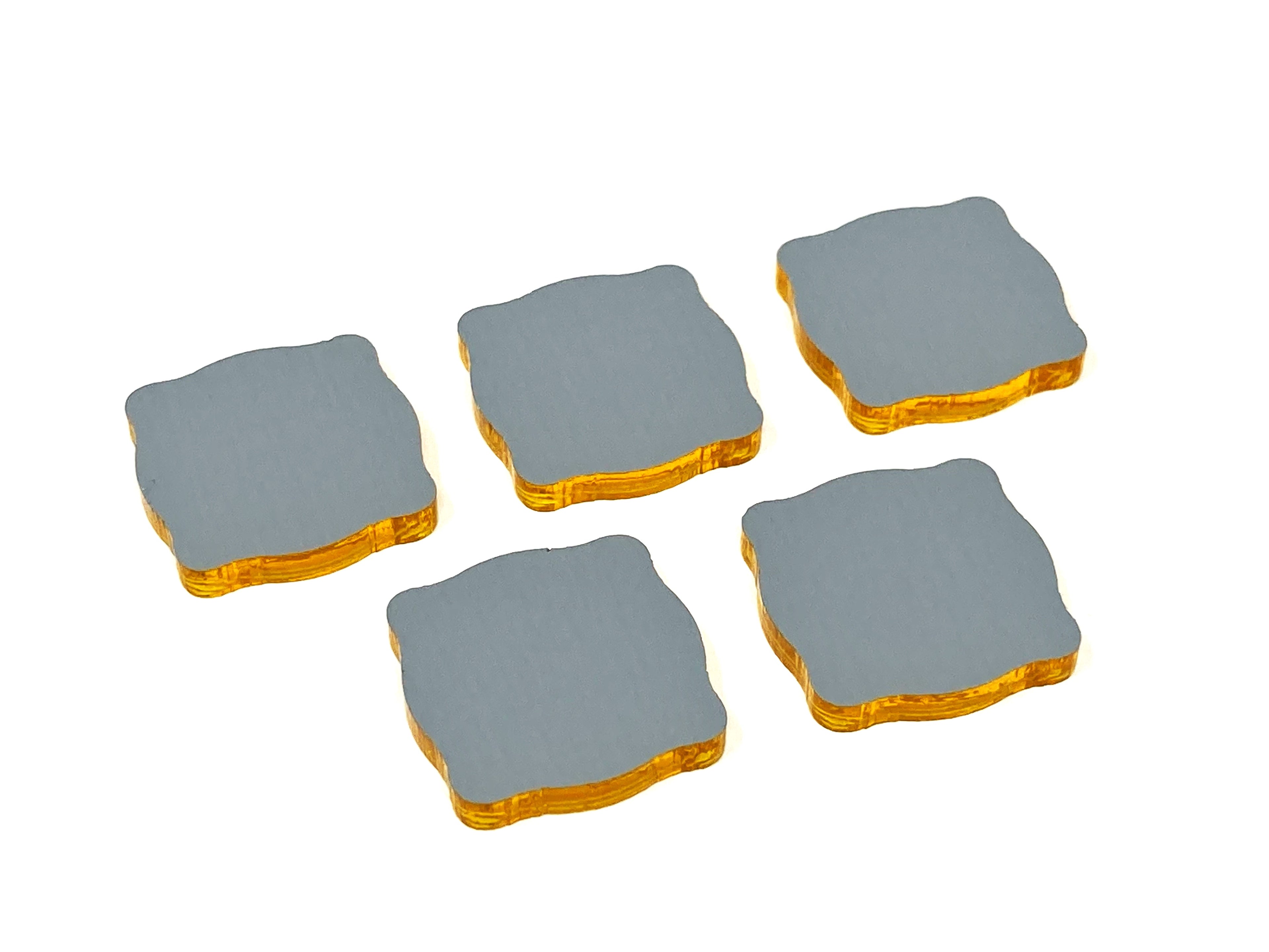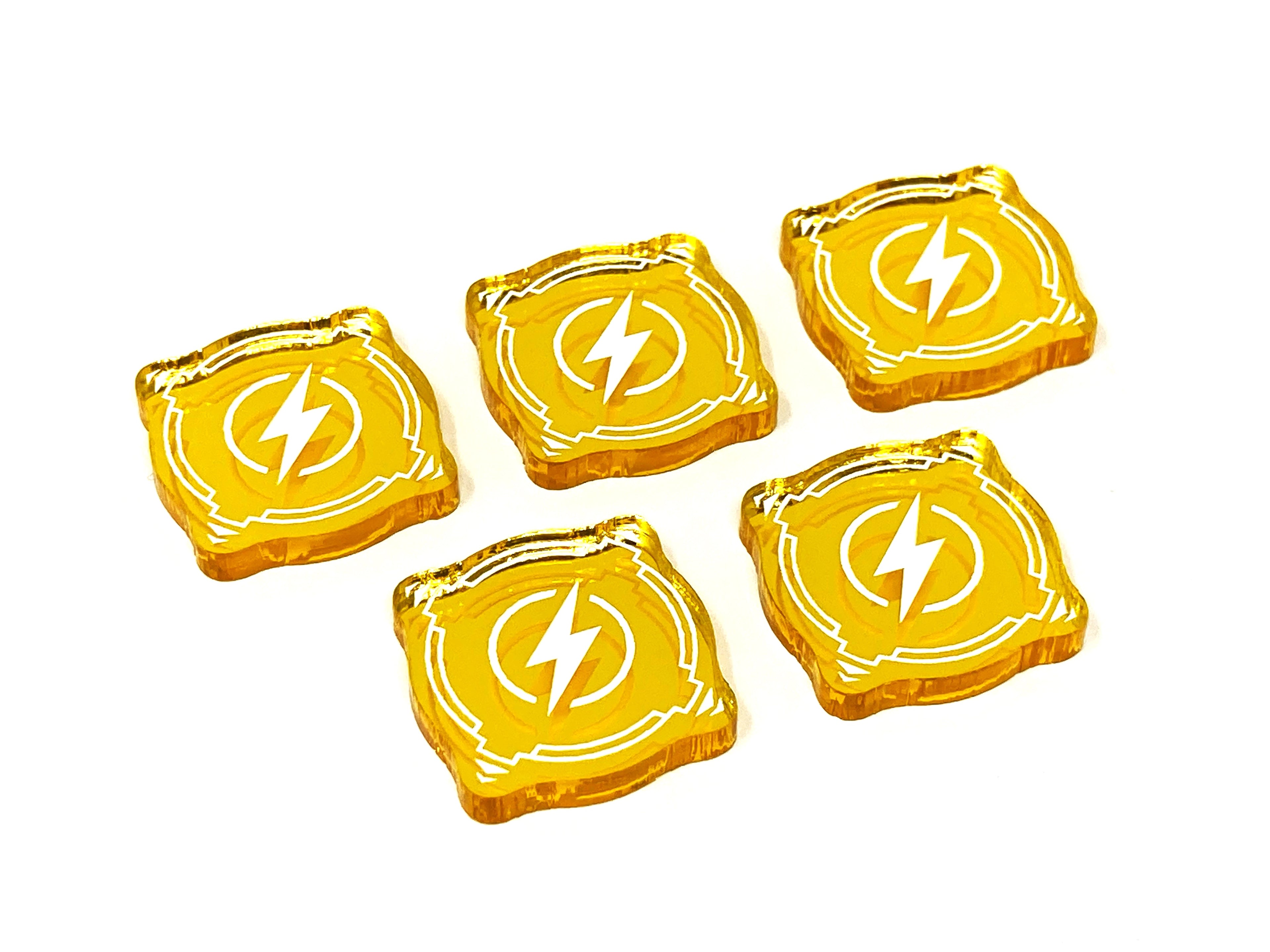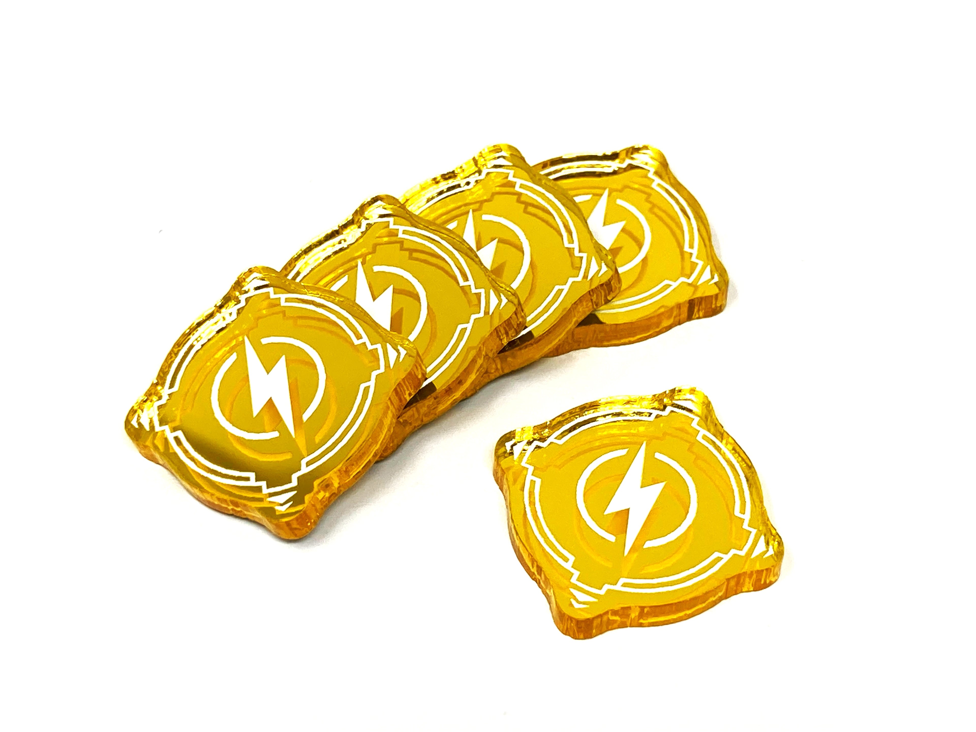 - 5 x Charge tokens, laser etched and cut from mirror yellow acrylic and painted white on one side, measuring 20mm x 20mm.