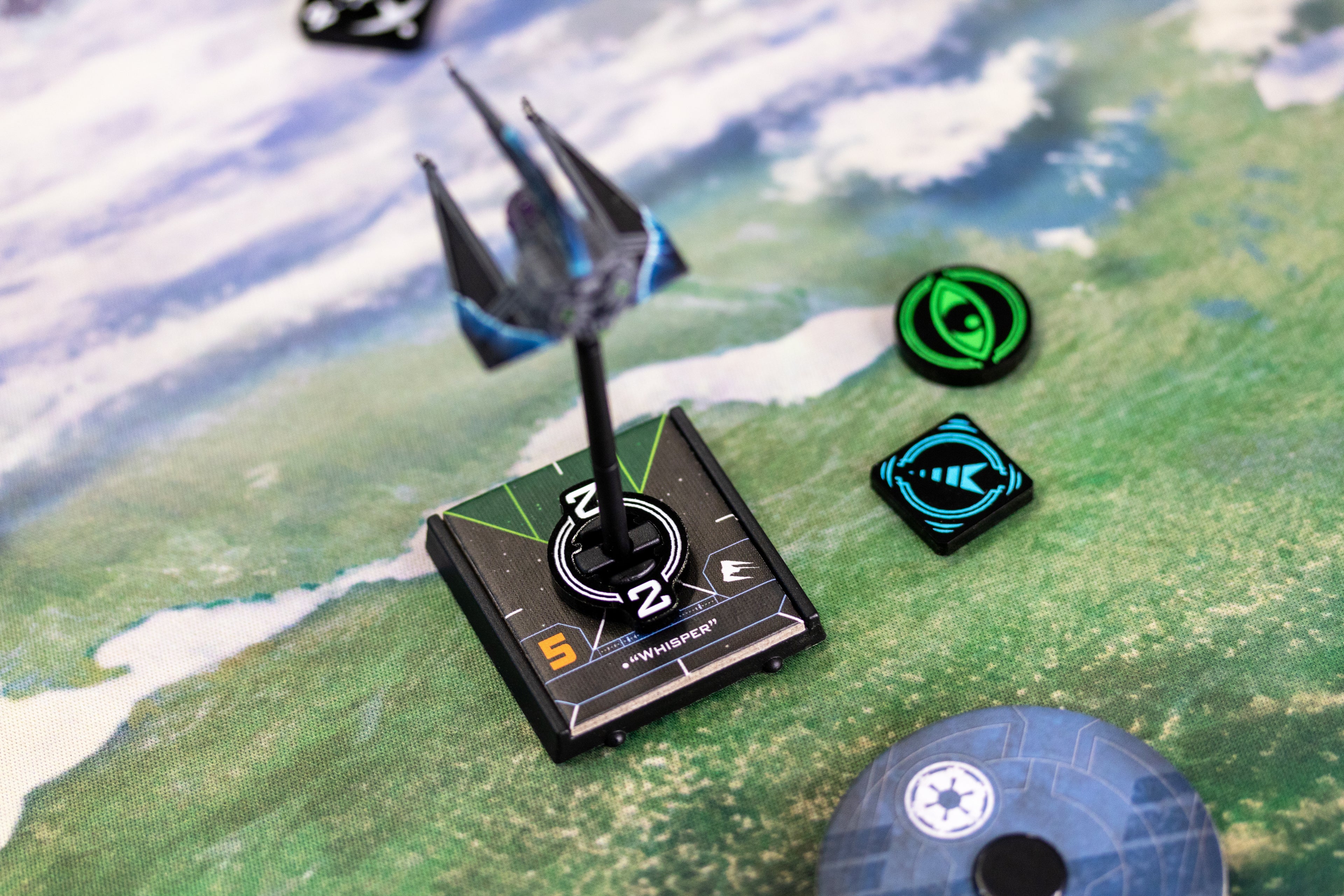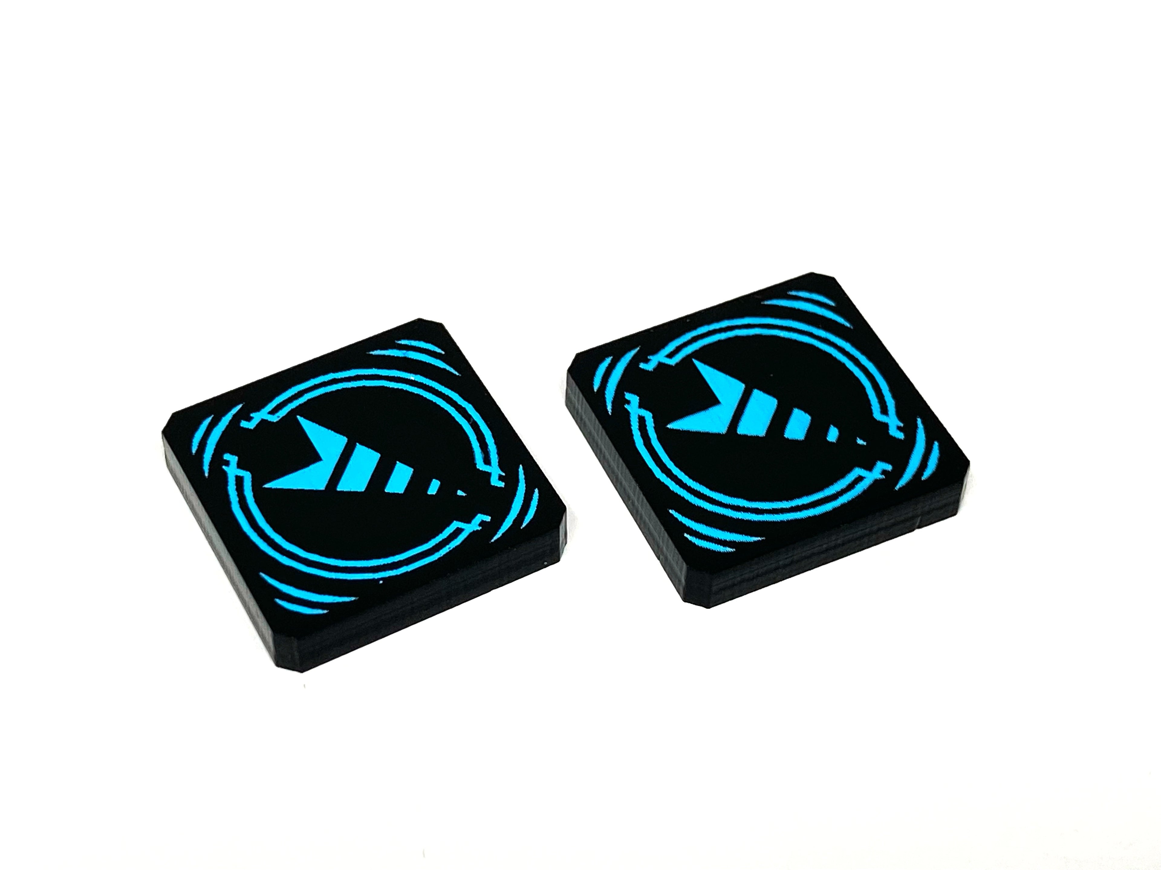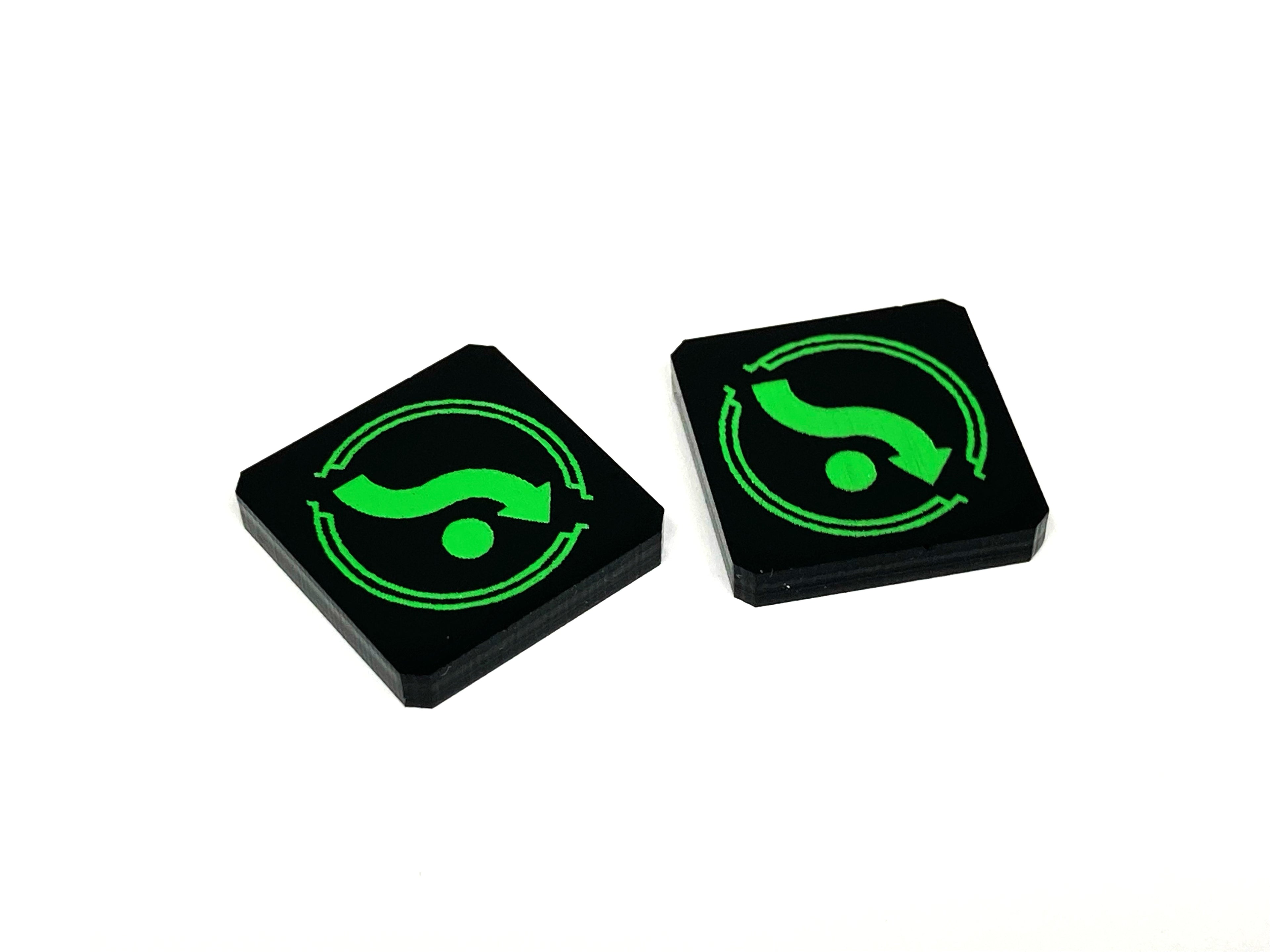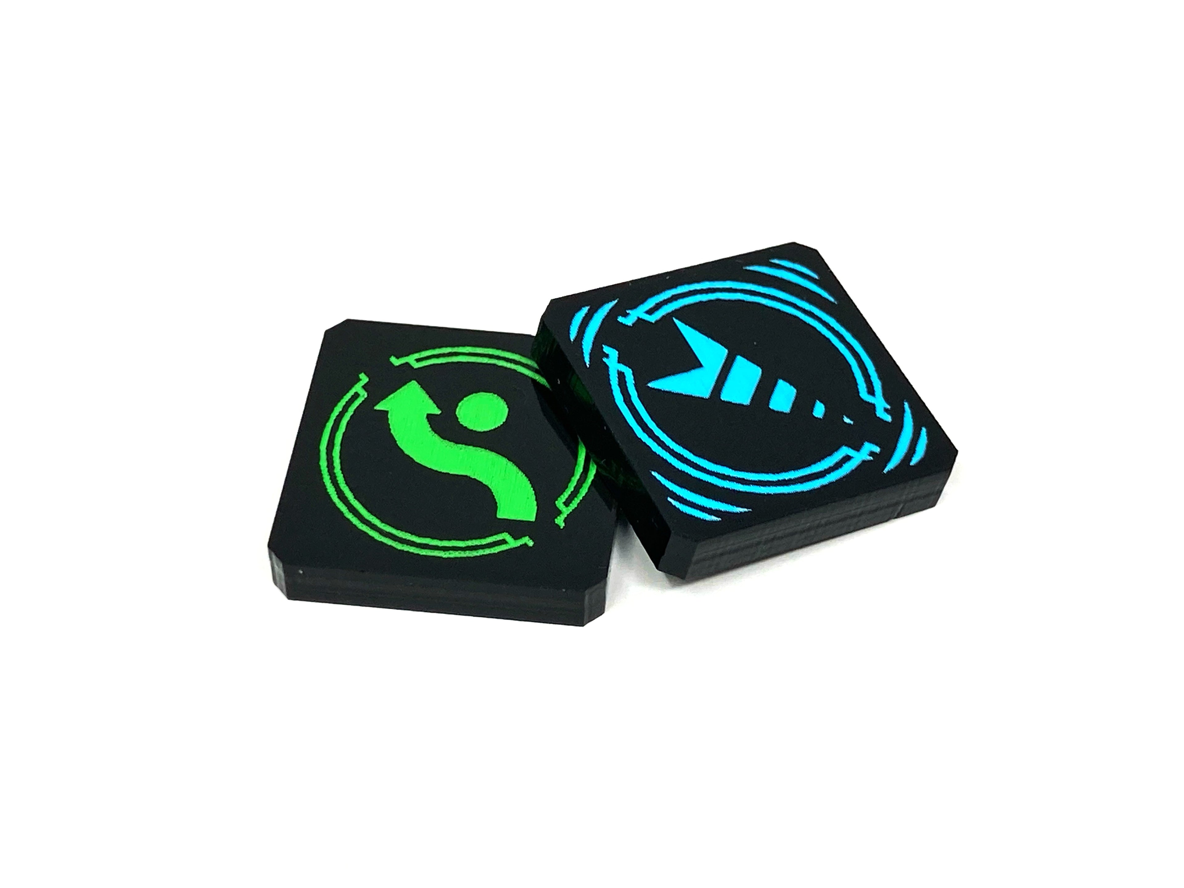- 2 x Cloak tokens, laser etched on both sides, cut from 3mm opaque black acrylic and painted light blue on the cloak side and green on the evade reverse side. Measuring 17mm x 17mm.