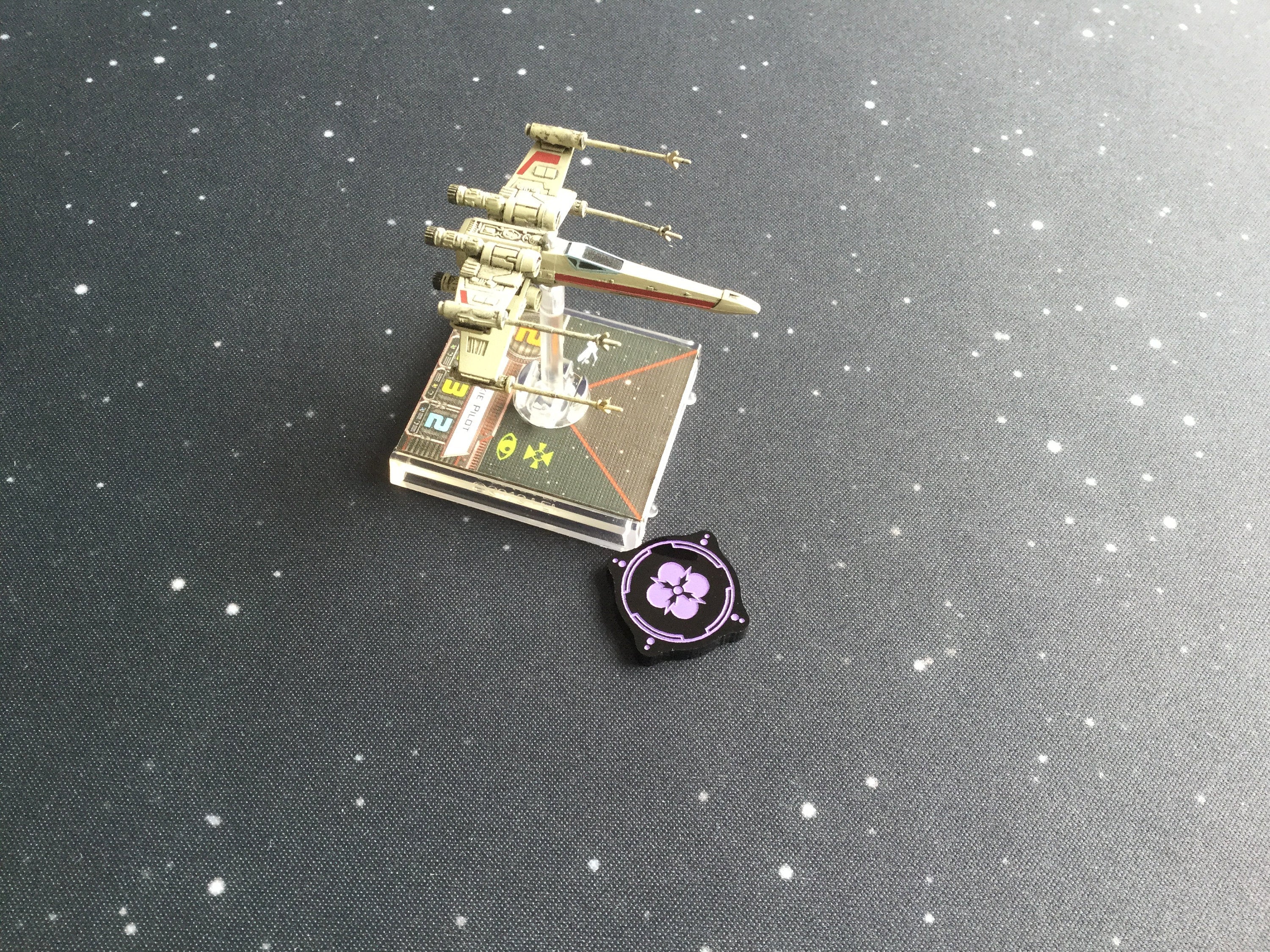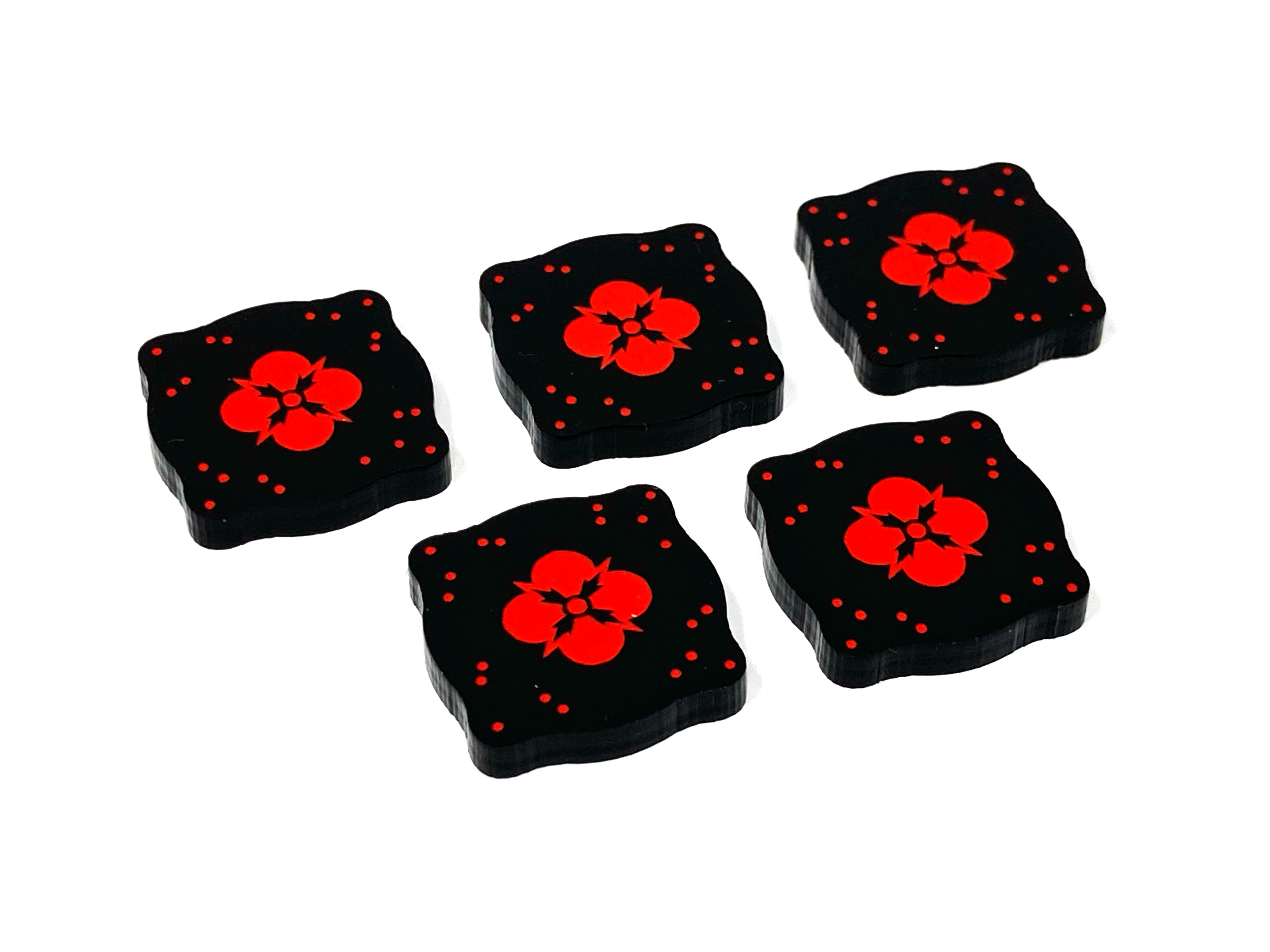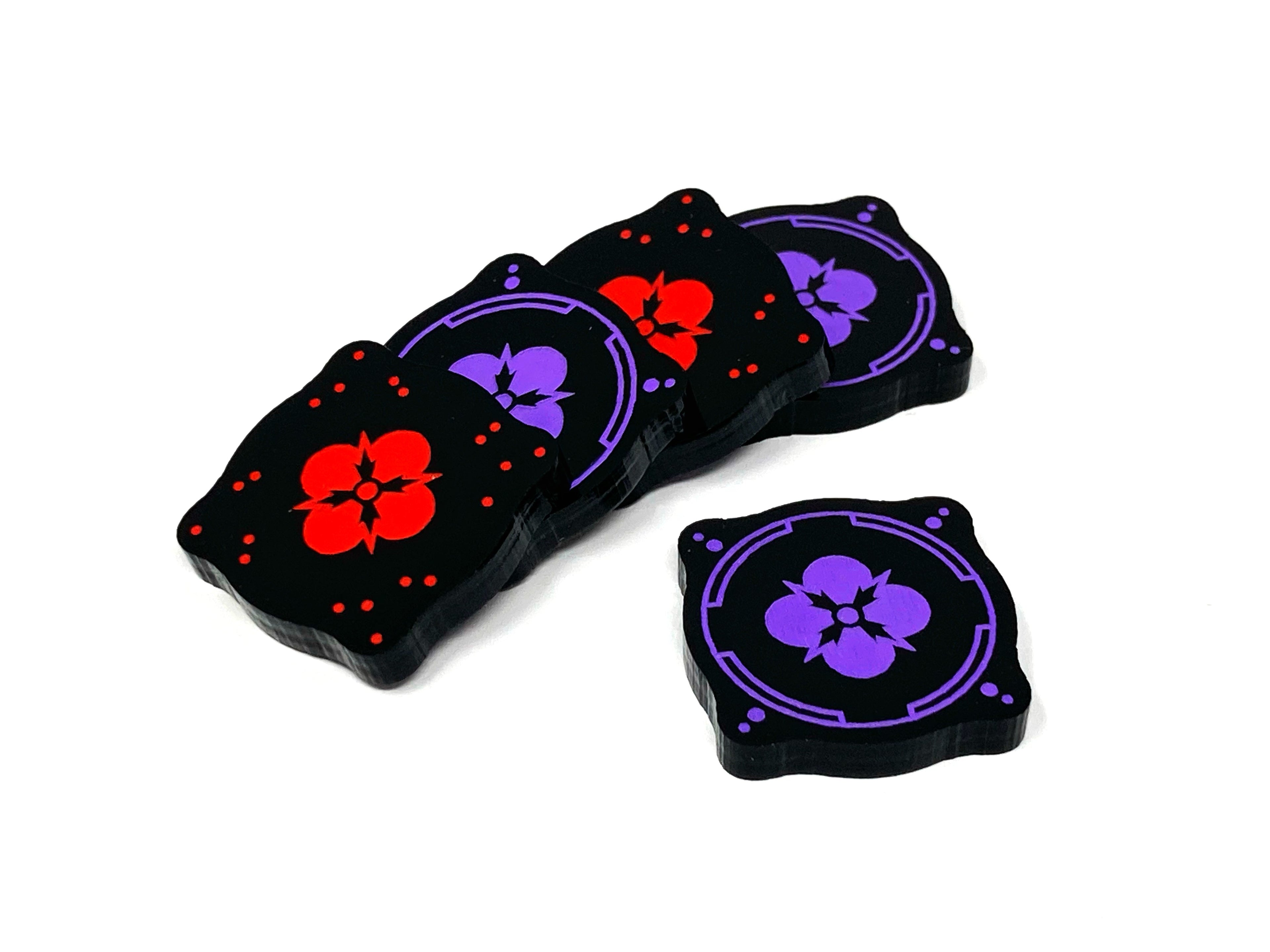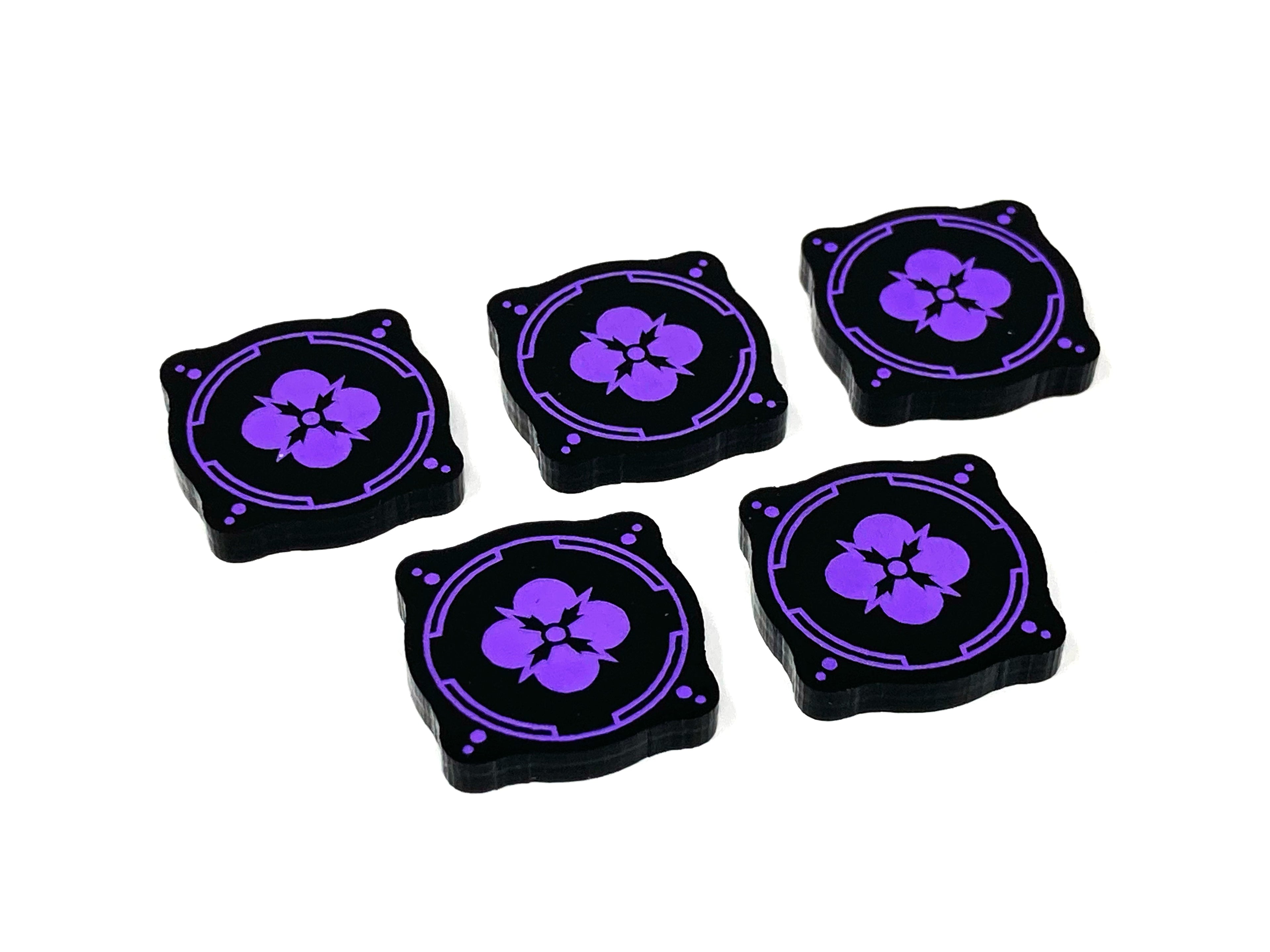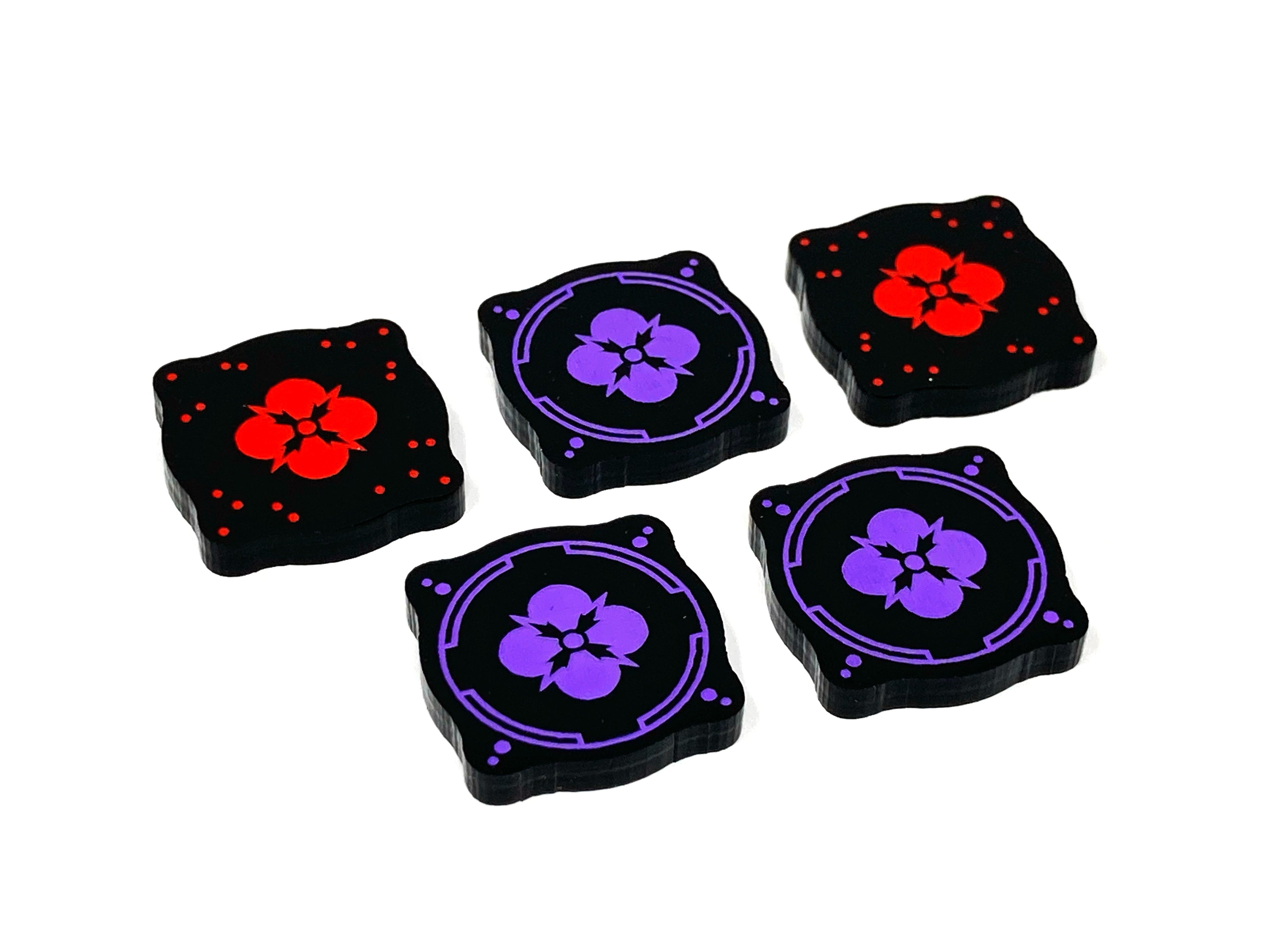 - 5 x Force tokens, laser etched and cut from opaque black acrylic and painted purple on one side and painted red on the reverse, measuring 20mm x 20mm.